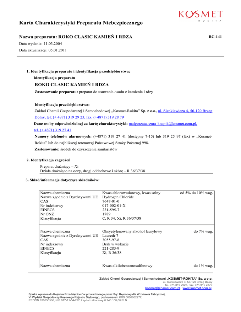 Karta Charakterystyki Preparatu Niebezpiecznego Nazwa preparatu: ROKO CLASIC KAMIEŃ I RDZA RC-141 Data wydania: 11.03.2004 Data aktualizacji: 05.01.2011 1. Identyfikacja preparatu i identyfikacja przedsiębiorstwa: Identyfikacja preparatu ROKO CLASIC KAMIEŃ I RDZA Zastosowanie preparatu: preparat do usuwania osadu z kamienia i rdzy Identyfikacja przedsiębiorstwa: Zakład Chemii Gospodarczej i Samochodowej „Kosmet-Rokita” Sp. z o.o., ul. Sienkiewicza 4, 56-120 Brzeg Dolny, tel: (+ 4871) 319 29 23, fax. (+4871) 319 28 79 Dane osoby odpowiedzialnej za kartę charakterystyki: [email protected], tel. (+ 4871) 319 27 41 Numery telefonów alarmowych: (+4871) 319 27 41 (dostępny 7-15) lub 319 25 97 (fax) w „KosmetRokita” lub do najbliższej terenowej Państwowej Straży Pożarnej 998. Zastosowanie: środek do czyszczenia sanitariatów 2. Identyfikacja zagrożeń Preparat drażniący – Xi Działa drażniąco na oczy, drogi oddechowe i skórę – R 36/37/38 3. Skład/informacje dotyczące składników: Nazwa chemiczna Nazwa zgodnie z Dyrektywami UE CAS Nr indeksowy EINECS Nr ONZ Klasyfikacja Kwas chlorowodorowy, kwas solny Hydrogen Chloride 7647-01-0 017-002-01-X 231-595-7 1789 C, R 34, Xi, R 36/37/38 od 5% do 10% wag. Nazwa chemiczna Nazwa zgodnie z Dyrektywami UE CAS Nr indeksowy EINECS Klasyfikacja Oksyetylenowany alkohol laurylowy Laureth-7 3055-97-8 Brak w wykazie 221-283-9 Xi, R 36/38 do 7% wag. Nazwa chemiczna Kwas alkilobenzenosulfonowy do 1% wag. Zakład Chemii Gospodarczej i Samochodowej „KOSMET-ROKITA” Sp. z o.o. ul. Sienkiewicza 4, 56-120 Brzeg Dolny tel. 071/319 2923, fax. 071/319 2879 [email protected], www.kosmet.com.pl, Spółka wpisana do Rejestru Przedsiębiorców prowadzonego przez Sąd Rejonowy dla Wrocławia Fabrycznej, VI Wydział Gospodarczy Krajowego Rejestru Sądowego, pod numerem KRS 0000002277, REGON 930850566, NIP 917-11-54-737, kapitał zakładowy 6 243 100,00 PLN. Karta Charakterystyki Preparatu Niebezpiecznego Nazwa preparatu: ROKO CLASIC KAMIEŃ I RDZA RC-141 Data wydania: 11.03.2004 Data aktualizacji: 05.01.2011 Nazwa zgodnie z Dyrektywami UE CAS Nr indeksowy EINECS Klasyfikacja Dodecylbenzenesulpfonic Acid 27176-87-0 Brak danych 248-289-4 C, R 22 - 34 4. Pierwsza pomoc Wdychanie Zapewnić dostęp świeżego powietrza. Utrzymywać drożność dróg oddechowych poprzez skręcenie głowy na bok, wygarniać śluz z jamy ustnej i gardła. Kontrolować czy nie zapada się język. Zapewnić pomoc lekarską. Kontakt ze skórą Natychmiast zdjąć zanieczyszczone ubranie. Oblaną skórę natychmiast zmyć dużą ilością wody, założyć jałowy opatrunek na oparzone miejsce. Kontakt z okiem Skażone oczy płukać natychmiast przy odwiniętych powiekach dużą ilością wody. Zapewnić natychmiastową pomoc okulisty. Połknięcie Podać poszkodowanemu do wypicia dużą ilość mleka lub wody. Nie podejmować prób neutralizacji. Zapewnić natychmiastową pomoc lekarską. 5. Postępowanie w przypadku pożaru Środki gaśnicze właściwe Stosować środki gaśnicze odpowiednie do otaczającego ognia. Środki gaśnicze niewłaściwe Nie są znane Szczególne zagrożenia W kontakcie z kwasami i w podwyższonej temperaturze może nastąpić wypryśnięcie gorącej żrącej cieczy, a w zetknięci z metalami lekkimi wydziela się wybuchowy wodór. W kontakcie z ciałem palnym może nastąpić samozapłon. Informacje dodatkowe Preparat niepalny. Środki ochrony indywidualnej dla strażaków Stosować maski przeciw gazowe z pochłaniaczem uniwersalnym. Zakład Chemii Gospodarczej i Samochodowej „KOSMET-ROKITA” Sp. z o.o. ul. Sienkiewicza 4, 56-120 Brzeg Dolny tel. 071/319 2923, fax. 071/319 2879 [email protected], www.kosmet.com.pl, Spółka wpisana do Rejestru Przedsiębiorców prowadzonego przez Sąd Rejonowy dla Wrocławia Fabrycznej, VI Wydział Gospodarczy Krajowego Rejestru Sądowego, pod numerem KRS 0000002277, REGON 930850566, NIP 917-11-54-737, kapitał zakładowy 6 243 100,00 PLN. Karta Charakterystyki Preparatu Niebezpiecznego Nazwa preparatu: ROKO CLASIC KAMIEŃ I RDZA RC-141 Data wydania: 11.03.2004 Data aktualizacji: 05.01.2011 6. Postępowanie w przypadku niezamierzonego uwolnienia do środowiska Indywidualne środki ostrożności Nie wdychać opar, pyłów. Środowiskowe środki ostrożności Nie dopuści do przedostania się do źródeł wody pitnej. Zlikwidować wyciek poprzez zamknięcie zaworów, uszczelnienie uszkodzonych opakowań. Procedura oczyszczania Rozlana ciecz obwałować, a następnie wypompować. Pozostałość przysypać niepalnym materiałem takim jak: zmielony wapień, kreda, piasek i zebrać do pojemników polietylenowych. Zanieczyszczoną powierzchnię zneutralizować mlekiem wapiennym i dokładnie spłukać wodą. 7. Postępowanie z preparatem i jego magazynowanie Postępowanie z preparatem Unikać kontaktu i wdychania opar. Nie jeść i nie pić na stanowisku pracy. Przechowywanie Przechowywać w szczelnych opakowaniach i suchych pomieszczeniach w temperaturze od 00 C do 350 C. Wymagania dotyczące magazynów i opakowań Kryte magazyny. Używać pojemników polietylenowych. 8. Kontrola narażenia i środki ochrony indywidualnej Normatywy higieniczne NDS (Polska) Chlorowodór: 5 mg/m3 NDSP 7mg/m3 Ochrona dróg oddechowych Stosować filtr klasy P2 przy powstawaniu opar kwasu. Ochrona oczu i twarzy Okulary ochronne przy wydostawaniu się kwaśnych opar Ochrona rąk Wymagane rękawice gumowe. Inny sprzęt ochronny Odpowiednie ubranie ochronne, buty robocze. Zakład Chemii Gospodarczej i Samochodowej „KOSMET-ROKITA” Sp. z o.o. ul. Sienkiewicza 4, 56-120 Brzeg Dolny tel. 071/319 2923, fax. 071/319 2879 [email protected], www.kosmet.com.pl, Spółka wpisana do Rejestru Przedsiębiorców prowadzonego przez Sąd Rejonowy dla Wrocławia Fabrycznej, VI Wydział Gospodarczy Krajowego Rejestru Sądowego, pod numerem KRS 0000002277, REGON 930850566, NIP 917-11-54-737, kapitał zakładowy 6 243 100,00 PLN. Karta Charakterystyki Pr