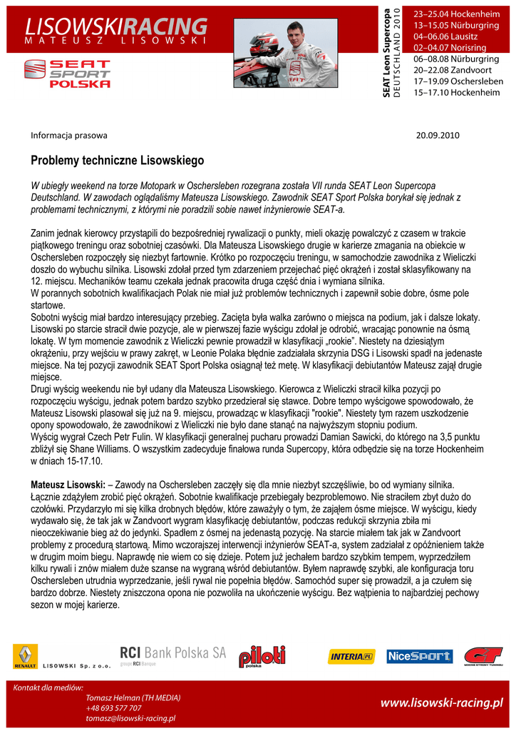 Informacja prasowa 20.09.2010 Problemy techniczne Lisowskiego W ubiegły weekend na torze Motopark w Oschersleben rozegrana została VII runda SEAT Leon Supercopa Deutschland. W zawodach oglądaliśmy Mateusza Lisowskiego. Zawodnik SEAT Sport Polska borykał się jednak z problemami technicznymi, z którymi nie poradzili sobie nawet inżynierowie SEAT-a. Zanim jednak kierowcy przystąpili do bezpośredniej rywalizacji o punkty, mieli okazję powalczyć z czasem w trakcie piątkowego treningu oraz sobotniej czasówki. Dla Mateusza Lisowskiego drugie w karierze zmagania na obiekcie w Oschersleben rozpoczęły się niezbyt fartownie. Krótko po rozpoczęciu treningu, w samochodzie zawodnika z Wieliczki doszło do wybuchu silnika. Lisowski zdołał przed tym zdarzeniem przejechać pięć okrążeń i został sklasyfikowany na 12. miejscu. Mechaników teamu czekała jednak pracowita druga część dnia i wymiana silnika. W porannych sobotnich kwalifikacjach Polak nie miał już problemów technicznych i zapewnił sobie dobre, ósme pole startowe. Sobotni wyścig miał bardzo interesujący przebieg. Zacięta była walka zarówno o miejsca na podium, jak i dalsze lokaty. Lisowski po starcie stracił dwie pozycje, ale w pierwszej fazie wyścigu zdołał je odrobić, wracając ponownie na ósmą lokatę. W tym momencie zawodnik z Wieliczki pewnie prowadził w klasyfikacji „rookie”. Niestety na dziesiątym okrążeniu, przy wejściu w prawy zakręt, w Leonie Polaka błędnie zadziałała skrzynia DSG i Lisowski spadł na jedenaste miejsce. Na tej pozycji zawodnik SEAT Sport Polska osiągnął też metę. W klasyfikacji debiutantów Mateusz zajął drugie miejsce. Drugi wyścig weekendu nie był udany dla Mateusza Lisowskiego. Kierowca z Wieliczki stracił kilka pozycji po rozpoczęciu wyścigu, jednak potem bardzo szybko przedzierał się stawce. Dobre tempo wyścigowe spowodowało, że Mateusz Lisowski plasował się już na 9. miejscu, prowadząc w klasyfikacji "rookie". Niestety tym razem uszkodzenie opony spowodowało, że zawodnikowi z Wieliczki nie było dane stanąć na najwyższym stopniu podium. Wyścig wygrał Czech Petr Fulin. W klasyfikacji generalnej pucharu prowadzi Damian Sawicki, do którego na 3,5 punktu zbliżył się Shane Williams. O wszystkim zadecyduje finałowa runda Supercopy, która odbędzie się na torze Hockenheim w dniach 15-17.10. Mateusz Lisowski: – Zawody na Oschersleben zaczęły się dla mnie niezbyt szczęśliwie, bo od wymiany silnika. Łącznie zdążyłem zrobić pięć okrążeń. Sobotnie kwalifikacje przebiegały bezproblemowo. Nie straciłem zbyt dużo do czołówki. Przydarzyło mi się kilka drobnych błędów, które zaważyły o tym, że zająłem ósme miejsce. W wyścigu, kiedy wydawało się, że tak jak w Zandvoort wygram klasyfikację debiutantów, podczas redukcji skrzynia zbiła mi nieoczekiwanie bieg aż do jedynki. Spadłem z ósmej na jedenastą pozycję. Na starcie miałem tak jak w Zandvoort problemy z procedurą startową. Mimo wczorajszej interwencji inżynierów SEAT-a, system zadziałał z opóźnieniem także w drugim moim biegu. Naprawdę nie wiem co się dzieje. Potem już jechałem bardzo szybkim tempem, wyprzedziłem kilku rywali i znów miałem duże szanse na wygraną wśród debiutantów. Byłem naprawdę szybki, ale konfiguracja toru Oschersleben utrudnia wyprzedzanie, jeśli rywal nie popełnia błędów. Samochód super się prowadził, a ja czułem się bardzo dobrze. Niestety zniszczona opona nie pozwoliła na ukończenie wyścigu. Bez wątpienia to najbardziej pechowy sezon w mojej karierze.