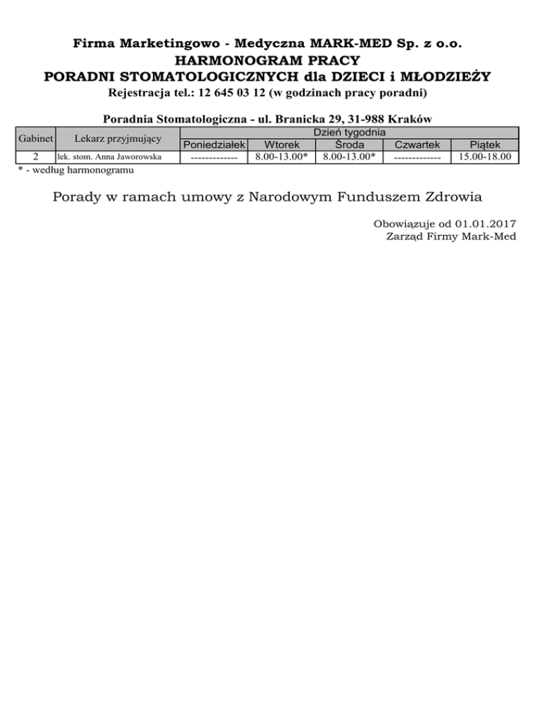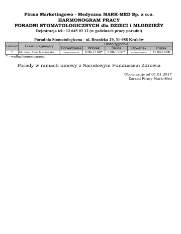 Firma Marketingowo - Medyczna MARK-MED Sp. z o.o. HARMONOGRAM PRACY PORADNI STOMATOLOGICZNYCH dla DZIECI i MŁODZIEŻY Rejestracja tel.: 12 645 03 12 (w godzinach pracy poradni) Poradnia Stomatologiczna - ul. Branicka 29, 31-988 Kraków Gabinet Lekarz przyjmujący lek. stom. Anna Jaworowska 2 * - według harmonogramu Dzień tygodnia Poniedziałek Wtorek Środa Czwartek 8.00-13.00* 8.00-13.00* ------------------------- Piątek 15.00-18.00 Porady w ramach umowy z Narodowym Funduszem Zdrowia Obowiązuje od 01.01.2017 Zarząd Firmy Mark-Med