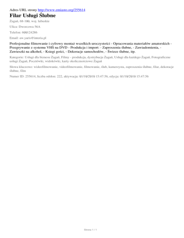 Adres URL strony http://www.emiasto.org/255614 Filar Usługi Ślubne Żagań, 68-100, woj. lubuskie Ulica: Dworcowa 56A Telefon: 600124286 Email: [email protected] Profesjonalne filmowanie i cyfrowy montaż wszelkich uroczystości - Opracowania materiałów amatorskich Przegrywanie z systemu VHS na DVD - Produkcja i import: - Zaproszenia ślubne, - Zawiadomienia, Zawieszki na alkohol, - Ksiegi gości, - Dekoracje samochodów, - Świece ślubne, itp. Kategorie: Usługi dla biznesu Żagań, Filmy - produkcja, dystrybucja Żagań, Usługi dla każdego Żagań, Fotograficzne usługi Żagań, Pocztówki, widokówki, karty okolicznościowe Żagań Słowa kluczowe: wideofilmowanie, videofilmowanie, filmowanie, ślub, kamerzysta, zaproszenia ślubne, filar, dekoracje ślubne, film Numer ID: 255614, liczba odsłon: 222, aktywacja: 01/10/2010 15:47:56, edycja: 01/10/2010 15:47:56 Strona 1 / 1
