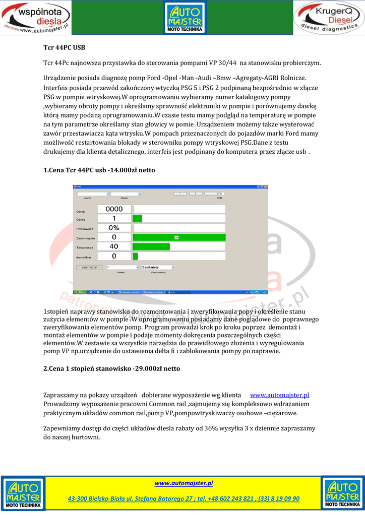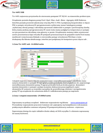 Tcr 44PC USB Tcr 44Pc najnowsza przystawka do sterowania pompami VP 30/44 na stanowisku probierczym. Urządzenie posiada diagnozę pomp Ford -Opel -Man -Audi –Bmw –Agregaty-AGRI Rolnicze. Interfeis posiada przewód zakończony wtyczką PSG 5 i PSG 2 podpinaną bezpośrednio w złącze PSG w pompie wtryskowej.W oprogramowaniu wybieramy numer katalogowy pompy ,wybieramy obroty pompy i określamy sprawność elektroniki w pompie i porównujemy dawkę którą mamy podaną oprogramowaniu.W czasie testu mamy podgląd na temperaturę w pompie na tym parametrze określamy stan głowicy w pomie .Urządzeniem możemy także wysterować zawór przestawiacza kąta wtrysku.W pompach przeznaczonych do pojazdów marki Ford mamy możliwość restartowania blokady w sterowniku pompy wtryskowej PSG.Dane z testu drukujemy dla klienta detalicznego, interfeis jest podpinany do komputera przez złącze usb . 1.Cena Tcr 44PC usb -14.000zł netto 1stopień naprawy stanowisko do rozmontowania i zweryfikowania popy i określenie stanu zużycia elementów w pompie .W oprogramowaniu posiadamy dane poglądowe do poprawnego zweryfikowania elementów pomp. Program prowadzi krok po kroku poprzez demontaż i montaż elementów w pompie i podaje momenty dokręcenia poszczególnych części elementów.W zestawie sa wszystkie narzędzia do prawidłowego złożenia i wyregulowania pomp VP np.urządzenie do ustawienia delta fi i zablokowania pompy po naprawie. 2.Cena 1 stopień stanowisko -29.000zł netto Zapraszamy na pokazy urządzeń dobierane wyposażenie wg klienta www.automajster.pl Prowadzimy wyposażenie pracowni Common rail ,zajmujemy się kompleksowo wdrażaniem praktycznym układów common rail,pomp VP,pompowtryskiwaczy osobowe –ciężarowe. Zapewniamy dostęp do części układów diesla rabaty od 36% wysyłka 3 x dziennie zapraszamy do naszej hurtowni. www.automajster.pl 43-300 Bielsko-Biała ul. Stefana Batorego 27 ; tel. +48 602 243 821 , (33) 8 19 09 90