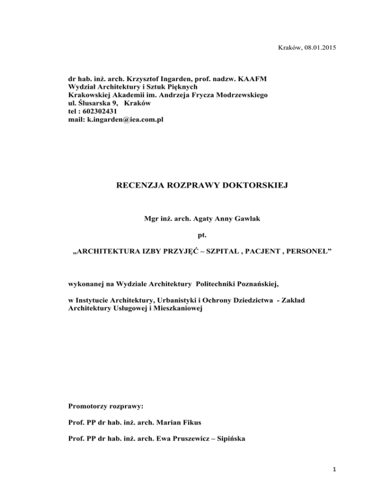 Kraków, 08.01.2015 dr hab. inż. arch. Krzysztof Ingarden, prof. nadzw. KAAFM Wydział Architektury i Sztuk Pięknych Krakowskiej Akademii im. Andrzeja Frycza Modrzewskiego ul. Ślusarska 9, Kraków tel : 602302431 mail: [email protected] RECENZJA ROZPRAWY DOKTORSKIEJ Mgr inż. arch. Agaty Anny Gawlak pt. „ARCHITEKTURA IZBY PRZYJĘĆ – SZPITAL , PACJENT , PERSONEL” wykonanej na Wydziale Architektury Politechniki Poznańskiej, w Instytucie Architektury, Urbanistyki i Ochrony Dziedzictwa - Zakład Architektury Usługowej i Mieszkaniowej Promotorzy rozprawy: Prof. PP dr hab. inż. arch. Marian Fikus Prof. PP dr hab. inż. arch. Ewa Pruszewicz – Sipińska 1 1. Podstawa opracowania recenzji: a/ umowa o dzieło dot. wykonania recenzji nr 20/2014 z dn. 03/11/2014 roku. b/ egzemplarz rozprawy. 2. Struktura pracy. Rozprawa została przedstawiona do recenzji w formie książki formatu A4, zawierającej 164 strony. Zawiera 18 rozdziałów, w tym: 12 rozdziałów z tekstem autorskim i 6 rozdziałów końcowych uzupełniających – zawierających spisy tabel, rycin , wykresów, bibliografię, wzory formularzy badawczych itp., a także streszczenie rozprawy po polsku i angielsku, umieszczone na początku książki. Poszczególne rozdziały to : 1. Wstęp 2. Dane bazowe. Etymologia i definicje 3. Psychologiczne i socjologiczne aspekty w projektowaniu izby przyjęć szpitala pediatrycznego. Najważniejsze osiągnięcia naukowe w latach 2000-2014. 4. Uwarunkowania legislacyjne a projekt szpitala. 5. Metoda oceny jakości POE w procesie modernizacji. Partycypacja społeczna w projektowaniu szpitala. 6. Evidence Based Design a projektowanie szpitali. 7. Metodologia 8. Specjalistyczny Zakład Opieki Zdrowotnej im. B. Krysiewicza w Poznaniu. 9. Badanie 01 (ocena satysfakcji) wg Ankieta 01 10. Badanie 02 (ocena oczekiwań) wg Ankieta 02 11. Wnioski 12. Podsumowanie Autorka na początku wprowadza nas w zagadnienia projektowania szpitali , w szczególności izby przyjęć i przedstawia stan badań tematu po roku 2000. Przedstawia metody oceny jakości projektu (POE) i wspomina o roli partycypacji społecznej w procesie programowania i zbierania materiału badawczego etapu przedprojektowego. Następnie omawia metodę Evidence Based Design, jako metodę postulowaną przez autorkę w podejmowaniu decyzji projektowych, szczególnie istotnej w fazie wstępnej – programowania. W dalszej kolejności autorka przedstawia metodologię związaną z planowanymi badaniami ankietowymi i sposobami ich analiz. Następnie przedstawione są wyniki ankiet , wraz z ich omówieniem. Na końcu sformułowane są wnioski wynikające z pracy. Zdaniem recenzenta struktura pracy jest czytelna i poprawna. 2 3. Problematyka badawcza pracy: Rozdział 1 - Wstęp. Autorka przedstawia swoją tematykę badawczą we wstępie pracy. Jest nią podjęcie próby badania relacji pomiędzy przestrzenią pomieszczeń szpitalnych, konkretnie izby przyjęć , a jej postrzeganiem przez użytkowników różnych grup wiekowych i płci, co ma przełożenie na stopień satysfakcji użytkowników z pobytu w tych przestrzeniach i dalej, na proces leczenia i rekonwalescencji. Jest to więc próba opracowania narzędzia badawczego dla stworzenia narzędzi pomocniczych do podejmowania właściwych decyzji projektowych w przygotowaniu wytycznych do programowania i projektowania tych przestrzeni. Jest to także kolejne poruszenie tematu racjonalizacji powszechnie uznanej i oczywistej tezy o głębokim związku zachodzącym pomiędzy jakością przestrzeni architektonicznej a psychiką i psychomotoryką odbiorcy. Znalezienie tych właściwych i naukowo potwierdzonych narzędzi projektowych jest z pewnością cenną metodą pomocniczą przy podejmowaniu właściwych decyzji przy projektowaniu szpitali. Autorka wymienia kraje i ośrodki badawcze w Europie i na świecie które prowadzą badania tego typu i zaznacza iż w Polsce jest to temat nowy, szczególnie w odniesieniu do ośrodków pediatrycznych (str.16). Autorka definiuje na wstępie tezę , którą pragnie zweryfikować za pomocą badań ankietowych i ich odpowiedniej interpretacji. Tezę ową przedstawia w sposób następujący: „Architektura Izby Przyjęć szpitala pediatrycznego kształtuje komfort i samopoczucie pacjentów, w kontekście uwarunkowań socjo – demograficznych i innych, takich jak płeć pacjenta, czas oczekiwania na rejestrację i badanie lekarskie oraz miejsce prowadzenia badań jakościowych.” (str.19). Ponadto, w uzupełnieniu głównej hipotezy roboczej, w rozdziale niniejszym autorka określiła dodatkowe cele badawcze, które pragnie rozwinąć w dalszych rozdziałach pracy , są to: a. Określenie wpływu środowiska zbudowanego na pacjentów (aspekty psychologiczne i socjologiczne); b. Sformułowanie czynników funkcjonalno – przestrzennych generujących satysfakcję pacjenta (na podstawie literatury , w nawiązaniu do metody Evidence Based Design); c. Wykazanie że istnieje oczywiste powiązanie pomiędzy satysfakcją pacjenta , jego lojalnością do ośrodka zdrowia a jakością środowiska zbudowanego; d. Wykazanie zależności, że satysfakcja pacjenta zależna jest od czynników architektoniczno – przestrzennych oraz innych zmiennych jak: wiek, płeć, pora dnia, etc.; e. Wykazanie różnicy pomiędzy potrzebami przestrzennymi pacjentów szpitala, a oczekiwaniami potencjalnych pacjentów, względem rozwiązań funkcjonalno – przestrzennych. 3 Rozdział 2 – Dane bazowe. Etymologia i definicje. Autorka wymienia w nim kryteria klasyfikacji szpitali, podaje definicje pojęć związanych ze szpitalnictwem i zastosowanymi w pracy skrótami, podaje listę organizacji rozwijających metodologię projektowania szpitali na świecie; przedstawia kompaktową historię szpitalnictwa na świecie i w Polsce. Jest to zestawienie bardzo dobrze porządkujące ważniejsze terminy wprowadzone w pracy. Rozdział 3 – Psychologiczne i socjologiczne aspekty w projektowaniu iz