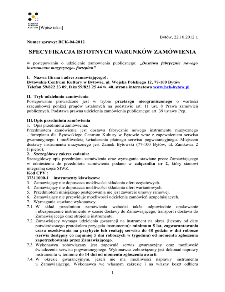 [Wpisz tekst] Bytów, 22.10.2012 r. Numer sprawy: BCK-04-2012 SPECYFIKACJA ISTOTNYCH WARUNKÓW ZAMÓWIENIA w postępowaniu o udzielenie zamówienia publicznego: „Dostawa fabrycznie nowego instrumentu muzycznego- fortepian”. I. Nazwa (firma i adres zamawiającego): Bytowskie Centrum Kultury w Bytowie, ul. Wojska Polskiego 12, 77-100 Bytów Telefon 59/822 23 09, faks 59/822 25 44 w. 40, strona internetowa www.bck-bytow.pl II. Tryb udzielania zamówienia Postępowanie prowadzone jest w trybie przetargu nieograniczonego o wartości szacunkowej poniżej progów ustalonych na podstawie art. 11 ust. 8 Prawa zamówień publicznych. Podstawa prawna udzielenia zamówienia publicznego: art. 39 ustawy Pzp. III.Opis przedmiotu zamówienia 1. Opis przedmiotu zamówienia: Przedmiotem zamówienia jest dostawa fabrycznie nowego instrumentu muzycznego - fortepianu dla Bytowskiego Centrum Kultury w Bytowie wraz z zapewnieniem serwisu gwarancyjnego i możliwością świadczenia płatnego serwisu pogwarancyjnego. Miejscem dostawy instrumentu muzycznego jest Zamek Bytowski (77-100 Bytów, ul. Zamkowa 2 (I piętro). 2. Szczegółowy zakres zadania: Szczegółowy opis przedmiotu zamówienia oraz wymagania stawiane przez Zamawiającego w odniesieniu do przedmiotu zamówienia podano w załączniku nr 2, który stanowi integralną część SIWZ. Kod CPV : 37311000-1 instrumenty klawiszowe 3. Zamawiający nie dopuszcza możliwości składania ofert częściowych. 4. Zamawiający nie dopuszcza możliwości składania ofert wariantowych. 5. Przedmiotem niniejszego postępowania nie jest zawarcie umowy ramowej. 6. Zamawiający nie przewiduje możliwości udzielenia zamówień uzupełniających. 7. Wymagania stawiane wykonawcy: 7.1. W skład przedmiotu zamówienia wchodzi także odpowiednie opakowanie i ubezpieczenie instrumentu w czasie dostawy do Zamawiającego, transport i dostawa do Zamawiającego oraz strojenie instrumentu. 7.2. Zamawiający wymaga udzielenia gwarancji na instrument na okres (liczony od daty potwierdzonego protokołem przyjęcia instrumentu): minimum 5 lat, zagwarantowania czasu oczekiwania na przybycie lub reakcję serwisu do 48 godzin w dni robocze (serwis dostępny co najmniej 5 dni roboczych w tygodniu) od momentu zgłoszenia zapotrzebowania przez Zamawiającego. 7.3. Wykonawca zobowiązany jest zapewnić serwis gwarancyjny oraz możliwość świadczenia serwisu pogwarancyjnego. Wykonawca zobowiązany jest dokonać naprawy instrumentu w terminie do 14 dni od momentu zgłoszenia awarii. 7.4. W okresie gwarancyjnym, jeżeli nie ma możliwości naprawy instrumentu u Zamawiającego, Wykonawca we własnym zakresie i na własny koszt odbiera 1 [Wpisz tekst] instrument i dostarcza do serwisu lub Zamawiający, po uzgodnieniu z Wykonawcą, samodzielnie dostarcza instrument do Wykonawcy lub do serwisu (w miejsce wskazane przez Wykonawcę) na koszt Wykonawcy. W okresie pogwarancyjnym Zamawiający na własny koszt dostarcza instrument do Wykonawcy lub do serwisu (w miejsce wskazane przez Wykonawcę). 7.5. Po naprawie Wykonawca ma obowiązek dostarczyć instrument do Zamawiającego. 7.6. Koszty transportu (związane z naprawą gwarancyjną instrumentu) oraz związane z tym ryzyko utraty lub zniszczenia instrumentu ponosi Wykonawca. 7.7. Wykonawca jest odpowiedzialny za jakość, zgodność z warunkami technicznymi i jakościowymi opisanymi dla przedmiotu zamówienia. 7.8. Wymagana jest należyta staranność przy realizacji zobowiązań umowy. 7.9. Jeżeli w opisie przedmiotu zamówienia znajdują się jakiekolwiek znaki towarowe, patenty czy inne prawa zastrzeżone lub wyłączne, bądź określone jest pochodzenie instrumentu lub jego części- należy przyjąć, że Zamawiający, ze względu na specyfikę przedmiotu zamówienia, podał taki opis ze wskazaniem na typ instrumentu i dopuszcza składanie ofert równoważnych pod względem artystycznym, wykonawczym, funkcjonalnym, o parametrach techniczno- użytkowych nie gorszych niż te podane w opisie przedmiotu zamówienia (podstawa prawna art. 29 ust. 3 ustawy Prawo zamówień publicznych). W przypadku złożenia oferty zawierającej zastosowanie rozwiązań równoważnych do opisywanych przez Zamawiającego, obowiązek udowodnienia ich równoważności z wymaganiami wskazanymi przez Zamawiającego, leży po stronie Wykonawcy. 7.10. Za równoważny, w stosunku do wskazanego instrumentu muzycznego, Zamawiający uzna taki, oferowany przez Wykonawcę instrument, który pod względem artystycznym, funkcjonalnym, technicznym i użytkowym będzie równoważny do opisanego w przedmiocie zamówienia. Za równoważne pod względem: a) artystycznym, wykonawczym i funkcjonalnym- Zamawiający rozumie tak wykonany instrument, który umożliwi na etapie jego eksploatacji osiągnięcie zakładanych walorów artystycznych i dźwiękowych w trakcie wykonywania utworów muzycznych, takich jak przy użyciu fortepianów o parametrach referencyjnych, b) technicznym i użytkowym- Zamawiający rozumie tak wykonany instrument, który posiada równoważną pod względem technicznym budowę i wyposażenie co zawarty w opisie przedmiotu zamówienia instrument, o podanych parametrach referencyjnych. 7.11. Określenie przez wykonawcę telefonów kontaktowych i numerów fax oraz innych ustaleń niezbędnych dla sprawnego i terminowego wykonania zamówienia. IV. Termin wykonania zamówienia Zamawiający ustala czas realizacji zamówienia do 14.11.2012 r. V. Opis warunków udziału w postępowaniu oraz opis sposobu dokonywania oceny spełnienia tych warunków. 1. O udzielenie zamówienia mogą ubiegać się wykonawcy, którzy spełniają warunki dotyczące: 1.1. posiadania uprawnień do wykonywania określonej działalności lub czynności, jeżeli przepisy prawa nakładają obowiązek ich posiadania, 1.2. posiadania wiedzy i doświadczenia w postaci wykonania co najmniej jednej dostawy instrumentu, bądź instrumentów muzycznych, w okresie ostatnich trzech lat przed 2 [Wpisz tek