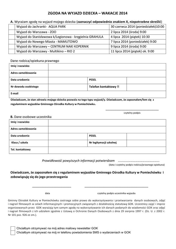 ZGODA NA WYJAZD DZIECKA – WAKACJE 2014 A. Wyrażam zgodę na wyjazd mojego dziecka (zaznaczyć odpowiednio znakiem X, niepotrzebne skreślić) Wyjazd do Jachranki- AQUA PARK 30 czerwca 2014 (poniedziałek)10:00 Wyjazd do Warszawa - ZOO Wyjazd do Stanisławowa k/Legionowa - kręgielnia GRAHULA Wyjazd do Nowego Miasta - MAMUTOWO Wyjazd do Warszawy – CENTRUM NAKI KOPERNIK Wyjazd do Warszawy - Multikino – RIO 2 2 lipca 2014 (środa) 9:00 4 lipca 2014 (piątek) 10:30 7 lipca 2014 (poniedziałek) 9:00 9 lipca 2014 (środa) 9:00 11 lipca 2014 (piątek) ok. 9:00 Dane rodzica/opiekuna prawnego Imię i nazwisko Adres zameldowania Data urodzenia PESEL Nr dowodu osobistego Telefon kontaktowy !! E-mail Oświadczam, że stan zdrowia mojego dziecka pozwala na tego typu wyjazd/y. Oświadczam, że zapoznałam/łem się z regulaminem wyjazdów Gminnego Ośrodka Kultury w Pomiechówku . ______________________________ czytelny podpis B. Dane osobowe uczestnika Imię i nazwisko Adres zameldowania Data urodzenia PESEL Klasa / szkoła Nr legitymacji szkolnej Tel. kontaktowy Prawidłowość powyższych informacji potwierdzam …………………………………………… (data i czytelny podpis rodzica/prawnego opiekuna) Oświadczam, że zapoznałem się z regulaminem wyjazdów Gminnego Ośrodka Kultury w Pomiechówku i zobowiązuję się do jego przestrzegania ______________________ data ____________________________________ czytelny podpis uczestnika wyjazdu Gminny Ośrodek Kultury w Pomiechówku zastrzega sobie prawo do wykorzystywania i przetwarzania danych osobowych, zdjęć i nagrań filmowych w celach informacyjnych i promocyjnych związanych z działalnością statutową GOK. Uczestnicy zajęć i imprez organizowanych przez GOK wyrażają tym samym zgodę na wykorzystywanie ich danych podanych do wiadomości GOK oraz zdjęć i nagrań filmowych z ich udziałem zgodnie z Ustawą o Ochronie Danych Osobowych z dnia 29 sierpnia 1997 r. (Dz. U. z 2002 r. Nr 101 poz. 926 ze zm.). Chciałbym otrzymywać na mój adres mailowy newsletter GOK Chciałbym otrzymywać na mój nr telefonu powiadomienia SMS o wydarzeniach w GOK