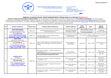 Nasz znak: SCE.52/7/14 MIESIĘCZNY KALENDARZ SZKOLEŃ I IMPREZ SAMORZĄDOWEGO CENTRUM EDUKACJI W TARNOWIE WRZESIEŃ 2014 R. Doradcy metodyczni zapraszają na zajęcia otwarte – po wcześniej wcześniejszym ustaleniu terminu z doradca metodycznym oraz konsultacje indywidualne – podczas dyżurów metodycznych. Szczegółowe informacje o dyżurach doradców metodycznych znajdziecie Państwo pod adresem http://www.sce.pl/?strona=00348&popup=true //www.sce.pl/?strona=00348&popup=true Informacje o ewentualnej zmianie terminu lub miejsca danego szkolenia są na bieżąco aktualizowane na stronie internetowej SCE w Tarnowie (www.sce.pl), ( dlatego też przed przyjazdem na wybrana formę prosimy o sprawdzenie podanych danych Lp. 1. 2. 3. Doradca metodyczny CIUKAJ MAŁGORZATA wychowanie przedszkolne Przedszkole Publiczne w Żabnie Tel. 14-645-75-29 e-mail: [email protected] Dyżur w SCE w Tarnowie w każdy poniedziałek w godz. 11:00 -12:00 DRWAL BEATA edukacja wczesnoszkolna Zespół Szkół Publicznych w Tarnowcu Tel. 14-679-44-14 Tel. kontaktowy: 501-510-489 e-mail: [email protected] Dyżur w SCE w Tarnowie w każdy piątek w godz. 10:30 – 11:30 GAWRON HALINA Geografia Gimnazjum nr II w Tuchowie Tel.14-652-52-20 Tel. kontaktowy: 669 075 324 e-mail: [email protected] Dyżur w SCE w Tarnowie w czwartek w godz. 10:00-12:00 Numer formy Tematyka spotkań/rodzaj formy Adresaci spotkania 530/2-10/14 Konstruowanie programów własnych – konsultacja zespołowa. Nauczyciele Przedszkola Publicznego w Żabnie 530/2-13/14 530/3-11/14 Metoda projektu w edukacji elementarnej – konsultacja zespołowa. Nauczyciele wychowania przedszkolnego. Termin spotkania Godz. Data i godzina i miejsce spotkania zostaną podane w terminie późniejszym. Miejsce spotkania Przedszkole Publiczne w Żabnie Data i godzina i miejsce spotkania zostaną podane w terminie późniejszym. Opracowanie regulaminu oraz dobór literatury do konkursu przyrodniczego uczniów klas II-III gminy Ryglice. Nauczyciele klas I – III gminy Ryglice. 23.09.2014 15:00 – 18:00 Szkoła Podstawowa Lubcza Nauczyciel uczyciel na starcie – warsztaty metodyczne 10 godzinne – cz. I Oferta bezpłatna dla nauczycieli gmin zrzeszonych Dla nauczycieli gmin niezrzeszonych 80 zł. Nauczyciele zainteresowani formą 04.09.2014 14:00 – 16:15 SCE Tarnów, Al. Solidarności 5-9, pok. 403 Nauczyciel na starcie – warsztaty metodyczne 10 godzinne – cz. II Nauczyciele zgłoszeni na formę 11.09.2014 14:00 – 16:15 SCE Tarnów, Al. Solidarności 5-9, pok. 403 Nauczyciel na starcie – warsztaty metodyczne 10 godzinne – cz. III Nauczyciele zgłoszeni na formę 18.09.2014 14:00 – 16:15 SCE Tarnów, Al. Solidarności 5-9, pok. 403 Nauczyciel na starcie – warsztaty metodyczne 10 godzinne – cz. IV Nauczyciele zgłoszeni na formę 25.09.2014 14:00 – 16:15 SCE Tarnów, Al. Solidarności 5-9, pok. 403 530/5-14/14 Lp. 4. 6. 7. Doradca metodyczny MARIA GRYGIEL Fizyka Gimnazjum Nr 1 w Dąbrowie Tarnowskiej Tel. 14 655 77 87 Tel. kontaktowy: 781 541 005 e-mail: [email protected] Dyżur w SCE w Tarnowie zostanie podany w późniejszym terminie. NADOLNIK IZABELA edukacja wczesnoszkolna Zespół Szkół w Porąbce Uszewskiej Tel.14-665-67-30 Tel. kontaktowy: 502-139-574 e-mail: [email protected] Dyżur w SCE w Tarnowie w każdy wtorek w godzinach 11:00-14:00 ROBAK MAREK Wychowanie fizyczne Zespół Szkół Licealnych i Technicznych w Wojniczu Tel. 14-679-00-05 Tel. Kontaktowy: 604-462-012 e-mail: [email protected] Dyżur w SCE w Tarnowie w każdy wtorek w godzinach 15:30-16:30 Numer formy Tematyka spotkań/rodzaj formy Adresaci spotkania 530/13-1/14 Uczymy myślenia- przykładowe zadania zamknięte na lekcje z przedmiotów przyrodniczych. Konferencja metodyczna. Nauczyciele przedmiotów przyrodniczych w szkołach podstawowych i w gimnazjum 530/13-2/14 „Jak uatrakcyjnić lekcje powtórzeniowe?” –pokaz lekcji z wykorzystaniem gier dydaktycznych, symulacji komputerowych i doświadczeń. Temat lekcji- „Co wiem o pracy, mocy i energii mechanicznej?”. Prowadząca lekcję –mgr Maria Grygiel. Lekcja otwarta. Nauczyciele przedmiotów przyrodniczych w szkołach podstawowych i w gimnazjum. 530/13-3/14 Jak zorganizować szkolną wycieczkę zagraniczną? - konsultacje. Zainteresowani nauczyciele- po uprzednim zgłoszeniu. 530/13-4/14 „Tworzymy bazę pomocy dydaktycznych w swojej pracowni”. Zjawiska cieplne - doświadczenia uczniowskie i pokazy nauczycielskie. Zajęcia warsztatowe Nauczyciele przedmiotów przyrodniczych w szkołach podstawowych i w gimnazjum. 530/13-5/14 „Tworzymy bazę pomocy dydaktycznych w swojej pracowni” Zjawiska cieplne - przykłady wykorzystania internetowych portali edukacyjnych oraz dostępnych multimediów wspomagających nauczanie przedmiotów przyrodniczych. Nauczyciele przedmiotów przyrodniczych w szkołach podstawowych i w gimnazjum. 530/7-8/14 Praca z uczniem sześcioletnim – nowe wyzwania dla nauczyciela – warsztaty metodyczne 16 - godzinne dwudniowe. Oferta płatna: nauczyciele gmin zrzeszonych 120 zl, nauczyciele gmin niezrzeszonych 150 zł. 530/9-14/14 Analiza potrzeb edukacyjnych i metodycznych nauczycieli wychowania fizycznego szkół ponadgimnazjalnych powiatu tarnowskiego w roku szkolnym 2014-2015 – zespół samokształceniowy. Nauczyciele edukacji wczesnoszkolnej , wychowawcy świetlic i wszyscy zainteresowani. Nauczyciele szkół ponadgimnazjalnych Powiatu Tarnowskiego. Termin spotkania 04.09.2014 Godz. 14: 00 -16:00 Data i godzina i miejsce spotkania zostaną podane w terminie późniejszym. 11.09.2014 16.09.2014 18.09.2014 14: 00 -16:00 14: 00 -16:00 14: 00 -16:00 Data i godzina spotkania zostaną podane w terminie późniejszym po zebraniu grupy. Termin i godzina spotkania w uzgodnieniu z komisją nauczycieli wychowania fizycznego szkół ponadgimnazjalnych. Miejsce spotkania Dąbrowa Tarnowska Gimnazjum nr 1 Zaręby 22 Dąbrowa Tarnowska Gimnazjum nr 1 Zaręby 22 Dąbrowa Tarnowska Gimnazjum nr 1 Za
