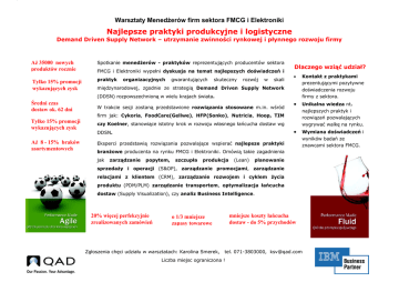Warsztaty Menedżerów firm sektora FMCG i Elektroniki Najlepsze praktyki produkcyjne i logistyczne Demand Driven Supply Network – utrzymanie zwinności rynkowej i płynnego rozwoju firmy Aż 35000 nowych produktów rocznie Spotkanie menedżerów - praktyków reprezentujących producentów sektora Tylko 15% promocji wykazujących zysk praktyk FMCG i Elektroniki wypełni dyskusja na temat najlepszych doświadczeń i organizacyjnych gwarantujących skuteczny rozwój w skali Dlaczego wziąć udział? • Kontakt z praktykami prezentującymi pozytywne doświadczenia rozwoju firmy z sektora. • Unikalna wiedza nt. najlepszych praktyk i rozwiązań pozwalających wygrywać walkę na rynku. • Wymiana doświadczeń i wyników badań ze znawcami sektora FMCG. międzynarodowej, zgodnie ze strategią Demand Driven Supply Network (DDSN) rozpowszechnioną w wielu krajach świata. Średni czas dostaw ok. 62 dni Tylko 15% promocji wykazujących zysk Aż 8 - 15% braków asortymentowych W trakcie sesji zostaną przedstawione rozwiązania stosowane m.in. wśród firm jak: Cykoria, FoodCare(Gellwe), HFP(Sonko), Nutricia, Hoop, TIM czy Koelner, stanowiące istotny krok w rozwoju własnego łańcucha dostaw wg DDSN. Eksperci przedstawią rozwiązania pozwalające wspierać najlepsze praktyki branżowe producenta na rynku FMCG i Elektroniki. Omówią takie zagadnienia jak zarządzanie popytem, szczupła produkcja (Lean) planowanie sprzedaży i operacji (S&OP), zarządzanie promocjami, zarządzanie relacjami z klientem (CRM), zarządzanie rozwojem i cyklem życia produktu (PDM/PLM) zarządzanie transportem, optymalizacja łańcucha dostaw (Supply Visualization), czy analiz Business Intelligence. 20% więcej perfekcyjnie zrealizowanych zamówień mniejsze koszty łańcucha dostaw - do 5% przychodów o 1/3 mniejsze zapasy towarowe Zgłoszenia chęci udziału w warsztatach: Karolina Smerek, tel. 071-3803000, [email protected] Liczba miejsc ograniczona ! Warsztaty Menedżerów firm sektora FMCG i Elektroniki Najlepsze praktyki produkcyjne i logistyczne Demand Driven Supply Network – utrzymanie zwinności rynkowej i płynnego rozwoju firmy Zamiast liniowego łańcucha zdefiniowanego i ograniczonego poprzez ustalone zdolności produkcyjne, obiekty i procesy, DDSN wyraża się dynamiczną interakcją pomiędzy popytem, rozwojem i dostawami. “The Handbook for Demand Driven”, AMR Research, July2005 Zgłoszenia chęci udziału w warsztatach: Karolina Smerek, tel. 071-3803000, [email protected] Liczba miejsc ograniczona !