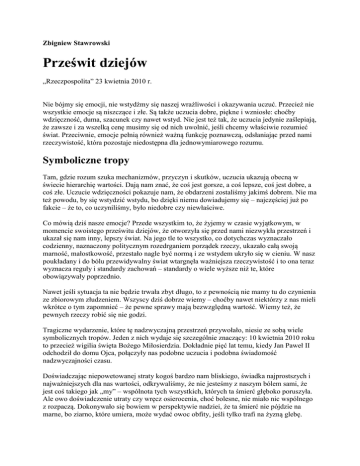 Zbigniew Stawrowski Prześwit dziejów „Rzeczpospolita” 23 kwietnia 2010 r. Nie bójmy się emocji, nie wstydźmy się naszej wrażliwości i okazywania uczuć. Przecież nie wszystkie emocje są niszczące i złe. Są także uczucia dobre, piękne i wzniosłe: choćby wdzięczność, duma, szacunek czy nawet wstyd. Nie jest też tak, że uczucia jedynie zaślepiają, że zawsze i za wszelką cenę musimy się od nich uwolnić, jeśli chcemy właściwie rozumieć świat. Przeciwnie, emocje pełnią również ważną funkcję poznawczą, odsłaniając przed nami rzeczywistość, która pozostaje niedostępna dla jednowymiarowego rozumu. Symboliczne tropy Tam, gdzie rozum szuka mechanizmów, przyczyn i skutków, uczucia ukazują obecną w świecie hierarchię wartości. Dają nam znać, że coś jest gorsze, a coś lepsze, coś jest dobre, a coś złe. Uczucie wdzięczności pokazuje nam, że obdarzeni zostaliśmy jakimś dobrem. Nie ma też powodu, by się wstydzić wstydu, bo dzięki niemu dowiadujemy się – najczęściej już po fakcie – że to, co uczyniliśmy, było niedobre czy niewłaściwe. Co mówią dziś nasze emocje? Przede wszystkim to, że żyjemy w czasie wyjątkowym, w momencie swoistego prześwitu dziejów, że otworzyła się przed nami niezwykła przestrzeń i ukazał się nam inny, lepszy świat. Na jego tle to wszystko, co dotychczas wyznaczało codzienny, naznaczony politycznym rozedrganiem porządek rzeczy, ukazało całą swoją marność, małostkowość, przestało nagle być normą i ze wstydem ukryło się w cieniu. W nasz poukładany i do bólu przewidywalny świat wtargnęła ważniejsza rzeczywistość i to ona teraz wyznacza reguły i standardy zachowań – standardy o wiele wyższe niż te, które obowiązywały poprzednio. Nawet jeśli sytuacja ta nie będzie trwała zbyt długo, to z pewnością nie mamy tu do czynienia ze zbiorowym złudzeniem. Wszyscy dziś dobrze wiemy – choćby nawet niektórzy z nas mieli wkrótce o tym zapomnieć – że pewne sprawy mają bezwzględną wartość. Wiemy też, że pewnych rzeczy robić się nie godzi. Tragiczne wydarzenie, które tę nadzwyczajną przestrzeń przywołało, niesie ze sobą wiele symbolicznych tropów. Jeden z nich wydaje się szczególnie znaczący: 10 kwietnia 2010 roku to przecież wigilia święta Bożego Miłosierdzia. Dokładnie pięć lat temu, kiedy Jan Paweł II odchodził do domu Ojca, połączyły nas podobne uczucia i podobna świadomość nadzwyczajności czasu. Doświadczając niepowetowanej straty kogoś bardzo nam bliskiego, świadka najprostszych i najważniejszych dla nas wartości, odkrywaliśmy, że nie jesteśmy z naszym bólem sami, że jest coś takiego jak „my” – wspólnota tych wszystkich, których ta śmierć głęboko poruszyła. Ale owo doświadczenie utraty czy wręcz osierocenia, choć bolesne, nie miało nic wspólnego z rozpaczą. Dokonywało się bowiem w perspektywie nadziei, że ta śmierć nie pójdzie na marne, bo ziarno, które umiera, może wydać owoc obfity, jeśli tylko trafi na żyzną glebę. To, co przeżyliśmy przed pięciu laty, było znakiem obecności wśród nas lepszego świata i wezwaniem skierowanym do każdego z nas, byśmy o tym świecie pamiętali i nieustannie o nim świadczyli, sami stając się lepsi. Podobnie jest i dziś… Mężne świadectwo Po raz drugi w ciągu krótkiego czasu w obliczu śmierci tylu bliskich osób obudziła się wśród Polaków świadomość głębokiej więzi i jednocześnie poczucie, że możemy i powinniśmy być lepsi, i to nie tylko jako jednostki, ale przede wszystkim jako wspólnota. Czy jednak oczywista analogia do tamtych wydarzeń nie powinna nas raczej skłaniać do rozsądku i powściągliwego dystansu? Czy manifestacje pojednania i moralnej odnowy nie okazały się wówczas jedynie chwilowym błyskiem słomianego ognia? Czy rzeczywiście warto zawierzyć sercu i uczuciom, skoro rozsądek podpowiada, że kto nie oczekuje zbyt wiele, ten unika goryczy rozczarowania? Zapewne szczególnie mocno stawiają sobie takie pytania młodzi, dwudziestokilkuletni Polacy, którzy w 2005 roku nazwali siebie pokoleniem JP II. A przecież odpowiedź na wezwanie płynące ze strony lepszego świata jest w swej istocie prosta i w gruncie rzeczy wciąż taka sama. Nie chodzi wcale o bierne oczekiwanie na natychmiastowe cuda, ale o wybór elementarnych wartości oraz wierne i mężne świadectwo. Ci, którzy pięć lat temu wkroczyli na tę drogę, oraz ci z najmłodszego pokolenia, którzy czynią to dopiero teraz, dołączyli i dołączają jedynie do sztafety kolejnych pokoleń. Przede wszystkim do pokolenia najstarszego, którego symbolicznymi reprezentantami w katastrofie pod Smoleńskiem byli prezydent Ryszard Kaczorowski i przedstawiciele Rodzin Katyńskich oraz żołnierzy AK – do pokolenia szykanowanego, obrzucanego obelgami i kłamstwami, które przez dziesiątki lat nie mogło się cieszyć choćby krótkimi odświętnymi chwilami wzniosłości i narodowej dumy, a mimo to w mrocznych i pozbawionych promyka nadziei czasach trwało w wierności, broniąc prawdy o sobie i swoich najbliższych. Dołączają także do pokolenia reprezentowanego przez prezydenta Lecha Kaczyńskiego, które również wbrew rozsądkowi i nadziei, w imię najprostszych prawd, już w latach 70. przeciwstawiło się komunistycznej rzeczywistości i trwało w oporze przez kolejne dekady aż do jej upadku. Ta sztafeta pokoleń niosła, niesie i przekazuje dalej świadectwo o podstawowym dobru, o którym dziś tak mocno krzyczą nasze uczucia – o naszej rzeczy wspólnej, naszej Rzeczypospolitej. Pomost łączący generacje Jednak dla zrozumienia tego, co obecnie przeżywamy, szczególnie ważna jest pamięć o dwóch ściśle ze sobą splecionych wydarzeniach, które ukształtowały pokolenie dzisiejszych 50-latków. To doświadczenie pierwszej pielgrzymki Jana Pawła II do ojczyzny oraz – będące jego konsekwencją, choć