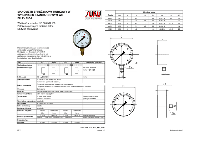 MANOMETR SPRĘŻYNOWY RURKOWY W WYKONANIU STANDARDOWYM WG Wymiary w mm Seria NG a b b1 D G h SW DIN EN 837-1 4881 4421 80 80 15 - 40 31 65 79 79 G 1/2 B G 1/2 B 72 - 22 22 Wielkość nominalna NG 80 i NG 100 Położenie przyłącza radialne dolne lub tylne centryczne 4451 100 18 42 - 100 G 1/2 B 83,5 22 4461 100 - 31 49 99 G 1/4 B - 14 5321 100 18 42 - 100 G1/2 B 83,5 22 Dla normalnych wymagań w odniesieniu do dokładności wskazań i konstrukcji. Nadają się one do wszystkich ciekłych i gazowych mediów ciśnieniowych, o ile nie działają one niszcząco na stopy miedzi i nie są krystalizujące lub o dużej lepkości. Seria 4881 4421 4451 80 Wielkość nominalna 4461 Wykonanie specjalne 100 Forma konstrukcyjna BR 4451, jednakże Kl. 1,0 = BR 5321 Dokładność 1,6 wg DIN 16005 Zakresy wskazań 0...0,6 do 0...600 bar wg DIN 16128 Kl. 1,0 nadciśnienie ujemne lub dodatnie, Zakres stosowania Obciążenie spoczynkowe: 3/4 x wartość końcowa skali Obciążenie zmienne: 2/3 x wartość końcowa skali, krótkotrwała wartość końcowa Obudowa Stal, czarna Pierścień pierścień nasadzany, stal, czarny, połączony śrubami Tarcza wskaźnikowa szkło płaskie przyrządowe Tarcza zegara Al biała, skala czarna Skale specjalne, skala czerwona wskazówka podwójna bar/MWs Wyświetlacz segmentowy stop CuZn Wskazówka Al czarna wg DIN 16099 Człon pomiarowy stop Cu Przyłącze ciśnienia stop CuZn Położenie przyłącza Gwint przyłączeniowy radialne centryczne radialne dolne tylne dolne G 1/2 B G 1/2 B G 1/2 B Medium : Tmax 60°C, otoczenie: -40°C, Tmax 60°C centryczne tylne G 1/4 B inne na zapytanie z lutem specjalnym dla 130°C/140°C Dysza dławiąca Ciężar ok. 0,18 kg 0,19 kg 0,3 kg 0,26 kg Seria 4881, 4421, 4451, 4461, 5321 07/11 Arkusz 1.2 Zmiany zastrzeżone!