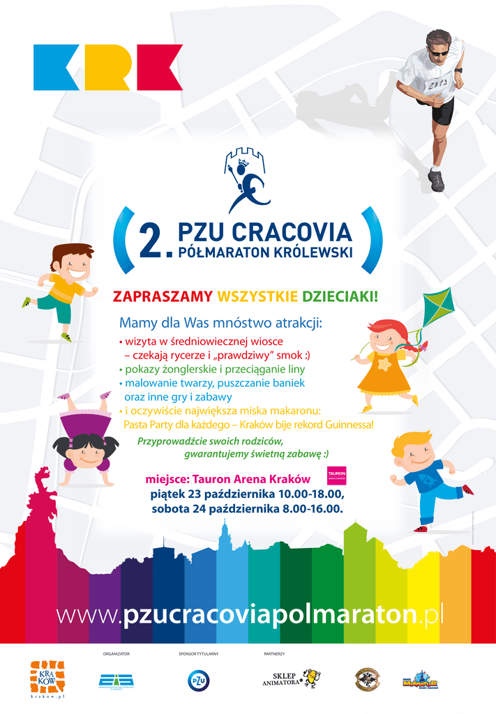 ZAPRASZAMY WSZYSTKIE DZIECIAKI! Mamy dla Was mnóstwo atrakcji: • wizyta w średniowiecznej wiosce – czekają rycerze i „prawdziwy” smok :) • pokazy żonglerskie i przeciąganie liny • malowanie twarzy, puszczanie baniek oraz inne gry i zabawy • i oczywiście największa miska makaronu: Pasta Party dla każdego – Kraków bije rekord Guinnessa! miejsce: Tauron Arena Kraków piątek 23 października 10.00-18.00, sobota 24 października 8.00-16.00. www.pzucracoviapolmaraton.pl ORGANIZATOR SPONSOR TYTULARNY PARTNERZY rysunki dzieci: designed by Freepik.com Przyprowadźcie swoich rodziców, gwarantujemy świetną zabawę :)