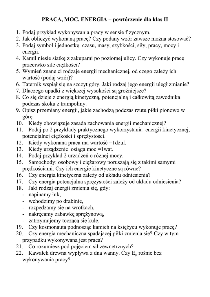PRACA, MOC, ENERGIA – powtórzenie dla klas II 1. Podaj przykład wykonywania pracy w sensie fizycznym. 2. Jak obliczyć wykonaną pracę? Czy podany wzór zawsze można stosować? 3. Podaj symbol i jednostkę: czasu, masy, szybkości, siły, pracy, mocy i energii. 4. Kamil niesie siatkę z zakupami po poziomej ulicy. Czy wykonuje pracę przeciwko sile ciężkości? 5. Wymień znane ci rodzaje energii mechanicznej, od czego zależy ich wartość (podaj wzór)? 6. Taternik wspiął się na szczyt góry. Jaki rodzaj jego energii uległ zmianie? 7. Dlaczego upadki z większej wysokości są groźniejsze? 8. Co się dzieje z energią kinetyczną, potencjalną i całkowitą zawodnika podczas skoku z trampoliny. 9. Opisz przemiany energii, jakie zachodzą podczas rzutu piłki pionowo w górę. 10. Kiedy obowiązuje zasada zachowania energii mechanicznej? 11. Podaj po 2 przykłady praktycznego wykorzystania energii kinetycznej, potencjalnej ciężkości i sprężystości. 12. Kiedy wykonana praca ma wartość =1dżul. 13. Kiedy urządzenie osiąga moc =1wat. 14. Podaj przykład 2 urządzeń o różnej mocy. 15. Samochody: osobowy i ciężarowy poruszają się z takimi samymi prędkościami. Czy ich energie kinetyczne są równe? 16. Czy energia kinetyczna zależy od układu odniesienia? 17. Czy energia potencjalna sprężystości zależy od układu odniesienia? 18. Jaki rodzaj energii zmienia się, gdy: - napinamy łuk, - wchodzimy po drabinie, - rozpędzamy się na wrotkach, - nakręcamy zabawkę sprężynową, - zatrzymujemy toczącą się kulę. 19. Czy kosmonauta podnosząc kamień na księżycu wykonuje pracę? 20. Czy energia mechaniczna spadającej piłki zmienia się? Czy w tym przypadku wykonywana jest praca? 21. Co rozumiesz pod pojęciem sił zewnętrznych? 22. Kawałek drewna wypływa z dna wanny. Czy Ep rośnie bez wykonywania pracy?