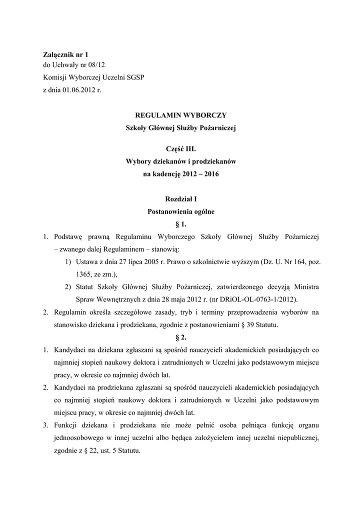 Załącznik nr 1 do Uchwały nr 08/12 Komisji Wyborczej Uczelni SGSP z dnia 01.06.2012 r. REGULAMIN WYBORCZY Szkoły Głównej Służby Pożarniczej Część III. Wybory dziekanów i prodziekanów na kadencję 2012 – 2016 Rozdział I Postanowienia ogólne § 1. 1. Podstawę prawną Regulaminu Wyborczego Szkoły Głównej Służby Pożarniczej – zwanego dalej Regulaminem – stanowią: 1) Ustawa z dnia 27 lipca 2005 r. Prawo o szkolnictwie wyższym (Dz. U. Nr 164, poz. 1365, ze zm.), 2) Statut Szkoły Głównej Służby Pożarniczej, zatwierdzonego decyzją Ministra Spraw Wewnętrznych z dnia 28 maja 2012 r. (nr DRiOL-OL-0763-1/2012). 2. Regulamin określa szczegółowe zasady, tryb i terminy przeprowadzenia wyborów na stanowisko dziekana i prodziekana, zgodnie z postanowieniami § 39 Statutu. § 2. 1. Kandydaci na dziekana zgłaszani są spośród nauczycieli akademickich posiadających co najmniej stopień naukowy doktora i zatrudnionych w Uczelni jako podstawowym miejscu pracy, w okresie co najmniej dwóch lat. 2. Kandydaci na prodziekana zgłaszani są spośród nauczycieli akademickich posiadających co najmniej stopień naukowy doktora i zatrudnionych w Uczelni jako podstawowym miejscu pracy, w okresie co najmniej dwóch lat. 3. Funkcji dziekana i prodziekana nie może pełnić osoba pełniąca funkcję organu jednoosobowego w innej uczelni albo będąca założycielem innej uczelni niepublicznej, zgodnie z § 22, ust. 5 Statutu. 4. Osoby kandydujące na stanowisko dziekana lub prodziekana składają oświadczenie lustracyjne. Nie dotyczy to osób, które złożyły już oświadczenie lustracyjne po dniu 13 września 2007 r. (Ustawa z dnia 18 października 2006 r. o ujawnieniu informacji o dokumentach organów bezpieczeństwa państwa z lat 1944-1990 oraz treści tych dokumentów - Dz. U. z 2007 r. Nr 63, poz. 425, z późn. zm.). Osoby te składają wyłącznie informację o złożeniu oświadczenia lustracyjnego. 5. Kandydat składa oświadczenie lustracyjne lub informację o złożeniu oświadczenia lustracyjnego do Rektora-Komendanta, za pośrednictwem Wydziału Kadr i Organizacji SGSP. § 3. 1. Wybory dziekanów i prodziekanów są wyborami pośrednimi i przeprowadzają je członkowie Kolegium Elektorów Uczelni, będący pracownikami, funkcjonariuszami lub studentami właściwych wydziałów, elektorzy – nauczyciele akademiccy zatrudnieni poza podstawowymi jednostkami organizacyjnymi Uczelni oraz elektorzy – pracownicy niebędący nauczycielami akademickimi. 2. Kolegium Elektorów Uczelni stanowią wszyscy elektorzy wyłonieni w drodze wyborów, w trybie wskazanym w Części I niniejszego Regulaminu. 3. Wybory dziekanów i prodziekanów przeprowadzają wydziałowe komisje wyborcze. 4. Uczelniana Komisja Wyborcza SGSP sprawuje nadzór nad przebiegiem wyborów, a także rozpatruje i rozstrzyga zastrzeżenia oraz wątpliwości dotyczące wyborów. Rozdział II Prawa wyborcze § 4. 1. Czynne prawo wyborcze przysługuje: 1) nauczycielom akademickim, zatrudnionym w Uczelni jako podstawowym lub dodatkowym miejscu pracy, 2) pracownikom niebędącym nauczycielami akademickimi, zatrudnionym w Uczelni, 3) wszystkim studentom SGSP. 2. Bierne prawo wyborcze przysługuje nauczycielom akademickim posiadającym co najmniej stopień naukowy doktora i zatrudnionych w Uczelni jako podstawowym miejscu pracy w okresie co najmniej dwóch lat, którzy do dnia wyborów nie ukończyli 2 sześćdziesiątego piątego1 roku życia, a w przypadku osób posiadających tytuł profesora – siedemdziesiątego roku życia. § 5. 1. Wyboru dziekana dokonuje się bezpośrednio na zebraniu członków kolegium elektorów, właściwych do wyboru dziekana i prodziekana, spełniających warunek określony w § 3 ust. 1. 2. Wyboru prodziekana dokonują członkowie kolegium elektorów, właściwi do wyboru dziekana i prodziekana, spełniający warunek określony w § 3 ust. 1. 3. Głosowanie jest tajne, systemem głosowania do urny wyborczej. 4. Wybór uważa się za dokonany, jeżeli kandydat uzyskał więcej niż połowę ważnych głosów. Rozdział III Terminy wyborów § 6. 1. Wybory dziekanów i prodziekanów odbywają się co cztery lata, w terminie ustalonym przez Senat Uczelni, nie później niż do 15 czerwca w ostatnim roku upływającej kadencji. 2. Szczegółowy terminarz czynności wyborczych stanowi Załącznik nr 1 do niniejszego regulaminu. Rozdział IV Zgłaszanie kandydatów § 7. 1. Każdy wyborca Uczelni posiadający czynne prawo wyborcze, zgodnie z § 4 ust. 1, ma prawo zgłaszania kandydatów na stanowisko dziekana i prodziekana spośród nauczycieli akademickich SGSP, którym przysługuje bierne prawo wyborcze, niepełniących funkcji organów jednoosobowych w innej uczelni lub niebędących założycielem albo współzałożycielem innej uczelni niepublicznej. 2. Zgłoszenie kandydata składa się na piśmie do właściwej komisji wyborczej, wraz z oświadczeniem kandydata, że wyraża zgodę na kandydowanie. 3. Wzory zgłoszenia i oświadczenia kandydata stanowią Załączniki nr 2 - 5 do niniejszego regulaminu. 1 sześćdziesiątego siódmego roku życia (Dz.U. 2014 poz. 1198 z dnia 11 lipca 2014 r.). 3 4. Zgłoszenie kandydata dokonuje się osobiście na ręce sekretarza lub członka właściwej komisji wyborczej, który zobowiązany jest pisemnie potwierdzić fakt przyjęcia zgłoszenia. 5. Za datę zgłoszenia uważa się dzień złożenia zgłoszenia i oświadczenia kandydata. 6. Kandydat, który wyraził zgodę na kandydowanie ma prawo zrezygnować na pięć dni roboczych przed wyborami, składając rezygnację na piśmie do właściwej komisji wyborczej. § 8. 1. Przewodniczący właściwych komisji wyborczych zobowiązani są do: 1) sprawdzenia, czy osoba zgłaszająca kandydata na dziekana i prodziekana spełnia warunki określone w § 4 ust. 1, a osoba kandydująca na dziekana i prodziekana spełnia warunki określone w § 4 ust. 2 i 3, 2) uznania, w razie stwierdzenia nie 