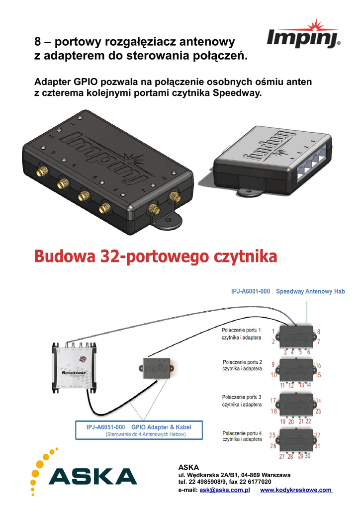 8 – portowy rozgałęziacz antenowy z adapterem do sterowania połączeń. Adapter GPIO pozwala na połączenie osobnych ośmiu anten z czterema kolejnymi portami czytnika Speedway. ASKA ul. Wędkarska 2A/B1, 04-869 Warszawa tel. 22 4985908/9, fax 22 6177020 e-mail: [email protected] www.kodykreskowe.com