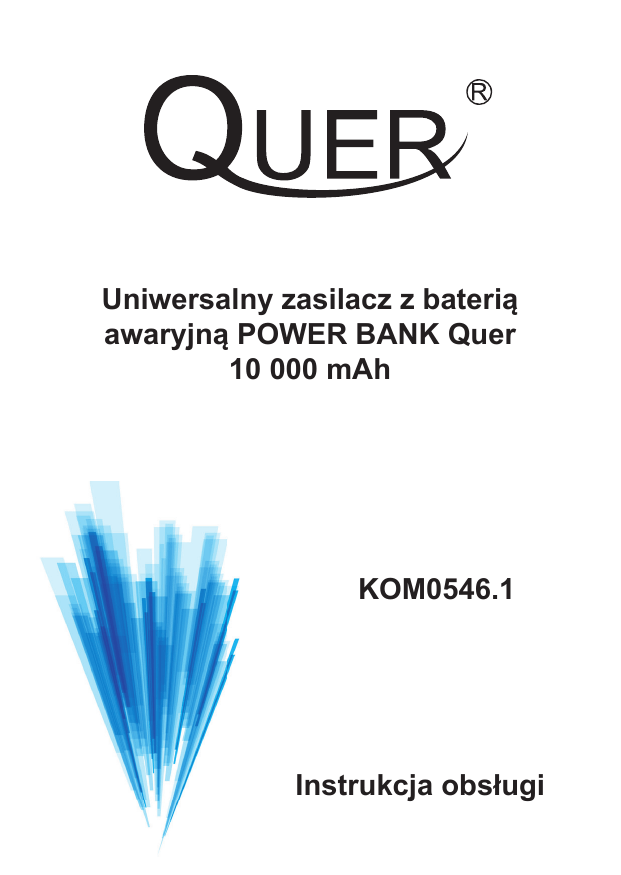 Uniwersalny zasilacz z baterią awaryjną POWER BANK Quer 10 000 mAh KOM0546.1 Instrukcja obsługi Instrukcje bezpieczeństwa 1. Przed rozpoczęciem użytkowania urządzenia, należy przeczytać instrukcję użytkowania i postępować według wskazówek w niej zawartych. Producent nie odpowiada za szkody spowodowane użytkowaniem urządzenia niezgodnie z jego przeznaczeniem lub niewłaściwą jego obsługą. 2. Nie należy prowadzić jakichkolwiek prac konserwacyjnych podczas pracy urządzenia. 3. Urządzenie może być uruchamiane tylko wewnątrz pomieszczeń. Urządzenie nie jest przystosowane do pracy na zewnątrz pomieszczeń. 4. Należy chronić urządzenie przed wilgocią (również podczas przechowywania). 5. Niniejszy sprzęt nie jest przeznaczony do użytkowania przez osoby (w tym dzieci) o ograniczonej zdolności fizycznej, czuciowej lub psychicznej lub osoby nie mające doświadczenia lub znajomości sprzętu, chyba że odbywa się to pod nadzorem i zgodnie z instrukcją użytkowania sprzętu, przekazanej przez osoby odpowiadające za ich bezpieczeństwo. Należy zwracać uwagę na dzieci, aby nie bawiły się urządzeniem. 6. W przypadku uszkodzenia urządzenia, w celu uniknięcia zagrożenia, naprawę może przeprowadzić tylko specjalistyczny zakład naprawczy albo wykwalifikowana osoba. 7. Nie należy korzystać z urządzenia w pobliżu materiałów łatwopalnych. Opis Stylowy power bank o pojemności 10 000 mAh - zasilacz z wbudowaną baterią awaryjną. W zestawie kabel USB i 6 końcówek do telefonów i tabletów. Pasuje do wszelkich urządzeń typu telefony, samartfony, tablety, kamery, aparaty fotograficzne, odtwarzacze MP3/4. Zasilacz-bateria pozwala ładować urządzenia w sytuacji, gdy nie mamy dostępu do gniazda sieciowego lub samochodowego np. na wycieczce, w górach, na rybach. W domu ładujesz Bank do pełna, a kiedy Twoje urządzenie rozładuje się podłączasz go do portu USB za pomocą uniwersalnego kabla, który znajduje się w zestawie. Do urządzenia można podłączyć dowolny kabel USB ładująco-synchronizujący co czyni baterię uniwersalną. Power bank wyposażony został dodatkowo w latarkę, która może okazać się bardzo przydatna w przypadku braku zasilania. Specyfikacja Pojemność: bateria o pojemności 10 000 mAh Ilość cykli ładowania: > 500 Zabezpieczenia: przed przeładowaniem, zwarciem, całkowitym rozładowaniem. Wejscie: DC 5 V 1 A Wyjscie 1: DC 5 V 2,1 A Wyjscie 2: DC 5 V 1 A Wymiary produktu: 108x72x22 mm Specyfikacja produktu może ulec zmianie bez powiadomienia. Zawartość zestawu - oryginalne opakowanie - power bank 10 000 mAh - kabel micro USB