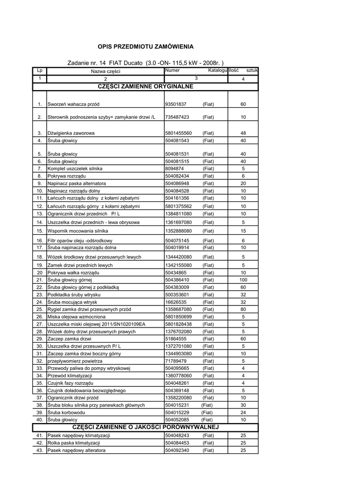 OPIS PRZEDMIOTU ZAMÓWIENIA Zadanie nr. 14 FIAT Ducato (3.0 -ON- 115,5 kW - 2008r. ) Lp Nazwa części 1 2 Numer Katalogu Ilość 3 sztuk 4 CZĘŚCI ZAMIENNE ORYGINALNE 1. Sworzeń wahacza przód 93501837 (Fiat) 60 2. Sterownik podnoszenia szyby+ zamykanie drzwi /L 735487423 (Fiat) 10 3. Dźwigienka zaworowa 5801455560 (Fiat) 48 4. Śruba głowicy 504081543 (Fiat) 40 5. Śruba głowicy 504081531 (Fiat) 40 6. Śruba głowicy 504081515 (Fiat) 40 7. Komplet uszczelek silnika 8094874 (Fiat) 5 8. Pokrywa rozrządu 504082434 (Fiat) 6 9. Napinacz paska alternatora 20 504086948 (Fiat) 10. Napinacz rozrządu dolny 504084528 (Fiat) 10 11. Łańcuch rozrządu dolny z kołami zębatymi 504161356 (Fiat) 10 12. Łańcuch rozrządu górny z kołami zębatymi 5801375562 (Fiat) 10 13. Ogranicznik drzwi przednich P/ L 1384811080 (Fiat) 10 14. Uszczelka drzwi przednich - lewa obrysowa 1361697080 (Fiat) 5 15. Wspornik mocowania silnika 1352888080 (Fiat) 15 16. Filtr oparów oleju -odśrodkowy 17. Śruba napinacza rozrządu dolna 504075145 504019914 (Fiat) (Fiat) 6 10 18. Wózek środkowy drzwi przesuwnych lewych 1344420080 (Fiat) 5 19. Zamek drzwi przednich lewych 1342155080 (Fiat) 5 20 50434865 (Fiat) 10 21. Śruba głowicy górnej Pokrywa wałka rozrządu 504386410 (Fiat) 100 22. Śruba głowicy górnej z podkładką 504383009 (Fiat) 60 23. Podkładka śruby wtrysku 500353601 (Fiat) 32 24. Śruba mocująca wtrysk 16626535 (Fiat) 32 25. Rygiel zamka drzwi przesuwnych przód 1358687080 (Fiat) 80 26. Miska olejowa wzmocniona 5801850699 (Fiat) 5 27. Uszczelka miski olejowej 2011/SN1020109EA 5801828438 (Fiat) 5 28. Wózek dolny drzwi przesuwnych prawych 1376702080 (Fiat) 5 29. Zaczep zamka drzwi 51864555 (Fiat) 60 30. Uszczelka drzwi przesuwnych P/ L 1372701080 (Fiat) 5 31. Zaczep zamka drzwi boczny górny 1344903080 (Fiat) 10 32. przepływomierz powietrza 71789479 (Fiat) 5 33. Przewody paliwa do pompy wtryskowej 504095665 (Fiat) 4 34. Przewód klimatyzacji 1360778060 (Fiat) 4 35. Czujnik fazy rozrządu 504048261 (Fiat) 4 36. Czujnik doładowania bezwzględnego 504369148 (Fiat) 5 37. Ogranicznik drzwi przód 1358220080 (Fiat) 10 30 38. Śruba bloku silnika przy panewkach głównych 504015231 (Fiat) 39. Śruba korbowodu 504015229 (Fiat) 24 40. Śruba głowicy 504052085 (Fiat) 10 CZĘŚCI ZAMIENNE O JAKOŚCI PORÓWNYWALNEJ 41. Pasek napędowy klimatyzacji 504048243 (Fiat) 25 42. Rolka paska klimatyzacji 504084453 (Fiat) 25 43. Pasek napędowy alteratora 504092340 (Fiat) 25 44. Poduszka mocowania silnika górna 1358696080 (Fiat) 5 45. Uszczelka pokrywy zaworów 504161187 (Fiat) 8 46. Grzejnik nagrzewnicy 77364073 (Fiat) 6 47. Uszczelka kolektora ssącego 504047974 (Fiat) 5 48. Uszczelka krócca EGR 504130519 (Fiat) 5 49. Uszczelka katalizatora 1330860080 (Fiat) 4 50. Tuleja wahacza przedniego tylna 31091 (Febi) 50 51. Pompka spryskiwacza szyb 71752217 (Fiat) 5 52. Uszczelka pompki spryskiwacza szyb 71752213 (Fiat) 5 53. Przewód filtra powietrza 1350800080 (Fiat) 5 54. Nakładka pedału sprzęgła 71747698 (Fiat) 6 55. uszczelka smoka pompy olejowej 17282281 (Fiat) 5 56. Pompa ssąca oleju 504083380 (Fiat) 5 57. Śruba koła 1351203080 (Fiat) 20 58. Podnośnik szyby przednich lewych 1368918080 (Fiat) 5 Warunek przedmiotowy: Zamawiający dopuszcza dostawę produktów równoważnych przy zachowaniu warunku równoważności dla odpowiednio rozumianych pojęć: 1. Pod pojęciem "części zamienne oryginalne" należy rozumieć produkty o tej samej jakości co komponenty stosowane do montażu przez producenta pojazdu samochodowego, produkowane zgodnie ze specyfikacjami i standardami produkcyjnymi ustalonymi przez producenta tych pojazdów do produkcji komponentów lub części zamiennych danego pojazdu samochodowego, w tym części zamienne produkowane na tej samej linii produkcyjnej co komponenty danego pojazdu samochodowego jeżeli producent tych części zamiennych lub podmiot upoważniony do kontroli jakości zaświadcza, że zostały one wyprodukowane zgodnie ze specyfikacjami i standardami produkcyjnymi ustalonymi przez producenta danych pojazdów i są one tej samej jakości co części stosowane do montażu tych pojazdów. 2. Pod pojęciem "części zamienne o porównywalnej jakości" należy rozumieć produkty, których producent zaświadcza, że są one tej samej jakości co komponenty, które są lub były stosowane do montażu danych pojazdów samochodowych. 3.Wskazane numery katalogowe służą wyłącznie do doprecyzowania określenia asortymentu przedmiotu zamówienia. Zamawiający nie wymaga dostawy wyłącznie produktów opisanych wskazanym numerem katalogowym, jeżeli dostarczone produkty spełniają wymienione wyżej warunki równoważności odpowiednio dla poszczególnych pojęć. Ofertę dostawy produktów spełniających warunek równoważności wykonawca potwierdza poprzez złożenie oświadczenia na druku formularza ofertowego. Wyłoniony w toku postepowania o udzielenie zamówienia publicznego wykonawca na żądanie zamawiającego ma obowiązek przedłożyć zaświadczenie potwierdzające odpowiednio oryginalność albo porównywalną jakość produktu w ramach warunku równoważności. 4. Wymieniony asortyment będzie zamawiany partiami w zależności od aktualnych potrzeb w czasie obowiązywania umowy; odbiór będzie nastepował transportem własnym Zamawiającego ze wskazanego przez Wykonawcę punktu znajdującego się w granicach administracyjnych miasta Opola lub Wykonawca dostarczy zamówiene części do trzech dni od zgłoszenia przesłanego telefaksem na numer Wykonawcy, przez Zamawiającego na adres Wydziału Transportu Komendy Wojewódzkiej Policji w Opolu; ul. Oleska 95, 45-232 Opole.