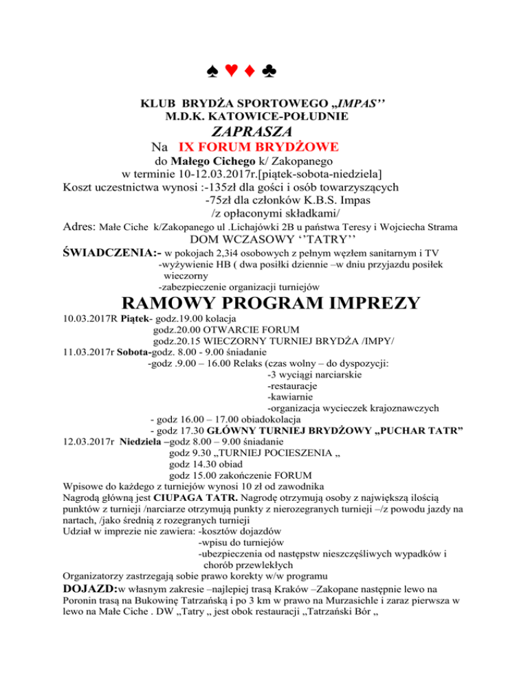♠♥♦♣ KLUB BRYDŻA SPORTOWEGO „IMPAS’’ M.D.K. KATOWICE-POŁUDNIE ZAPRASZA Na IX FORUM BRYDŻOWE do Małego Cichego k/ Zakopanego w terminie 10-12.03.2017r.[piątek-sobota-niedziela] Koszt uczestnictwa wynosi :-135zł dla gości i osób towarzyszących -75zł dla członków K.B.S. Impas /z opłaconymi składkami/ Adres: Małe Ciche k/Zakopanego ul .Lichajówki 2B u państwa Teresy i Wojciecha Strama DOM WCZASOWY ‘’TATRY’’ ŚWIADCZENIA:- w pokojach 2,3i4 osobowych z pełnym węzłem sanitarnym i TV -wyżywienie HB ( dwa posiłki dziennie –w dniu przyjazdu posiłek wieczorny -zabezpieczenie organizacji turniejów RAMOWY PROGRAM IMPREZY 10.03.2017R Piątek- godz.19.00 kolacja godz.20.00 OTWARCIE FORUM godz.20.15 WIECZORNY TURNIEJ BRYDŻA /IMPY/ 11.03.2017r Sobota-godz. 8.00 - 9.00 śniadanie -godz .9.00 – 16.00 Relaks (czas wolny – do dyspozycji: -3 wyciągi narciarskie -restauracje -kawiarnie -organizacja wycieczek krajoznawczych - godz 16.00 – 17.00 obiadokolacja - godz 17.30 GŁÓWNY TURNIEJ BRYDŻOWY „PUCHAR TATR” 12.03.2017r Niedziela –godz 8.00 – 9.00 śniadanie godz 9.30 „TURNIEJ POCIESZENIA „ godz 14.30 obiad godz 15.00 zakończenie FORUM Wpisowe do każdego z turniejów wynosi 10 zł od zawodnika Nagrodą główną jest CIUPAGA TATR. Nagrodę otrzymują osoby z największą ilością punktów z turnieji /narciarze otrzymują punkty z nierozegranych turnieji –/z powodu jazdy na nartach, /jako średnią z rozegranych turnieji Udział w imprezie nie zawiera: -kosztów dojazdów -wpisu do turniejów -ubezpieczenia od następstw nieszczęśliwych wypadków i chorób przewlekłych Organizatorzy zastrzegają sobie prawo korekty w/w programu DOJAZD:w własnym zakresie –najlepiej trasą Kraków –Zakopane następnie lewo na Poronin trasą na Bukowinę Tatrzańską i po 3 km w prawo na Murzasichle i zaraz pierwsza w lewo na Małe Ciche . DW „Tatry „ jest obok restauracji „Tatrzański Bór „ Zapisy przyjmuje Tadeusz Otrębski tel 534 097 814 lub 733 560 960 Potwierdzenie udziału w imprezie jest wpłata zaliczki w wysokości: -50 zł dla członków T.B.S. Impas -70 zł dla gości Zaliczki należy wpłacić do 28.02.2017r Jest możliwość dokonanie wpłaty zaliczki na konto bankowe KBS IMPAS nr. Konta 35 1090 2590 0000 0001 3273 0190 W przekazie proszę zaznaczyć ilość osób grających Koszty organizacyjne ponoszą wszyscy uczestnicy imprezy Zgłoszenie mniej niż 55 uczestników impreza zostanie odwołana a zaliczki zwrócone . W przypadku rezygnacji z uczestnictwa zaliczka nie podlega zwrotowi Istnieje możliwość wydłużenia pobytu koszt osobo/dnia wynosi 60 zł Impreza godna polecenia –super atmosfera W imieniu Zarządu K.B.S. IPAS Tadeusz Otrębski