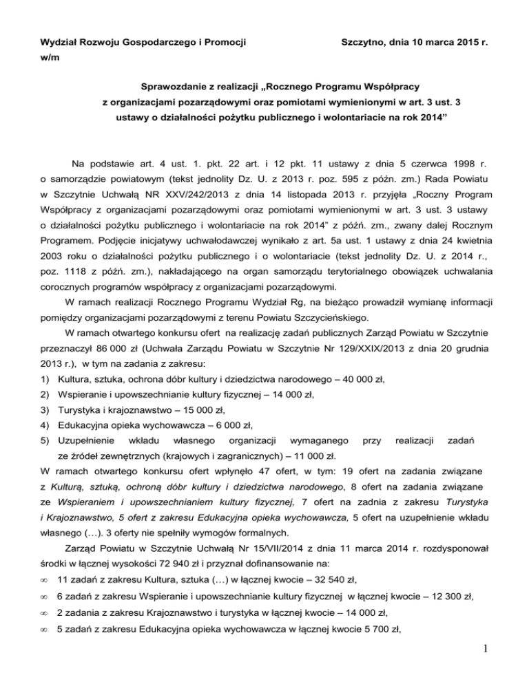 Wydział Rozwoju Gospodarczego i Promocji Szczytno, dnia 10 marca 2015 r. w/m Sprawozdanie z realizacji „Rocznego Programu Współpracy z organizacjami pozarządowymi oraz pomiotami wymienionymi w art. 3 ust. 3 ustawy o działalności pożytku publicznego i wolontariacie na rok 2014” Na podstawie art. 4 ust. 1. pkt. 22 art. i 12 pkt. 11 ustawy z dnia 5 czerwca 1998 r. o samorządzie powiatowym (tekst jednolity Dz. U. z 2013 r. poz. 595 z późn. zm.) Rada Powiatu w Szczytnie Uchwałą NR XXV/242/2013 z dnia 14 listopada 2013 r. przyjęła „Roczny Program Współpracy z organizacjami pozarządowymi oraz pomiotami wymienionymi w art. 3 ust. 3 ustawy o działalności pożytku publicznego i wolontariacie na rok 2014” z późń. zm., zwany dalej Rocznym Programem. Podjęcie inicjatywy uchwałodawczej wynikało z art. 5a ust. 1 ustawy z dnia 24 kwietnia 2003 roku o działalności pożytku publicznego i o wolontariacie (tekst jednolity Dz. U. z 2014 r., poz. 1118 z późń. zm.), nakładającego na organ samorządu terytorialnego obowiązek uchwalania corocznych programów współpracy z organizacjami pozarządowymi. W ramach realizacji Rocznego Programu Wydział Rg, na bieżąco prowadził wymianę informacji pomiędzy organizacjami pozarządowymi z terenu Powiatu Szczycieńskiego. W ramach otwartego konkursu ofert na realizację zadań publicznych Zarząd Powiatu w Szczytnie przeznaczył 86 000 zł (Uchwała Zarządu Powiatu w Szczytnie Nr 129/XXIX/2013 z dnia 20 grudnia 2013 r.), w tym na zadania z zakresu: 1) Kultura, sztuka, ochrona dóbr kultury i dziedzictwa narodowego – 40 000 zł, 2) Wspieranie i upowszechnianie kultury fizycznej – 14 000 zł, 3) Turystyka i krajoznawstwo – 15 000 zł, 4) Edukacyjna opieka wychowawcza – 6 000 zł, 5) Uzupełnienie wkładu własnego organizacji wymaganego przy realizacji zadań ze źródeł zewnętrznych (krajowych i zagranicznych) – 11 000 zł. W ramach otwartego konkursu ofert wpłynęło 47 ofert, w tym: 19 ofert na zadania związane z Kulturą, sztuką, ochroną dóbr kultury i dziedzictwa narodowego, 8 ofert na zadania związane ze Wspieraniem i upowszechnianiem kultury fizycznej, 7 ofert na zadnia z zakresu Turystyka i Krajoznawstwo, 5 ofert z zakresu Edukacyjna opieka wychowawcza, 5 ofert na uzupełnienie wkładu własnego (…). 3 oferty nie spełniły wymogów formalnych. Zarząd Powiatu w Szczytnie Uchwałą Nr 15/VII/2014 z dnia 11 marca 2014 r. rozdysponował środki w łącznej wysokości 72 940 zł i przyznał dofinansowanie na: • 11 zadań z zakresu Kultura, sztuka (…) w łącznej kwocie – 32 540 zł, • 6 zadań z zakresu Wspieranie i upowszechnianie kultury fizycznej w łącznej kwocie – 12 300 zł, • 2 zadania z zakresu Krajoznawstwo i turystyka w łącznej kwocie – 14 000 zł, • 5 zadań z zakresu Edukacyjna opieka wychowawcza w łącznej kwocie 5 700 zł, 1 • 3 zadania z zakresu Uzupełnienie wkładu własnego (…) w łącznej kwocie 8 400 zł. Pozostałe nierozdysponowane w konkursie środki Zarząd Powiatu w Szczytnie postanowił przeznaczyć na dofinansowanie indywidualnych zadań (łączna kwota: 13 060 zł). W roku 2014 do Starostwa Powiatowego w Szczytnie wpłynęło 5 ofert własnych (rozpatrywane zgodnie z art. 19 a ustawy z dnia 24 kwietnia 2003 roku o działalności pożytku publicznego i o wolontariacie (tekst jednolity Dz. U. z 2014 r., poz. 1118 z późń. zm.). Podsumowując: do ogłoszonego w 2013 roku otwartego konkursu ofert na rok 2014 przystąpiło 27 podmiotów, składając łącznie 52 oferty (1 oferta była wspólna). Trzy oferty konkursowe nie przeszły pozytywnie oceny formalnej. W ramach art. 19 a ustawy z dnia 24 kwietnia 2003 roku o działalności pożytku publicznego i o wolontariacie (tekst jednolity Dz. U. z 2014 r., poz. 1118 z późń. zm.) 4 podmioty zrealizowały 4 zadania (1 umowa została rozwiązana na mocy porozumienia stron). W ramach przyznanych przez Zarząd Powiatu w Szczytnie 32 dotacji (dla 16 organizacji pozarządowych), zawarto umowy na 30 zadań (współpracę z powiatem podjęło 15 organizacji pozarządowych). Nie doszło do podpisania 2 umów na dotacje przyznane w ramach otwartego konkursu ofert. 1 umowa została rozwiązana na mocy porozumienia stron. Na realizację zadań publicznych w roku 2014 Zarząd Powiatu przeznaczył środki w łącznej wysokości 86 000 złotych. Łączna wartość przyznanych dotacji (na etapie podpisywania umów) wyniosła 81 139,40 zł. Łączna wysokość środków finansowych wydatkowanych z budżetu powiatu na realizację zadań publicznych w roku 2014 wyniosła 78 800,56 zł. 2 Zestawienie – wykaz zadań publicznych realizowanych w roku 2014 Tabela nr 1: Oferty z zakresu – Kultura, sztuka, ochrona dóbr kultury i dziedzictwa narodowego, zrealizowane w roku 2014. Oferta Lp. 1 2 3 Nazwa zadania Warsztaty rękodzielnicze "Zręczne ręce" IX Otwarty Ogólnopolski Turniej Chórów o Miecz Juranda-Spychowo 2014 Powrót Juranda do Spychowa – Spychowo 2014 4 5 XX Dni Kresowe Przegląd Twórczości artystycznej i literackiej osób niepełnosprawnych powiatu szczycieńskiego 6 7 8 9 Świąteczny czas miłości Tu się kęci. Filmowe warsztaty artystyczne. Kontynuacja. Znalazłem w szufladzie aparat Zorka5-kontynuacja. Warsztaty fotograficzne dla dzieci i młodzieży z Powiatu Szczycieńskiego VI Spotkania Gospodyń Wiejskich - Kolonia 2014 10 VII Powiatowy Festiwal Młodych Talentów w Jerutkach. 11 12 4 Szczycieński Festiwal Gitarowy Razem Nazwa oferenta Stowarzyszenie "Uniwersytet Trzeciego Wieku w Szczytnie" Stowarzyszenie Przyjazne Spychowo Stowarzyszenie Przyjazne Spychowo Towarzystwo Przyjaciół Ziemi WileńskoNowogródzkiej Stowarzyszenie Pomocy na Rzecz Osób Niepełnosprawnych w Szczytnie Stowarzyszenie Rodzin Zastępczych "Lepsze dzieciństwo" i Stowarzyszenie "Konik na biegunach" Mazurskie Stowarzyszenie Ekologiczno-Kulturalne WATAHA Mazurskie Stowarzyszenie Ekologiczno-Kulturalne WATAHA Stowarzyszenie Kol
