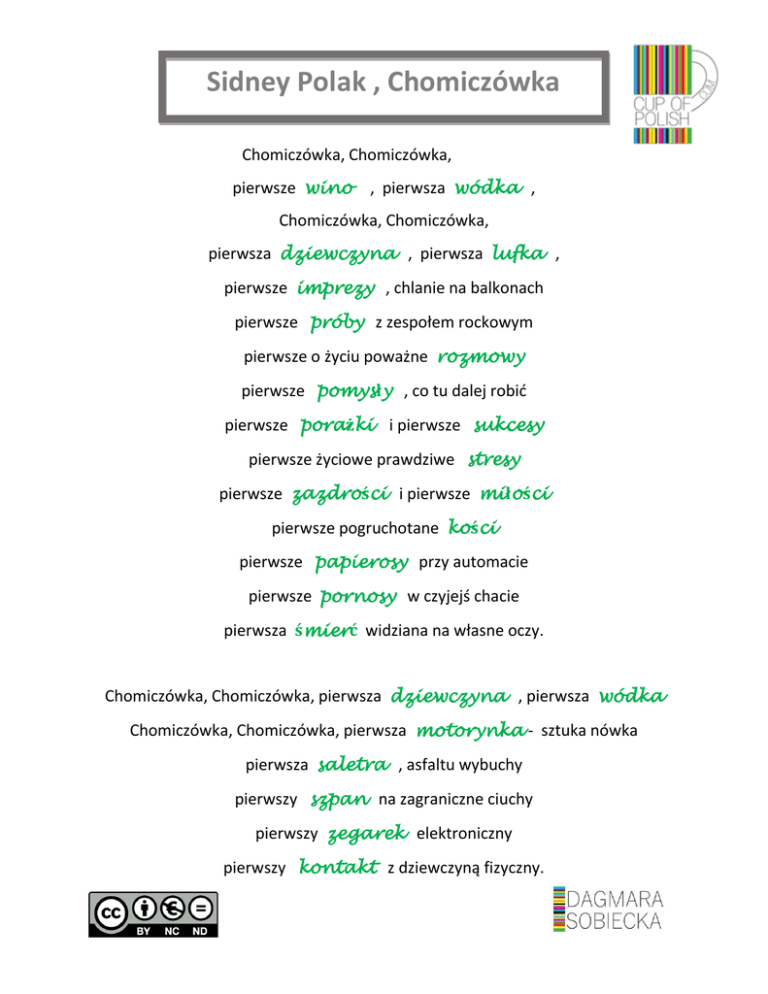 Sidney Polak , Chomiczówka Chomiczówka, Chomiczówka, pierwsze wino , pierwsza wódka , Chomiczówka, Chomiczówka, pierwsza dziewczyna , pierwsza lufka , pierwsze imprezy , chlanie na balkonach pierwsze próby z zespołem rockowym pierwsze o życiu poważne rozmowy pierwsze pomysły , co tu dalej robić pierwsze porażki i pierwsze sukcesy pierwsze życiowe prawdziwe stresy pierwsze zazdrości i pierwsze miłości pierwsze pogruchotane kości pierwsze papierosy przy automacie pierwsze pornosy w czyjejś chacie pierwsza śmierć widziana na własne oczy. Chomiczówka, Chomiczówka, pierwsza dziewczyna , pierwsza wódka Chomiczówka, Chomiczówka, pierwsza motorynka - sztuka nówka pierwsza saletra , asfaltu wybuchy pierwszy szpan na zagraniczne ciuchy pierwszy zegarek elektroniczny pierwszy kontakt z dziewczyną fizyczny. Sidney Polak , Chomiczówka Chomiczówka, Chomiczówka, latem Izabelin, Truskaw Chomiczówka, Chomiczówka, wysypisko radiowo, lotnisko Bemowo Chomiczówka, Chomiczówka, tutaj przedszkole, szkoła sto-szóstka Chomiczówka, Chomiczówka, pod huta liceum, inni zawodówka. Roztrzaskany szybowiec na bloku, samobójczy skok zakochanej pary, nie do wiary, religia w baraku na tyłach kościoła bite butelki na zapleczu sklepu zbierany butapren do słoików pierwszy w rodzinie drogowy wehikuł. Nie ma już Chomiczówki sprzed lat, wspomnień czad wali w głowę jak, ołowiany grad to prawda, minęło już, przecież kilkanaście lat, czasu szmat, życia szarej codzienności bat, nagle spadł, zabierając w przeszłość tamten świat, zabierając w przeszłość tamten świat. Nie ma ludzi, których tu znałem, którym ufałem, niejedno zawdzięczałem nie ma wrogów i nie ma przyjaciół, a każdemu los rożnie odpłacił jedni patrzą się teraz zza krat, kilku już opuściło ten świat innych zniszczył pieniędzy brak, jeszcze innych zmienił ich smak. Każdy kamień to inna historia, w brudnej windzie - ja w krótkich spodniach trzymam kapsle w kolorowych foliach, liczę piętra a głowa jest wolna nie dotyczy mnie nic z tego co teraz, żaden hajs ani krotka kariera - rocknedrolowego hochsztaplera Chomiczówka, Chomiczówka, Chomiczówka, Chomiczówka... Marii Dąbrowskiej, Conrada, Kwitnąca, Aspekt, Mistrzowska