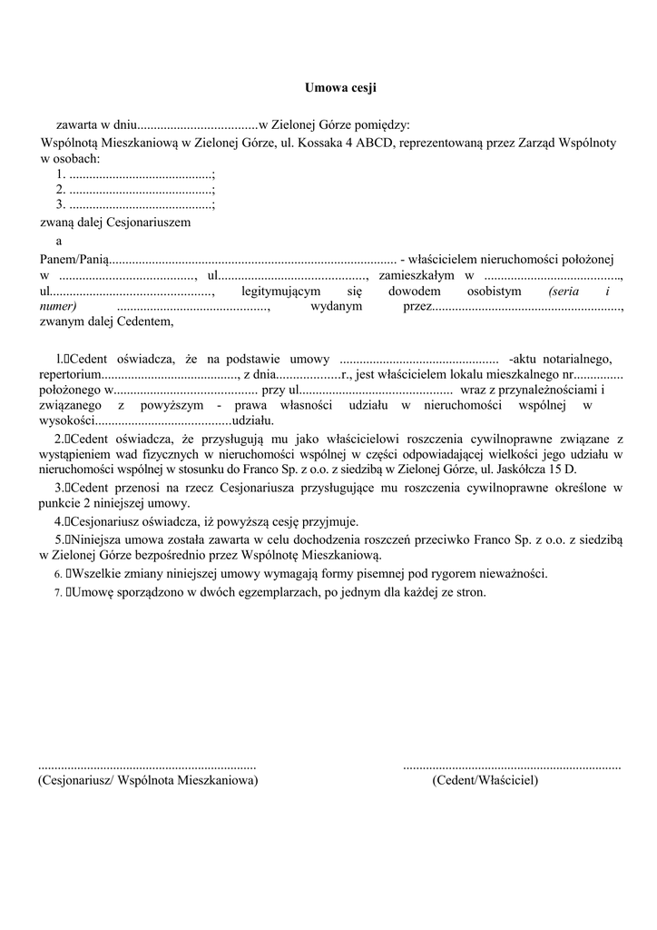 Umowa cesji zawarta w dniu....................................w Zielonej Górze pomiędzy: Wspólnotą Mieszkaniową w Zielonej Górze, ul. Kossaka 4 ABCD, reprezentowaną przez Zarząd Wspólnoty w osobach: 1. ...........................................; 2. ...........................................; 3. ...........................................; zwaną dalej Cesjonariuszem a Panem/Panią....................................................................................... - właścicielem nieruchomości położonej w ........................................, ul............................................, zamieszkałym w ........................................., ul................................................, legitymującym się dowodem osobistym (seria i numer) ............................................., wydanym przez........................................................., zwanym dalej Cedentem, l.Cedent oświadcza, że na podstawie umowy ................................................ -aktu notarialnego, repertorium........................................., z dnia...................r., jest właścicielem lokalu mieszkalnego nr............... położonego w........................................... przy ul.............................................. wraz z przynależnościami i związanego z powyższym - prawa własności udziału w nieruchomości wspólnej w wysokości.........................................udziału. 2.Cedent oświadcza, że przysługują mu jako właścicielowi roszczenia cywilnoprawne związane z wystąpieniem wad fizycznych w nieruchomości wspólnej w części odpowiadającej wielkości jego udziału w nieruchomości wspólnej w stosunku do Franco Sp. z o.o. z siedzibą w Zielonej Górze, ul. Jaskółcza 15 D. 3.Cedent przenosi na rzecz Cesjonariusza przysługujące mu roszczenia cywilnoprawne określone w punkcie 2 niniejszej umowy. 4.Cesjonariusz oświadcza, iż powyższą cesję przyjmuje. 5.Niniejsza umowa została zawarta w celu dochodzenia roszczeń przeciwko Franco Sp. z o.o. z siedzibą w Zielonej Górze bezpośrednio przez Wspólnotę Mieszkaniową. 6. Wszelkie zmiany niniejszej umowy wymagają formy pisemnej pod rygorem nieważności. 7. Umowę sporządzono w dwóch egzemplarzach, po jednym dla każdej ze stron. ................................................................... (Cesjonariusz/ Wspólnota Mieszkaniowa) ................................................................... (Cedent/Właściciel)