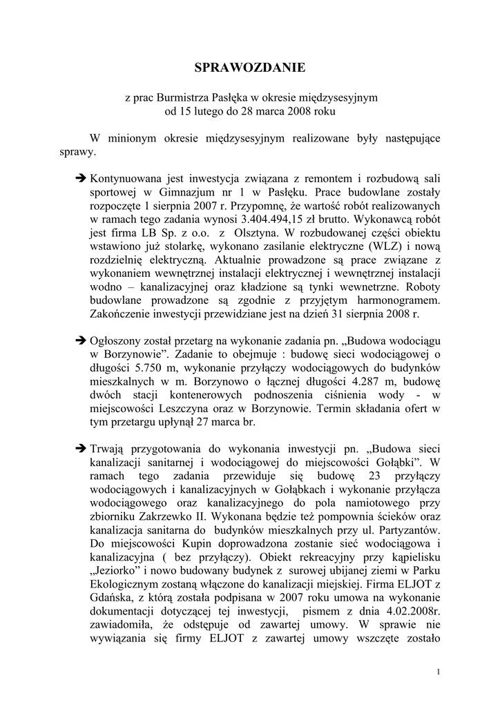 SPRAWOZDANIE z prac Burmistrza Pasłęka w okresie międzysesyjnym od 15 lutego do 28 marca 2008 roku W minionym okresie międzysesyjnym realizowane były następujące sprawy. Kontynuowana jest inwestycja związana z remontem i rozbudową sali sportowej w Gimnazjum nr 1 w Pasłęku. Prace budowlane zostały rozpoczęte 1 sierpnia 2007 r. Przypomnę, że wartość robót realizowanych w ramach tego zadania wynosi 3.404.494,15 zł brutto. Wykonawcą robót jest firma LB Sp. z o.o. z Olsztyna. W rozbudowanej części obiektu wstawiono już stolarkę, wykonano zasilanie elektryczne (WLZ) i nową rozdzielnię elektryczną. Aktualnie prowadzone są prace związane z wykonaniem wewnętrznej instalacji elektrycznej i wewnętrznej instalacji wodno – kanalizacyjnej oraz kładzione są tynki wewnetrzne. Roboty budowlane prowadzone są zgodnie z przyjętym harmonogramem. Zakończenie inwestycji przewidziane jest na dzień 31 sierpnia 2008 r. Ogłoszony został przetarg na wykonanie zadania pn. „Budowa wodociągu w Borzynowie”. Zadanie to obejmuje : budowę sieci wodociągowej o długości 5.750 m, wykonanie przyłączy wodociągowych do budynków mieszkalnych w m. Borzynowo o łącznej długości 4.287 m, budowę dwóch stacji kontenerowych podnoszenia ciśnienia wody - w miejscowości Leszczyna oraz w Borzynowie. Termin składania ofert w tym przetargu upłynął 27 marca br. Trwają przygotowania do wykonania inwestycji pn. „Budowa sieci kanalizacji sanitarnej i wodociągowej do miejscowości Gołąbki”. W ramach tego zadania przewiduje się budowę 23 przyłączy wodociągowych i kanalizacyjnych w Gołąbkach i wykonanie przyłącza wodociągowego oraz kanalizacyjnego do pola namiotowego przy zbiorniku Zakrzewko II. Wykonana będzie też pompownia ścieków oraz kanalizacja sanitarna do budynków mieszkalnych przy ul. Partyzantów. Do miejscowości Kupin doprowadzona zostanie sieć wodociągowa i kanalizacyjna ( bez przyłączy). Obiekt rekreacyjny przy kąpielisku „Jeziorko” i nowo budowany budynek z surowej ubijanej ziemi w Parku Ekologicznym zostaną włączone do kanalizacji miejskiej. Firma ELJOT z Gdańska, z którą została podpisana w 2007 roku umowa na wykonanie dokumentacji dotyczącej tej inwestycji, pismem z dnia 4.02.2008r. zawiadomiła, że odstępuje od zawartej umowy. W sprawie nie wywiązania się firmy ELJOT z zawartej umowy wszczęte zostało 1 postępowanie o zapłatę odszkodowania. W celu doprowadzenia do realizacji tego zadania, Urząd Miejski niezwłocznie podjął działania zmierzające do opracowania dokumentacji i uzyskania pozwolenia na budowę. Podpisana została umowa z innym wykonawcą, który zobowiązał się wykonać potrzebną dokumentację do 18 sierpnia 2008r. Rozpoczęła się budowa ronda na skrzyżowaniu ulic: Sprzymierzonych, Augustyna Steffena, Kraszewskiego. W związku z tą inwestycją drogową powstał problem zapewnienia nieuciążliwego dla mieszkańców osiedli Północ i Zarzecze objazdu dla pojazdów oraz bezpiecznego ruchu pieszych na przebudowywanym skrzyżowaniu. Temu problemowi poświęcone zostało spotkanie zorganizowane z inicjatywy pasłęckiego samorządu, które odbyło się 26 lutego br. W spotkaniu tym udział wzięli przedstawiciele reprezentujący inwestora, wykonawcę oraz gminę Pasłęk i powiat elbląski. Reprezentująca Rejon Dróg Wojewódzkich Pani Małgorzata Danowska zapewniła, że budowa ronda będzie realizowana w sposób umożliwiający ruch pojazdów na przebudowywanym skrzyżowaniu. Z uwagi na zaplanowany w tym samym czasie remont mostu na drodze 513 w m. Olkowo, drogą tą nie będą mogły poruszać się pojazdy o ładowności pow. 15 ton, co zmniejszy nasilenie ruchu ulicą Sprzymierzonych w kierunku Ornety. Kierownik budowy poinformował natomiast, że w pierwszej kolejności będą realizowane roboty związane z infrastrukturą podziemną, które w większości zostaną wykonane metodą przewiertów sterowanych. Natomiast budowa nawierzchni ronda przypadnie na okres wakacyjny. W związku z powyższym utrudnienia związane z inwestycją nie będą zbyt uciążliwe i niebezpieczne dla dzieci uczęszczających do Szkoły Podstawowej Nr 2 . Ustalono, że w odpowiednim czasie zostanie zorganizowane spotkanie wykonawcy, Policji i Straży Miejskiej z uczniami i nauczycielami Szkoły Podstawowej Nr 2, na którym uczniowie zostaną pouczeni o zasadach przemieszczania się przez teren budowy ronda. Wykonawca ronda zapewnił, że jeżeli wogóle nastąpią czasowe wyłączenia przebudowywanego skrzyżowania z ruchu, to będą to przypadki sporadyczne, a przerwy w ruchu będą bardzo krótkie. Ogłoszony został przetarg nieograniczony na wykonanie dokumentacji projektowej dotyczącej budowy wodociągu od Zielonki Pasłęckiej przez Wójtowiznę, Tulno do Kronina i budowy oczyszczalni ścieków z kanalizacją sanitarną w Kroninie. Oferty w tym przetargu można składać do godz. 10,00 w dniu 1 kwietnia br. Otwarcie ofert nastąpi 01 kwietnia o godz. 10,15. 2 Kontynuowane są roboty związane z budową ulicy Firmowej na terenie SSE przy ul. Westerplatte w Pasłęku. 18 marca Wykonawca rozpoczął układanie masy bitumicznej. Ulica Firmowa będzie drogą kategorii KR-4, o długości 57 mb, posiadającą sieć wodociągową, kanalizację sanitarną i deszczową oraz oświetlenie uliczne. 12 marca 2008 r. podpisana została umowa z wykonawcą na wykonanie oświetlenia drogowego ulic Dworcowej i Cichej. Wybrana została oferta złożona przez Przedsiębiorstwo Produkcyjno Handlowo Usługowe „ELEKTRONET” z Ornety. Wysokość wynagrodzenia za wykonanie przedmiotu umowy ustalono ryczałtowo na kwotę 169.386 zł. Była to najtańsza oferta spośród dziesięciu złożonych na wykonanie tej inwestycji. Zakres robót przewidzianych do wykonania w ramach tego zadania obejmuje. - budowę sieci oświetleniowej – 1578 mb, - montaż słupów i opraw oświetleniowych – 41 szt, - montaż szafek oświetleniowych – 3