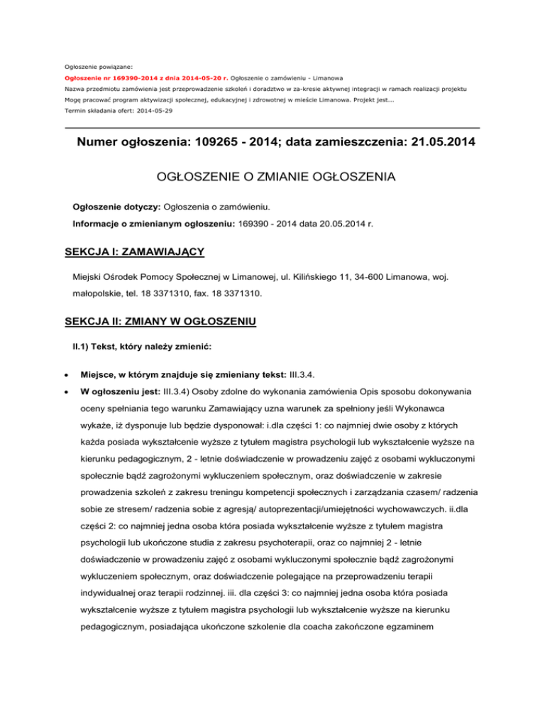 Ogłoszenie powiązane: Ogłoszenie nr 169390-2014 z dnia 2014-05-20 r. Ogłoszenie o zamówieniu - Limanowa Nazwa przedmiotu zamówienia jest przeprowadzenie szkoleń i doradztwo w za-kresie aktywnej integracji w ramach realizacji projektu Mogę pracować program aktywizacji społecznej, edukacyjnej i zdrowotnej w mieście Limanowa. Projekt jest... Termin składania ofert: 2014-05-29 Numer ogłoszenia: 109265 - 2014; data zamieszczenia: 21.05.2014 OGŁOSZENIE O ZMIANIE OGŁOSZENIA Ogłoszenie dotyczy: Ogłoszenia o zamówieniu. Informacje o zmienianym ogłoszeniu: 169390 - 2014 data 20.05.2014 r. SEKCJA I: ZAMAWIAJĄCY Miejski Ośrodek Pomocy Społecznej w Limanowej, ul. Kilińskiego 11, 34-600 Limanowa, woj. małopolskie, tel. 18 3371310, fax. 18 3371310. SEKCJA II: ZMIANY W OGŁOSZENIU II.1) Tekst, który należy zmienić: Miejsce, w którym znajduje się zmieniany tekst: III.3.4. W ogłoszeniu jest: III.3.4) Osoby zdolne do wykonania zamówienia Opis sposobu dokonywania oceny spełniania tego warunku Zamawiający uzna warunek za spełniony jeśli Wykonawca wykaże, iż dysponuje lub będzie dysponował: i.dla części 1: co najmniej dwie osoby z których każda posiada wykształcenie wyższe z tytułem magistra psychologii lub wykształcenie wyższe na kierunku pedagogicznym, 2 - letnie doświadczenie w prowadzeniu zajęć z osobami wykluczonymi społecznie bądź zagrożonymi wykluczeniem społecznym, oraz doświadczenie w zakresie prowadzenia szkoleń z zakresu treningu kompetencji społecznych i zarządzania czasem/ radzenia sobie ze stresem/ radzenia sobie z agresją/ autoprezentacji/umiejętności wychowawczych. ii.dla części 2: co najmniej jedna osoba która posiada wykształcenie wyższe z tytułem magistra psychologii lub ukończone studia z zakresu psychoterapii, oraz co najmniej 2 - letnie doświadczenie w prowadzeniu zajęć z osobami wykluczonymi społecznie bądź zagrożonymi wykluczeniem społecznym, oraz doświadczenie polegające na przeprowadzeniu terapii indywidualnej oraz terapii rodzinnej. iii. dla części 3: co najmniej jedna osoba która posiada wykształcenie wyższe z tytułem magistra psychologii lub wykształcenie wyższe na kierunku pedagogicznym, posiadająca ukończone szkolenie dla coacha zakończone egzaminem poświadczone uzyskaniem certyfikatu, doświadczenie w prowadzeniu zajęć z osobami wykluczonymi społecznie bądź zagrożonymi wykluczeniem społecznym, oraz doświadczenie polegające na przeprowadzeniu coachingu dla co najmniej 5 osób. iv. dla części 4: co najmniej jedna osoba która posiada wykształcenie z zakresu do-radztwa zawodowego (ukończone studia wyższe lub studia podyplomowe) oraz co najmniej 2 - letnie doświadczenie w prowadzeniu zajęć z osobami wykluczonymi społecznie bądź zagrożonymi wykluczeniem społecznym, oraz posiada doświad-czenie w przeprowadzeniu szkoleń/ zajęć/warsztatów z zakresu doradztwa zawo-dowego lub treningu pracy. v.dla części 5: co najmniej jedną osobę która posiada wykształcenie wyższe z tytu-łem magistra psychologii lub wykształcenie wyższe na kierunku pedagogicznym, posiada 2 letnie doświadczenie w prowadzeniu zajęć z osobami wykluczonymi społecznie bądź zagrożonymi wykluczeniem społecznym, oraz doświadczenie w zakresie prowadzenia szkoleń z zakresu/ zajęć/warsztatów/kursu z zakresu opieki nad osobą straszą. vi. dla części 6: co najmniej jedną osobę która posiada doświadczenie w przeprowadzeniu co najmniej dwóch szkoleń z zakresu obsługi komputera i kasy fiskalnej, vii. dla części 7: co najmniej jedną osobę która posiada doświadczenie w przeprowadzeniu co najmniej dwóch szkoleń z zakresu udzielania pierwszej pomocy, viii. dla części 8: co najmniej jedną osobę instruktora nauki jazdy kat. B, który posiada minimum 2 letnie doświadczenie zawodowe, oraz posiada uprawnienia do szkolenia osób ubiegających się o uprawnienia do kierowania pojazdami kat. B.. W ogłoszeniu powinno być: III.3.4) Osoby zdolne do wykonania zamówienia Opis sposobu dokonywania oceny spełniania tego warunku Zamawiający uzna warunek za spełniony jeśli Wykonawca wykaże, iż dysponuje lub będzie dysponował: i.dla części 1: co najmniej dwie osoby z których każda posiada wykształcenie wyższe z tytułem magistra psychologii lub wykształcenie wyższe na kierunku pedagogicznym, 2 - letnie doświadczenie w prowadzeniu zajęć z osobami wykluczonymi społecznie bądź zagrożonymi wykluczeniem społecznym, oraz doświadczenie w zakresie prowadzenia szkoleń z zakresu treningu kompetencji społecznych i zarządzania czasem/ radzenia sobie ze stresem/ radzenia sobie z agresją/ autoprezentacji/umiejętności wychowawczych. ii.dla części 2: co najmniej jedna osoba która posiada wykształcenie wyższe z tytułem magistra psychologii lub ukończone studia z zakresu psychoterapii, oraz co najmniej 2 letnie doświadczenie w prowadzeniu zajęć z osobami wykluczonymi społecznie bądź zagrożonymi wykluczeniem społecznym, oraz doświadczenie polegające na przeprowadzeniu terapii indywidualnej oraz terapii rodzinnej. iii. dla części 3: co najmniej jedna osoba która posiada wykształcenie wyższe z tytułem magistra psychologii lub wykształcenie wyższe na kierunku pedagogicznym, posiadająca ukończone szkolenie dla coacha zakończone egzaminem poświadczone uzyskaniem certyfikatu, doświadczenie w prowadzeniu zajęć z osobami wykluczonymi społecznie bądź zagrożonymi wykluczeniem społecznym, oraz doświadczenie polegające na przeprowadzeniu coachingu dla co najmniej 5 osób. iv. dla części 4: co najmniej jedna osoba która posiada wykształcenie z zakresu do-radztwa zawodowego (ukończone studia wyższe lub studia podyplomowe) oraz co najmniej 2 - letnie doświadczenie w prowadzeniu zajęć z osobami wykluczonymi społecznie bądź zagrożonymi wykluczeniem społecznym, oraz posiada doświad-czenie w przeprowadzeniu szkoleń/ zajęć/warsztatów z zakresu 