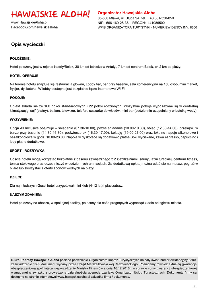 Organizator Hawajskie Aloha www.HawajskieAloha.pl Facebook.com/hawajskiealoha 06-500 Mława, ul. Długa 9A, tel. + 48 881-520-850 NIP: 566-169-28-36, REGON: 141986500 WPIS ORGANIZATORA TURYSTYKI - NUMER EWIDENCYJNY: 8300 Opis wycieczki POŁOŻENIE: Hotel położony jest w rejonie Kadriy/Belek, 30 km od lotniska w Antalyi, 7 km od centrum Belek, ok 2 km od plaży. HOTEL OFERUJE: Na terenie hotelu znajduje się restauracja główna, Lobby bar, bar przy basenie, sala konferencyjna na 150 osób, mini market, fryzjer, dyskoteka. W lobby dostępne jest bezpłatnie łącze internetowe Wi-Fi. POKOJE: Obiekt składa się ze 160 pokoi standardowych i 22 pokoi rodzinnych. Wszystkie pokoje wyposażone są w centralną klimatyzację, sejf (płatny), balkon, telewizor, telefon, suszarkę do włosów, mini bar (codziennie uzupełniany w butelkę wody). WYŻYWIENIE: Opcja All Inclusive obejmuje – śniadanie (07.30-10.00), późne śniadanie (10.00-10.30), obiad (12.30-14.00), przekąski w barze przy basenie (14.30-16.30), podwieczorek (16.30-17.00), kolację (19.00-21.00) oraz lokalne napoje alkoholowe i bezalkoholowe w godz. 10.00-23.00. Napoje w dyskotece są dodatkowo płatne.Soki wyciskane, kawa espresso, capuccino i lody płatne dodatkowo. SPORT I ROZRYWKA: Goście hotelu mogą korzystać bezpłatnie z basenu zewnętrznego z 2 zjeżdżalniami, sauny, łaźni tureckiej, centrum fitness, tenisa stołowego oraz uczestniczyć w codziennych animacjach. Za dodatkową opłatą można udać się na masaż, pograć w bilard lub skorzystać z oferty sportów wodnych na plaży. DZIECI: Dla najmłodszych Gości hotel przygotował mini klub (4-12 lat) i plac zabaw. NASZYM ZDANIEM: Hotel położony na uboczu, w spokojnej okolicy, polecany dla osób pragnących wypocząć z dala od zgiełku miasta. Biuro Podróży Hawajskie Aloha posiada pozwolenie Organizatora Imprez Turystycznych na cały świat, numer ewidencyjny 8300, zaświadczenie 1399 dokument wydany przez Urząd Marszałkowski woj. Mazowieckiego. Posiadamy również aktualną gwarancje ubezpieczeniową spełniająca rozporządzenie Ministra Finansów z dnia 16.12.2010r. w sprawie sumy gwarancji ubezpieczeniowej wymaganej w związku z prowadzoną działalnością gospodarczą jako Organizator Usług Turystycznych. Dokumenty firmy są dostępne na stronie internetowej www.hawajskiealoha.pl zakładka firma / dokumenty. 1/1