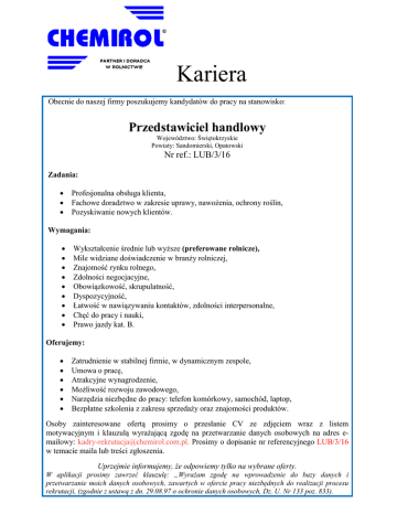 Kariera Obecnie do naszej firmy poszukujemy kandydatów do pracy na stanowisko: Przedstawiciel handlowy Województwo: Świętokrzyskie Powiaty: Sandomierski, Opatowski Nr ref.: LUB/3/16 Zadania: Profesjonalna obsługa klienta, Fachowe doradztwo w zakresie uprawy, nawożenia, ochrony roślin, Pozyskiwanie nowych klientów. Wymagania: Wykształcenie średnie lub wyższe (preferowane rolnicze), Mile widziane doświadczenie w branży rolniczej, Znajomość rynku rolnego, Zdolności negocjacyjne, Obowiązkowość, skrupulatność, Dyspozycyjność, Łatwość w nawiązywaniu kontaktów, zdolności interpersonalne, Chęć do pracy i nauki, Prawo jazdy kat. B. Oferujemy: Zatrudnienie w stabilnej firmie, w dynamicznym zespole, Umowa o pracę, Atrakcyjne wynagrodzenie, Możliwość rozwoju zawodowego, Narzędzia niezbędne do pracy: telefon komórkowy, samochód, laptop, Bezpłatne szkolenia z zakresu sprzedaży oraz znajomości produktów. Osoby zainteresowane ofertą prosimy o przesłanie CV ze zdjęciem wraz z listem motywacyjnym i klauzulą wyrażającą zgodę na przetwarzanie danych osobowych na adres emailowy: [email protected]. Prosimy o dopisanie nr referencyjnego LUB/3/16 w temacie maila lub treści zgłoszenia. Uprzejmie informujemy, że odpowiemy tylko na wybrane oferty. W aplikacji prosimy zawrzeć klauzulę: „Wyrażam zgodę na wprowadzenie do bazy danych i przetwarzanie moich danych osobowych, zawartych w ofercie pracy niezbędnych do realizacji procesu rekrutacji, (zgodnie z ustawą z dn. 29.08.97 o ochronie danych osobowych, Dz. U. Nr 133 poz. 833).
