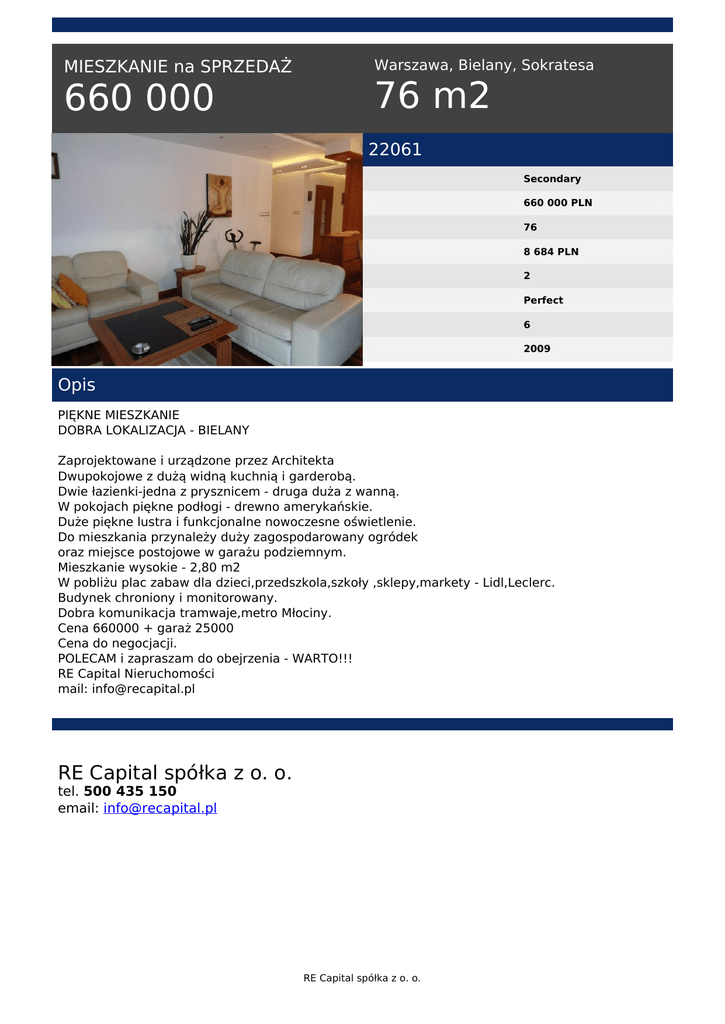 MIESZKANIE na SPRZEDAŻ 660 000 Warszawa, Bielany, Sokratesa 76 m2 22061 Secondary 660 000 PLN 76 8 684 PLN 2 Perfect 6 2009 Opis PIĘKNE MIESZKANIE DOBRA LOKALIZACJA - BIELANY Zaprojektowane i urządzone przez Architekta Dwupokojowe z dużą widną kuchnią i garderobą. Dwie łazienki-jedna z prysznicem - druga duża z wanną. W pokojach piękne podłogi - drewno amerykańskie. Duże piękne lustra i funkcjonalne nowoczesne oświetlenie. Do mieszkania przynależy duży zagospodarowany ogródek oraz miejsce postojowe w garażu podziemnym. Mieszkanie wysokie - 2,80 m2 W pobliżu plac zabaw dla dzieci,przedszkola,szkoły ,sklepy,markety - Lidl,Leclerc. Budynek chroniony i monitorowany. Dobra komunikacja tramwaje,metro Młociny. Cena 660000 + garaż 25000 Cena do negocjacji. POLECAM i zapraszam do obejrzenia - WARTO!!! RE Capital Nieruchomości mail: [email protected] RE Capital spółka z o. o. tel. 500 435 150 email: [email protected] RE Capital spółka z o. o. Powered by TCPDF (www.tcpdf.org)