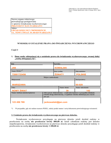 Załączniki nr 1 do rozporządzenia Ministra Rodziny, Pracy i Polityki Społecznej z dnia 18 lutego 2016 r. (poz. 214) Nazwa organu właściwego prowadzącego postępowanie w sprawie świadczenia wychowawczego: PREZYDENT M.ST.WARSZAWY Adres: URZĄD DZIELNICY ŚRÓDMIEŚCIE UL. NOWY ŚWIAT 39; 00-029 WARSZAWA WNIOSEK O USTALENIE PRAWA DO ŚWIADCZENIA WYCHOWAWCZEGO Część I 1. Dane osoby ubiegającej się o ustalenie prawa do świadczenia wychowawczego, zwanej dalej „osobą ubiegającą się”. Imię Nazwisko JAN KOWALSKI ) Numer PESEL* Stan cywilny 72081723456 Obywatelstwo ŻONATY POLSKIE Miejsce zamieszkania Miejscowość Kod pocztowy WARSZAWA 00-029 Ulica Numer domu NOWY ŚWIAT Numer telefonu (nieobowiązkowo) Numer mieszkania 39 142 Adres poczty elektronicznej – e-mail (obowiązkowo w przypadku składania wniosku drogą elektroniczną, z wyjątkiem wniosku składanego przy użyciu ePUAP) 123 456 789 *) [email protected] W przypadku, gdy nie nadano numeru PESEL, należy podać numer i serię dokumentu potwierdzającego tożsamość. 2. Ustalenie prawa do świadczenia wychowawczego na pierwsze dziecko. Świadczenie wychowawcze przysługuje na pierwsze dziecko jeżeli dochód rodziny w przeliczeniu na osobę nie przekracza kwoty 800,00 zł. Jeżeli członkiem rodziny jest dziecko niepełnosprawne, świadczenie wychowawcze na pierwsze dziecko przysługuje jeżeli dochód rodziny w przeliczeniu na osobę nie przekracza kwoty 1 200,00 zł. Pierwsze dziecko oznacza jedyne lub najstarsze dziecko w rodzinie w wieku do ukończenia 18. roku życia; w przypadku dzieci urodzonych tego samego dnia, miesiąca i roku, będących najstarszymi dziećmi w rodzinie w wieku do ukończenia 18. roku życia (czyli w przypadku wieloraczków) pierwsze dziecko oznacza jedno z tych dzieci wskazane przez osobę ubiegającą się. Niepełnosprawne dziecko oznacza dziecko legitymujące się orzeczeniem o niepełnosprawności określonym w przepisach o rehabilitacji zawodowej i społecznej oraz zatrudnianiu osób niepełnosprawnych albo orzeczeniem o umiarkowanym lub znacznym stopniu niepełnosprawności. UWAGA! □ Wnoszę o ustalenie prawa do świadczenia wychowawczego na pierwsze dziecko zamieszkujące ze mną oraz pozostające na moim utrzymaniu (w przypadku zaznaczenia – wypełnić tabelę A oraz tabelę B w przypadku ubiegania się o świadczenie wychowawcze również na kolejne dzieci). X Nie wnoszę o ustalenie prawa do świadczenia wychowawczego na pierwsze dziecko zamieszkujące ze mną oraz pozostające na moim utrzymaniu (w przypadku zaznaczenia – wypełnić tabelę B). A. Pierwsze dziecko. Imię Nazwisko Płeć □ kobieta □ mężczyzna ) Stan cywilny Numer PESEL* Obywatelstwo urodzenia (dd-mm-rrrr) Data *) W przypadku, gdy nie nadano numeru PESEL, należy podać numer i serię dokumentu potwierdzającego tożsamość. Osoba ubiegająca się o świadczenie wychowawcze na pierwsze dziecko dołącza do wniosku odpowiednie załączniki (oświadczenia) dotyczące osiągniętych dochodów wypełnione przez członków rodziny. 3. Ustalenie prawa do świadczenia wychowawczego na kolejne dziecko/dzieci w wieku poniżej 18. roku życia, inne niż pierwsze dziecko. Wnoszę o ustalenie prawa do świadczenia wychowawczego na następujące dzieci/dziecko zamieszkujące ze mną oraz pozostające na moim utrzymaniu (świadczenie wychowawcze na drugie i kolejne dziecko przysługuje do dnia ukończenia przez dziecko 18. roku życia i przysługuje niezależnie od osiągniętego dochodu): B. Kolejne dziecko/dzieci (poniższa lista nie obejmuje pierwszego dziecka). 1. PAWEŁ Imię Nazwisko KOWALSKI Płeć □ kobieta x mężczyzna ) Stan cywilny Numer PESEL* 10280623456 2. KAWALER Imię Obywatelstwo POLSKIE Nazwisko Data urodzenia (dd-mm-rrrr) 06-08-2010 Płeć □ kobieta □ mężczyzna ) Stan cywilny Numer PESEL* 3. Imię Obywatelstwo Nazwisko Data urodzenia (dd-mm-rrrr) Płeć □ kobieta □ mężczyzna ) Stan cywilny Numer PESEL* 4. Imię Obywatelstwo Nazwisko Data urodzenia (dd-mm-rrrr) Płeć □ kobieta □ mężczyzna ) Stan cywilny Numer PESEL* 5. Imię Obywatelstwo Nazwisko Data urodzenia (dd-mm-rrrr) Płeć □ kobieta □ mężczyzna Numer PESEL* ) Stan cywilny Obywatelstwo Data urodzenia (dd-mm-rrrr) *) W przypadku, gdy nie nadano numeru PESEL, należy podać numer i serię dokumentu potwierdzającego tożsamość. 4. Dane członków rodziny Rodzina oznacza odpowiednio: małżonków, rodziców dzieci, opiekuna faktycznego dziecka (opiekun faktyczny dziecka to osoba faktycznie opiekującą się dzieckiem, jeżeli wystąpiła z wnioskiem do sądu opiekuńczego o przysposobienie dziecka) oraz zamieszkujące wspólnie z tymi osobami, pozostające na ich utrzymaniu dzieci w wieku do ukończenia 25. roku życia, a także dzieci, które ukończyły 25. rok życia, legitymujące się orzeczeniem o znacznym stopniu niepełnosprawności, jeżeli w związku z tą niepełnosprawnością przysługuje świadczenie pielęgnacyjne lub specjalny zasiłek opiekuńczy albo zasiłek dla opiekuna, o którym mowa w ustawie z dnia 4 kwietnia 2014 r. o ustaleniu i wypłacie zasiłków dla opiekunów (Dz. U. z 2016 r. poz. 162). Do członków rodziny nie zalicza się dziecka pozostającego pod opieką opiekuna prawnego, dziecka pozostającego w związku małżeńskim, a także pełnoletniego dziecka posiadającego własne dziecko. W przypadku gdy dziecko, zgodnie z orzeczeniem sądu, jest pod opieką naprzemienną obydwojga rodziców rozwiedzionych, żyjących w separacji lub żyjących w rozłączeniu, dziecko zalicza się jednocześnie do członków rodzin obydwojga rodziców. Osoba samotnie wychowująca dziecko (oznacza to pannę, kawalera, wdowę, wdowca, osobę pozostającą w separacji orzeczonej prawomocnym wyrokiem sądu, osobę rozwiedzioną, chyba że wychowuje wspólnie co najmniej jedno dziecko z jego rodzicem) nie wpisuje do składu rodziny drugiego z rodziców dziecka. W skład mojej rodziny zgodnie z ww. 
