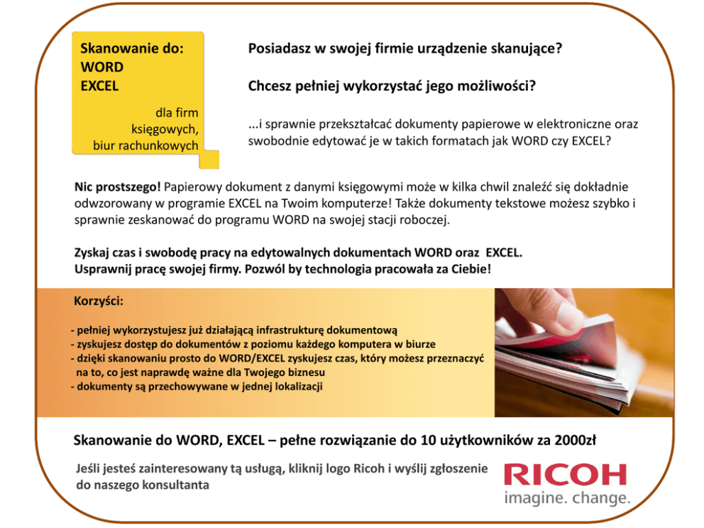 Skanowanie do: WORD EXCEL dla firm księgowych, biur rachunkowych Posiadasz w swojej firmie urządzenie skanujące? Chcesz pełniej wykorzystad jego możliwości? …i sprawnie przekształcad dokumenty papierowe w elektroniczne oraz swobodnie edytowad je w takich formatach jak WORD czy EXCEL? Nic prostszego! Papierowy dokument z danymi księgowymi może w kilka chwil znaleźd się dokładnie odwzorowany w programie EXCEL na Twoim komputerze! Także dokumenty tekstowe możesz szybko i sprawnie zeskanowad do programu WORD na swojej stacji roboczej. Zyskaj czas i swobodę pracy na edytowalnych dokumentach WORD oraz EXCEL. Usprawnij pracę swojej firmy. Pozwól by technologia pracowała za Ciebie! Korzyści: - pełniej wykorzystujesz już działającą infrastrukturę dokumentową - zyskujesz dostęp do dokumentów z poziomu każdego komputera w biurze - dzięki skanowaniu prosto do WORD/EXCEL zyskujesz czas, który możesz przeznaczyd na to, co jest naprawdę ważne dla Twojego biznesu - dokumenty są przechowywane w jednej lokalizacji Skanowanie do WORD, EXCEL – pełne rozwiązanie do 10 użytkowników za 2000zł Jeśli jesteś zainteresowany tą usługą, kliknij logo Ricoh i wyślij zgłoszenie do naszego konsultanta
