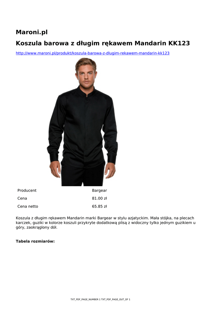 Maroni.pl Koszula barowa z długim rękawem Mandarin KK123 http://www.maroni.pl/produkt/koszula-barowa-z-dlugim-rekawem-mandarin-kk123 Producent Bargear Cena 81.00 zł Cena netto 65.85 zł Koszula z długim rękawem Mandarin marki Bargear w stylu azjatyckim. Mała stójka, na plecach karczek, guziki w kolorze koszuli przykryte dodatkową plisą z widoczny tylko jednym guzikiem u góry, zaokrąglony dół. Tabela rozmiarów: TXT_PDF_PAGE_NUMBER 1 TXT_PDF_PAGE_OUT_OF 1