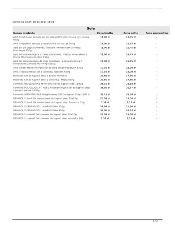 Cennik na dzień: 08-03-2017 18:19 Sole Nazwa produktu Cena brutto Cena netto Cena poprzednia APIS Fresh Lime terApis sól do stóp potliwych z trawą cytrynową 650g 19,00 zł 15,45 zł - APIS Grapefruit terApis grejpfrutowa sól do rąk 300g 19,00 zł 15,45 zł - Apis sól do stóp z lawendą, lotosem i minerałami z Morza Martwego 650g 19,00 zł 15,45 zł - Apis Sól odświeżająca z trawą cytrynową, miętą i minerałami z Morza Martwego do stóp 650g 19,00 zł 15,45 zł - Apis sól zmiękczająca do stóp miodowo - pomarańczowa z minerałami z Morza Martwego 650g 19,00 zł 15,45 zł - APIS Sweet Honey terApis sól do stóp zrogowaciałych 650g 17,10 zł 13,90 zł - APIS Tropical Relax sól z lawendą, lotosem 650g 17,10 zł 13,90 zł - Bielenda Sól do Kąpieli Stóp z Kozim Mlekiem 21,60 zł 17,56 zł - Bielenda Sól do Kąpieli Stóp z Limonką i Miętą 600g 21,60 zł 17,56 zł - Farmona NIVELAZIONE Mineralna sól do kąpieli stóp 1500g 35,15 zł 28,58 zł - Farmona PODOLOGIC FITNESS Antybakteryjna sól do kąpieli stóp z jonami srebra 1400g 38,95 zł 31,67 zł - Farmona SMOOTH FEET Grejpfrutowa Sól Do Kąpieli Stóp 1500 G 35,15 zł 28,58 zł - GEHWOL Fubad Sól lawendowa do kąpieli stóp 10x20g 23,99 zł 19,50 zł - 2,59 zł 2,11 zł - GEHWOL FUSSBAD SÓL LAWENDOWA 250g 26,99 zł 21,94 zł - GEHWOL FUSSBAD SÓL LAWENDOWA 400g 33,00 zł 26,83 zł - GEHWOL Fusskraft Sól ziołowa do kąpieli stóp 10x20g 23,99 zł 19,50 zł - 2,59 zł 2,11 zł - GEHWOL Fubad Sól lawendowa do kąpieli stóp Saszetka 20g GEHWOL Fusskraft Sól ziołowa do kąpieli stóp saszetka 20g 1/1 Powered by TCPDF (www.tcpdf.org)