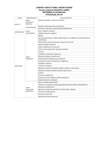 ZAWODY DEFICYTOWE I NADWYŻKOWE Powiat świdnicki (DOLNOŚLĄSKIE) INFORMACJA SYGNALNA I PÓŁROCZE 2015 R. Sekcja DEFICYT Zaklasyfikowanie zawód maksymalnie deficytowy zawód deficytowy RÓWNOWAGA zawód zrównoważony Grupa elementarna Kierownicy produkcji w rolnictwie i leśnictwie Robotnicy wykonujący proste prace polowe Pracownicy usług ochrony gdzie indziej niesklasyfikowani Gońcy, bagażowi i pokrewni Układacze towarów na półkach Dekarze Nauczyciele gimnazjów i szkół ponadgimnazjalnych (z wyjątkiem nauczycieli kształcenia zawodowego) Średni personel ochrony środowiska, medycyny pracy i bhp Malarze budowlani i pokrewni Kowale i operatorzy pras kuźniczych Technicy nauk chemicznych, fizycznych i pokrewni Chemicy Posadzkarze, parkieciarze i glazurnicy zawód nadwyżkowy Mistrzowie produkcji w budownictwie Średni personel z dziedziny prawa i pokrewny Pracownicy do spraw rachunkowości i księgowości Zamiatacze i pokrewni Archiwiści i muzealnicy NADWYŻKA Operatorzy urządzeń do produkcji wyrobów szklanych i ceramicznych Operatorzy maszyn do produkcji wyrobów papierniczych Drukarze Pracownicy działów kadr Kierownicy do spraw logistyki i dziedzin pokrewnych Doradcy finansowi i inwestycyjni Agenci sprzedaży bezpośredniej Kierownicy w instytucjach usług wyspecjalizowanych gdzie indziej niesklasyfikowani zawód maksymalnie nadwyżkowy Monterzy linii elektrycznych Operatorzy urządzeń do rejestracji i transmisji obrazu i dźwięku Technicy sieci internetowych Kierownicy w górnictwie Specjaliści do spraw społecznych