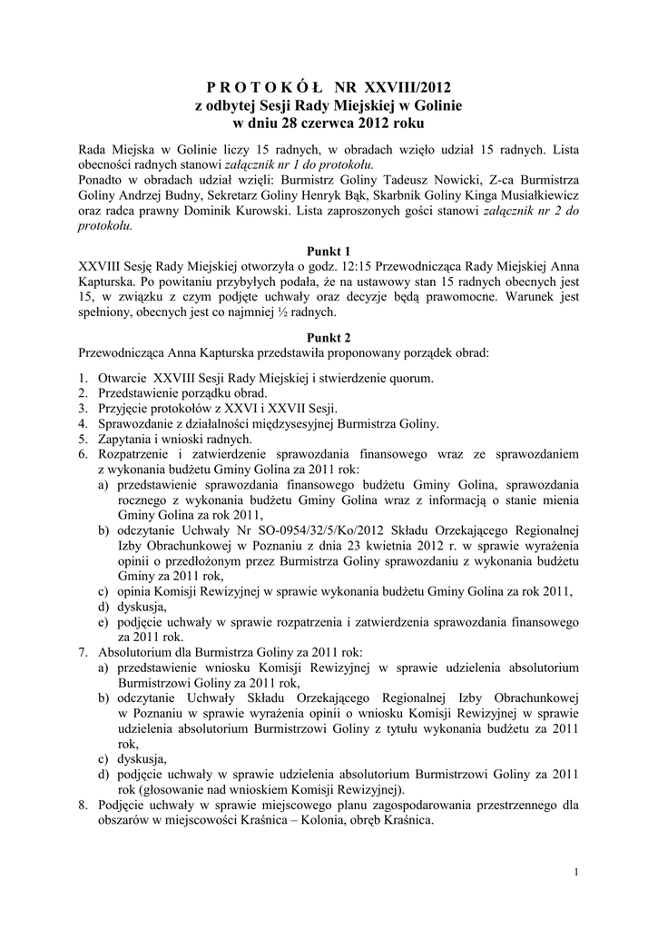P R O T O K Ó Ł NR XXVIII/2012 z odbytej Sesji Rady Miejskiej w Golinie w dniu 28 czerwca 2012 roku Rada Miejska w Golinie liczy 15 radnych, w obradach wzięło udział 15 radnych. Lista obecności radnych stanowi załącznik nr 1 do protokołu. Ponadto w obradach udział wzięli: Burmistrz Goliny Tadeusz Nowicki, Z-ca Burmistrza Goliny Andrzej Budny, Sekretarz Goliny Henryk Bąk, Skarbnik Goliny Kinga Musiałkiewicz oraz radca prawny Dominik Kurowski. Lista zaproszonych gości stanowi załącznik nr 2 do protokołu. Punkt 1 XXVIII Sesję Rady Miejskiej otworzyła o godz. 12:15 Przewodnicząca Rady Miejskiej Anna Kapturska. Po powitaniu przybyłych podała, że na ustawowy stan 15 radnych obecnych jest 15, w związku z czym podjęte uchwały oraz decyzje będą prawomocne. Warunek jest spełniony, obecnych jest co najmniej ½ radnych. Punkt 2 Przewodnicząca Anna Kapturska przedstawiła proponowany porządek obrad: 1. 2. 3. 4. 5. 6. Otwarcie XXVIII Sesji Rady Miejskiej i stwierdzenie quorum. Przedstawienie porządku obrad. Przyjęcie protokołów z XXVI i XXVII Sesji. Sprawozdanie z działalności międzysesyjnej Burmistrza Goliny. Zapytania i wnioski radnych. Rozpatrzenie i zatwierdzenie sprawozdania finansowego wraz ze sprawozdaniem z wykonania budżetu Gminy Golina za 2011 rok: a) przedstawienie sprawozdania finansowego budżetu Gminy Golina, sprawozdania rocznego z wykonania budżetu Gminy Golina wraz z informacją o stanie mienia Gminy Golina za rok 2011, b) odczytanie Uchwały Nr SO-0954/32/5/Ko/2012 Składu Orzekającego Regionalnej Izby Obrachunkowej w Poznaniu z dnia 23 kwietnia 2012 r. w sprawie wyrażenia opinii o przedłożonym przez Burmistrza Goliny sprawozdaniu z wykonania budżetu Gminy za 2011 rok, c) opinia Komisji Rewizyjnej w sprawie wykonania budżetu Gminy Golina za rok 2011, d) dyskusja, e) podjęcie uchwały w sprawie rozpatrzenia i zatwierdzenia sprawozdania finansowego za 2011 rok. 7. Absolutorium dla Burmistrza Goliny za 2011 rok: a) przedstawienie wniosku Komisji Rewizyjnej w sprawie udzielenia absolutorium Burmistrzowi Goliny za 2011 rok, b) odczytanie Uchwały Składu Orzekającego Regionalnej Izby Obrachunkowej w Poznaniu w sprawie wyrażenia opinii o wniosku Komisji Rewizyjnej w sprawie udzielenia absolutorium Burmistrzowi Goliny z tytułu wykonania budżetu za 2011 rok, c) dyskusja, d) podjęcie uchwały w sprawie udzielenia absolutorium Burmistrzowi Goliny za 2011 rok (głosowanie nad wnioskiem Komisji Rewizyjnej). 8. Podjęcie uchwały w sprawie miejscowego planu zagospodarowania przestrzennego dla obszarów w miejscowości Kraśnica – Kolonia, obręb Kraśnica. 1 9. Podjęcie uchwały w sprawie określenia zasad dzierżawy nieruchomości rolnych na czas oznaczony dłuższy niż 3 lata (projekt radnego Krzysztofa Michalaka). 10. Przedstawienie protokołu z kontroli przeprowadzonej przez Komisję Rewizyjną za II kwartał 2012 roku. 11. Udzielenie odpowiedzi na zapytania i wnioski radnych. 12. Zapytania i wolne wnioski. 13. Zakończenie XXVIII Sesji Rady Miejskiej w Golinie. Burmistrz Goliny T. Nowicki złożył wniosek o poszerzenie porządku obrad sesji o podjęcie uchwały w sprawie wyrażenia zgody na wydzierżawienie Zakładowi Usług Wodnych Sp. z o.o. w Koninie urządzeń zbiorowego zaopatrzenia w wodę i odprowadzania ścieków, stanowiących własność Gminy Golina, położonych na terenie Gminy Golina w trybie bezprzetargowym. Przewodnicząca Rady A. Kapturska zarządziła głosowanie nad złożonym wnioskiem przez Burmistrza Goliny T. Nowickiego. W głosowaniu jawnym udział wzięło 15 radnych. Za głosowało 11 radnych, przeciw – 2 radnych, od głosu wstrzymało się 2 radnych. W związku z powyższym wniosek Burmistrza Goliny T. Nowickiego został przyjęty przez radnych. Porządek obrad XXVIII sesji Rady Miejskiej w Golinie po wprowadzeniu zmiany przedstawia się następująco: 1. 2. 3. 4. 5. 6. Otwarcie XXVIII Sesji Rady Miejskiej i stwierdzenie quorum. Przedstawienie porządku obrad. Przyjęcie protokołów z XXVI i XXVII Sesji. Sprawozdanie z działalności międzysesyjnej Burmistrza Goliny. Zapytania i wnioski radnych. Rozpatrzenie i zatwierdzenie sprawozdania finansowego wraz ze sprawozdaniem z wykonania budżetu Gminy Golina za 2011 rok: a) przedstawienie sprawozdania finansowego budżetu Gminy Golina, sprawozdania rocznego z wykonania budżetu Gminy Golina wraz z informacją o stanie mienia Gminy Golina za rok 2011, b) odczytanie Uchwały Nr SO-0954/32/5/Ko/2012 Składu Orzekającego Regionalnej Izby Obrachunkowej w Poznaniu z dnia 23 kwietnia 2012 r. w sprawie wyrażenia opinii o przedłożonym przez Burmistrza Goliny sprawozdaniu z wykonania budżetu Gminy za 2011 rok, c) opinia Komisji Rewizyjnej w sprawie wykonania budżetu Gminy Golina za rok 2011, d) dyskusja, e) podjęcie uchwały w sprawie rozpatrzenia i zatwierdzenia sprawozdania finansowego za 2011 rok. 7. Absolutorium dla Burmistrza Goliny za 2011 rok: a) przedstawienie wniosku Komisji Rewizyjnej w sprawie udzielenia absolutorium Burmistrzowi Goliny za 2011 rok, b) odczytanie Uchwały Składu Orzekającego Regionalnej Izby Obrachunkowej w Poznaniu w sprawie wyrażenia opinii o wniosku Komisji Rewizyjnej w sprawie udzielenia absolutorium Burmistrzowi Goliny z tytułu wykonania budżetu za 2011 rok, c) dyskusja, 2 d) podjęcie uchwały w sprawie udzielenia absolutorium Burmistrzowi Goliny za 2011 rok (głosowanie nad wnioskiem Komisji Rewizyjnej). 8. Podjęcie uchwały w sprawie miejscowego planu zagospodarowania przestrzennego dla obszarów w miejscowości Kraśnica – Kolonia, obręb Kraśnica. 9. Podjęcie uchwały w sprawie określenia zasad dzierżawy nieruchomości rolnych na czas oznaczony dłuższy niż 3 lata (projekt radnego Krzysztofa Michalaka). 10. Podjęcie uchwały w sprawie wyrażenia zgody na wydzierżawienie Zakładowi Usług Wodnych Sp. z o.o. w Koninie urządzeń zbiorowego zaopatrzenia w wodę i odprowadzania ścieków, stanowiących własność