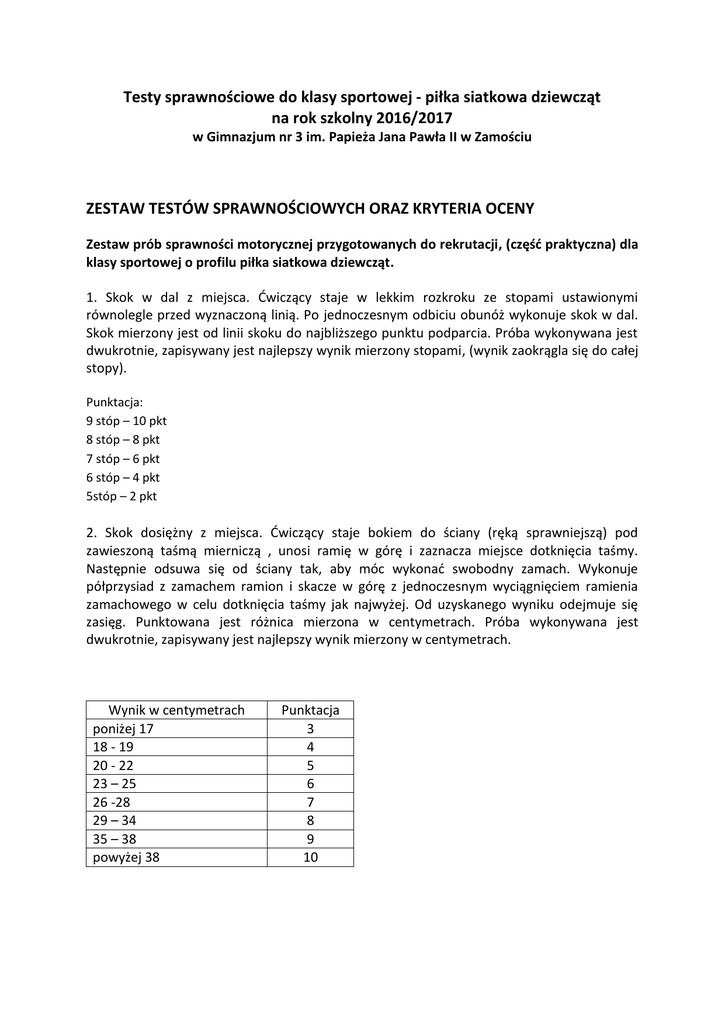 Testy sprawnościowe do klasy sportowej - piłka siatkowa dziewcząt na rok szkolny 2016/2017 w Gimnazjum nr 3 im. Papieża Jana Pawła II w Zamościu ZESTAW TESTÓW SPRAWNOŚCIOWYCH ORAZ KRYTERIA OCENY Zestaw prób sprawności motorycznej przygotowanych do rekrutacji, (część praktyczna) dla klasy sportowej o profilu piłka siatkowa dziewcząt. 1. Skok w dal z miejsca. Ćwiczący staje w lekkim rozkroku ze stopami ustawionymi równolegle przed wyznaczoną linią. Po jednoczesnym odbiciu obunóż wykonuje skok w dal. Skok mierzony jest od linii skoku do najbliższego punktu podparcia. Próba wykonywana jest dwukrotnie, zapisywany jest najlepszy wynik mierzony stopami, (wynik zaokrągla się do całej stopy). Punktacja: 9 stóp – 10 pkt 8 stóp – 8 pkt 7 stóp – 6 pkt 6 stóp – 4 pkt 5stóp – 2 pkt 2. Skok dosiężny z miejsca. Ćwiczący staje bokiem do ściany (ręką sprawniejszą) pod zawieszoną taśmą mierniczą , unosi ramię w górę i zaznacza miejsce dotknięcia taśmy. Następnie odsuwa się od ściany tak, aby móc wykonać swobodny zamach. Wykonuje półprzysiad z zamachem ramion i skacze w górę z jednoczesnym wyciągnięciem ramienia zamachowego w celu dotknięcia taśmy jak najwyżej. Od uzyskanego wyniku odejmuje się zasięg. Punktowana jest różnica mierzona w centymetrach. Próba wykonywana jest dwukrotnie, zapisywany jest najlepszy wynik mierzony w centymetrach. Wynik w centymetrach poniżej 17 18 - 19 20 - 22 23 – 25 26 -28 29 – 34 35 – 38 powyżej 38 Punktacja 3 4 5 6 7 8 9 10 3. Rzut piłką lekarską 2 kg w przód. Ćwiczący klęczy w lekkim rozkroku przodem do kierunku rzutu – piłka trzymana oburącz za głową w dłoniach. Wyrzut piłki z padem w przód na materac /odległość/. Wykonywane są dwie próby, zapisywany jest lepszy wynik mierzony w metrach. Punktacja: powyżej 6,6 m – 10 pkt 6,1 m – 6,5 m– 8 pkt 5,6 m – 6,0 m - 6 pkt 5,0 m – 5,5 m - 4 pkt Poniżej 5 m – 2 pkt 4. Szybkość – szybkość ruchu ze zmianą kierunku biegu. Bieg ciągły na odcinku 6 m. Sposób wykonania: zawodnik biegnie 8 razy (4 razy przodem i 4 razy tyłem). Za każdym razem musi dotknąć obiema nogami linii wyznaczających dystans próby. Zawodnik wykonuje dwie próby, ocenie podlega lepszy wynik. Wynik w sekundach powyżej 21,31 20, 30 – 21,30 19,81 – 20,30 19,21 – 19,80 18,31 – 19,20 17,81 – 18, 30 17,31 – 17, 80 poniżej 17,30 Punktacja 3 4 5 6 7 8 9 10 Zestaw prób umiejętności z piłki siatkowej przygotowanych do rekrutacji – (część praktyczna) dla klasy sportowej o profilu piłka siatkowa dziewcząt. 5. Odbicia piłki sposobem oburącz górnym. Ćwiczący w kole o średnicy 3m przyjmuje postawę siatkarską. Odbija piłkę sposobem oburącz górnym. Postawa siatkarska – 2 pkt Ilość Poniże 5 10 15 20 25 30 35 Powyżej Punkty 3 4 5 6 7 8 9 10 6. Odbicia piłki sposobem oburącz dolnym. Ćwiczący w kole o średnicy 3m przyjmuje postawę siatkarską. Odbija piłkę sposobem oburącz dolnym. Postawa siatkarska – 2 pkt Ilość Poniżej 5 10 15 20 25 30 35 Powyżej Punkty 3 4 5 6 7 8 9 10 Postanowienia końcowe: 1. O przyjęciu do klasy sportowej decyduje komisja rekrutacyjna na podstawie zdobytych punktów. 2. W indywidualnych przypadkach decyduje dyrektor szkoły.