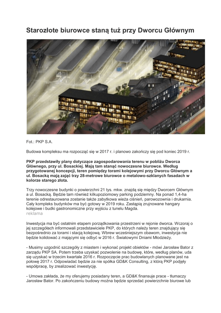 Starozłote biurowce staną tuż przy Dworcu Głównym Fot.: PKP S.A. Budowa kompleksu ma rozpocząć się w 2017 r. i planowo zakończy się pod koniec 2019 r. PKP przedstawiły plany dotyczące zagospodarowania terenu w pobliżu Dworca Głównego, przy ul. Bosackiej. Mają tam stanąć nowoczesne biurowce. Według przygotowanej koncepcji, teren pomiędzy torami kolejowymi przy Dworcu Głównym a ul. Bosacką mają zająć trzy 28-metrowe biurowce o metalowo-szklanych fasadach w kolorze starego złota. Trzy nowoczesne budynki o powierzchni 21 tys. mkw. znajdą się między Dworcem Głównym a ul. Bosacką. Będzie tam również kilkupoziomowy parking podziemny. Na ponad 1,4-ha terenie odrestaurowana zostanie także zabytkowa wieża ciśnień, parowozownia i drukarnia. Cały kompleks budynków ma być gotowy w 2019 roku. Zastąpią zrujnowane hangary kolejowe i budki gastronomiczne przy wyjściu z tunelu Magda. reklama Inwestycja ma być ostatnim etapem porządkowania przestrzeni w rejonie dworca. Wczoraj o jej szczegółach informowali przedstawiciele PKP, do których należy teren znajdujący się bezpośrednio za torami i stacją kolejową. Wbrew wcześniejszym obawom, inwestycja nie będzie kolidować z mającymi się odbyć w 2016 r. Światowymi Dniami Młodzieży. - Musimy uzgodnić szczegóły z miastem i wykonać projekt obiektów - mówi Jarosław Bator z zarządu PKP SA. Potem trzeba uzyskać pozwolenie na budowę, które, według planów, uda się uzyskać w trzecim kwartale 2016 r. Rozpoczęcie prac budowlanych planowane jest na połowę 2017 r. Odpowiadać będzie za nie spółka GD&K Consulting, z którą PKP podjęły współpracę, by zrealizować inwestycję. - Umowa zakłada, że my oferujemy posiadany teren, a GD&K finansuje prace - tłumaczy Jarosław Bator. Po zakończeniu budowy można będzie sprzedać powierzchnie biurowe lub czerpać zyski z ich wynajmu. Inwestycja będzie prowadzona w dwóch etapach. W pierwszym (który ma zakończyć się pod koniec 2018 r.) powstaną dwa nowoczesne budynki biurowe wraz z podziemnym garażem. Jeden z nich będzie częściowo zlokalizowany nad płytą Małopolskiego Dworca Autobusowego. W drugim etapie przewidziana jest budowa jednego biurowca i przebudowa trzech starych budynków. - Szacujemy, że cała inwestycja zostanie ukończona pod koniec 2019 r. i będzie kosztować od 250 do 300 mln złotych. Trzeba pamiętać, że to praktycznie ostatnia tak duża wolna działka w bliskim sąsiedztwie Rynku Głównego. Potencjał tego miejsca jest więc ogromny przekonuje Henryk Gaertner, przedstawiciel spółki GD&K Consulting. Oprócz biur, w kompleksie znajdą się także powierzchnie handlowe oraz obiekty gastronomiczne. Ostatecznie zrezygnowano z pomysłu, aby zlokalizować tu także część hotelową. Głównie dlatego, że hotel ma w przyszłości powstać nad dworcem autobusowym. Przedstawiciele GD&K chcieliby za to, aby zostały tu zlokalizowane dodatkowe kasy, w których pasażerowie mogliby kupić bilet na pociąg. Podkreślają, że dzięki inwestycji poprzemysłowy teren rozciągający się na wschód od torów kolejowych, ul. Lubicz i wzdłuż parku Strzeleckiego prawie do ul. Lubomirskiego znów będzie służył mieszkańcom. Dopełnieniem inwestycji ma być nawet kilkukondygnacyjny parking podziemny na kilkaset miejsc - część z nich ma być ogólnodostępna. Obecnie na terenie przeznaczonym pod inwestycję znajdują się niszczejące magazyny. Trzy budynki znajdują się pod ochroną konserwatora zabytków. Są to: drukarnia, wieża ciśnień oraz budynek lokomotywowni. - Oczywiście zostaną one zachowane dla potomnych i zmodernizowane w porozumieniu z konserwatorem zabytków. W grę wchodzi otwarcie w nich restauracji - wyjaśnia Henryk Gaertner. Zanim prace budowlane ruszą, inwestorzy muszą także porozumieć się z miastem. Obecnie powstaje plan zagospodarowania przestrzennego dla obszaru, na którym ma powstać inwestycja. Dopiero od jego zapisów zależy, jaki kształt ostatecznie będzie mieć inwestycja. Biurowce przy ul. Bosackiej to niejedyna inwestycja GD&K Consulting w Krakowie. Firma jest także współudziałowcem w spółce Treimorfa, która kupiła i chce dokończyć budowę szkieletora przy rondzie Mogilskim. Wczoraj jej przedstawiciel potwierdził, że prace przy rozbiórce części obecnej konstrukcji (wybudowanej z myślą o celach konferencyjnych, których nie przewiduje nowy projekt) rozpoczną się prawdopodobnie jesienią tego roku, natomiast na początku 2016 r. na plac budowy wjedzie ciężki sprzęt budowlany. - Mamy prawomocne pozwolenie na budowę. Wykonawcę chcemy wybrać w ciągu dwóchtrzech miesięcy. Inwestycja mogłaby więc ruszyć na początku przyszłego roku - mówi Henryk Gaertner z firmy GD&K. Jeżeli wszystko pójdzie zgodnie z planem, to wieżowiec powinien być gotowy do końca 2017 roku. Źródło: Gazeta Krakowska Marcin Karkosza opublikował: piotr_blonski