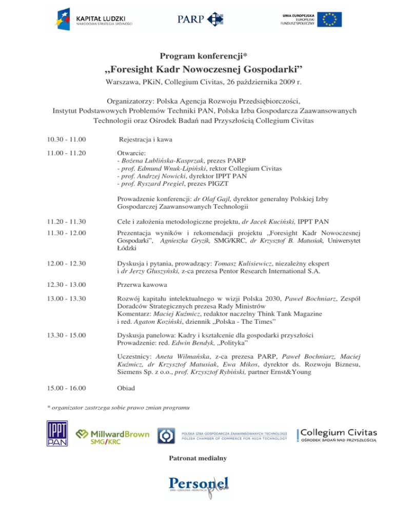 Program konferencji* „Foresight Kadr Nowoczesnej Gospodarki” Warszawa, PKiN, Collegium Civitas, 26 października 2009 r. Organizatorzy: Polska Agencja Rozwoju Przedsiębiorczości, Instytut Podstawowych Problemów Techniki PAN, Polska Izba Gospodarcza Zaawansowanych Technologii oraz Ośrodek Badań nad Przyszłością Collegium Civitas 10.30 - 11.00 Rejestracja i kawa 11.00 - 11.20 Otwarcie: - Bożena Lublińska-Kasprzak, prezes PARP - prof. Edmund Wnuk-Lipiński, rektor Collegium Civitas - prof. Andrzej Nowicki, dyrektor IPPT PAN - prof. Ryszard Pregiel, prezes PIGZT Prowadzenie konferencji: dr Olaf Gajl, dyrektor generalny Polskiej Izby Gospodarczej Zaawansowanych Technologii 11.20 - 11.30 Cele i założenia metodologiczne projektu, dr Jacek Kuciński, IPPT PAN 11.30 - 12.00 Prezentacja wyników i rekomendacji projektu „Foresight Kadr Nowoczesnej Gospodarki”, Agnieszka Gryzik, SMG/KRC, dr Krzysztof B. Matusiak, Uniwersytet Łódzki 12.00 - 12.30 Dyskusja i pytania, prowadzący: Tomasz Kulisiewicz, niezależny ekspert i dr Jerzy Głuszyński, z-ca prezesa Pentor Research International S.A. 12.30 - 13.00 Przerwa kawowa 13.00 - 13.30 Rozwój kapitału intelektualnego w wizji Polska 2030, Paweł Bochniarz, Zespół Doradców Strategicznych prezesa Rady Ministrów Komentarz: Maciej Kuźmicz, redaktor naczelny Think Tank Magazine i red. Agaton Koziński, dziennik „Polska - The Times” 13.30 - 15.00 Dyskusja panelowa: Kadry i kształcenie dla gospodarki przyszłości Prowadzenie: red. Edwin Bendyk, „Polityka” Uczestnicy: Aneta Wilmańska, z-ca prezesa PARP, Paweł Bochniarz, Maciej Kuźmicz, dr Krzysztof Matusiak, Ewa Mikos, dyrektor ds. Rozwoju Biznesu, Siemens Sp. z o.o., prof. Krzysztof Rybiński, partner Ernst&Young 15.00 - 16.00 Obiad * organizator zastrzega sobie prawo zmian programu Patronat medialny