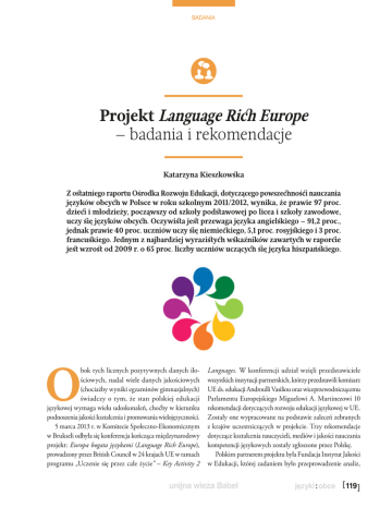 badania Projekt Language Rich Europe – badania i rekomendacje Katarzyna Kieszkowska Z ostatniego raportu Ośrodka Rozwoju Edukacji, dotyczącego powszechności nauczania języków obcych w Polsce w roku szkolnym 2011/2012, wynika, że prawie 97 proc. dzieci i młodzieży, począwszy od szkoły podstawowej po licea i szkoły zawodowe, uczy się języków obcych. Oczywista jest przewaga języka angielskiego – 91,2 proc., jednak prawie 40 proc. uczniów uczy się niemieckiego, 5,1 proc. rosyjskiego i 3 proc. francuskiego. Jednym z najbardziej wyrazistych wskaźników zawartych w raporcie jest wzrost od 2009 r. o 65 proc. liczby uczniów uczących się języka hiszpańskiego. O bok tych licznych pozytywnych danych ilościowych, nadal wiele danych jakościowych (chociażby wyniki egzaminów gimnazjalnych) świadczy o tym, że stan polskiej edukacji językowej wymaga wielu udoskonaleń, choćby w kierunku podnoszenia jakości kształcenia i promowania wielojęzyczności. 5 marca 2013 r. w Komitecie Społeczno-Ekonomicznym w Brukseli odbyła się konferencja kończąca międzynarodowy projekt: Europa bogata językami (Language Rich Europe), prowadzony przez British Council w 24 krajach UE w ramach programu „Uczenie się przez całe życie” – Key Activity 2 Languages. W konferencji udział wzięli przedstawiciele wszystkich instytucji partnerskich, którzy przedstawili komisarz UE ds. edukacji Androulli Vasiliou oraz wiceprzewodniczącemu Parlamentu Europejskiego Miguelowi A. Martinezowi 10 rekomendacji dotyczących rozwoju edukacji językowej w UE. Zostały one wypracowane na podstawie zaleceń zebranych z krajów uczestniczących w projekcie. Trzy rekomendacje dotyczące kształcenia nauczycieli, mediów i jakości nauczania kompetencji językowych zostały zgłoszone przez Polskę. Polskim partnerem projektu była Fundacja Instytut Jakości w Edukacji, której zadaniem było przeprowadzenie analiz, unijna wieża Babel [ 119 ] badania mających na celu zbadanie strategii językowej w Polsce, porównanie jej z politykami językowymi państw uczestniczących w projekcie i odniesienie ich do istniejących rekomendacji europejskich. Przedmiotem badania była wielojęzyczność oraz obecność języków regionalnych i mniejszościowych w czterech obszarach: edukacja, media, instytucje publiczne, biznes. Wyniki badań LRE w Polsce, ogłoszone pod koniec roku 2012, wykazały, że, parafrazując tytuł projektu: Polska jest bogata językami, nie istnieje żadna jednolita strategia zarządzania wielojęzycznością. Oficjalne informacje na temat polityki językowej można uzyskać z Głównego Urzędu Statystycznego, MEN, MSWiN, jak również z wielu stron internetowych międzynarodowych projektów. Publikacja GUS pt. Oświata i Wychowanie w roku szkolnym 2011/2012 zawiera dane dotyczące wszystkich aspektów edukacji, w tym nauki języków regionalnych/mniejszościowych i obcych. Dodatkowym zadaniem fundacji w ramach prowadzonego projektu LRE na terenie Polski było stworzenie sieci decydentów i ekspertów zainteresowanych wdrożeniem zmian w polityce oraz strategii językowej w celu zapewnienia rozwoju społeczeństwa wielojęzycznego. W czasie trzech bardzo intensywnych warsztatów zaproponowano rekomendacje dotyczące kształcenia nauczycieli języków obcych, nauki języków na wyższych uczelniach, wspierania kształcenia językowego przez media oraz edukacji językowej w przedszkolach. Rekomendacje dotyczące kształcenia nauczycieli języków obcych A. Uspójnienie systemu kształcenia nauczycieli języków obcych; B. Podniesienie poziomu znajomości przez nauczycieli języka przez nich nauczanego; C. Rozwój świadomości językowej decydentów oświaty, nauczycieli, uczniów poprzez wdrażanie działań mających na celu podkreślenie korzyści, płynących z uczenia się i znajomości języków obcych, zwrócenie uwagi na efektywniejsze kształcenie nauczycieli oraz wprowadzenie zmian do programów nauczania i wymagań egzaminacyjnych. Rekomendacje dotyczące nauki języków obcych na wyższych uczelniach A. Zmiana podejścia władz uniwersyteckich do lektoratów językowych i przekonanie ich, że: yy język to nie wiedza, tylko sprawność, czyli narzędzie do pozyskiwania tej wiedzy. Rozróżnienie to jest istotne [ 120 ] z punktu widzenia organizacji i częstotliwości zajęć, liczby godzin, liczby studentów w grupach itp.; yy lektorat to nie tylko nauczanie i uczenie się języka jako środka komunikacji, ale również poznawanie kultury danego kraju, a także zdobywanie niezbędnych w życiu akademickim i zawodowym umiejętności miękkich (prezentacja, negocjacje itp.); yy lektoraty języków obcych są w programach studiów w wielu krajach europejskich, takich jak np. Holandia, Niemcy czy Finlandia, czyli krajach aspirujących do miana europejskich liderów w nauce i technice; B. Postulaty dotyczące organizacji toku studiów, obejmujące: yy prawo do uczenia się dwóch języków na studiach uniwersyteckich; yy czasu trwania kursu danego języka uwarunkowanego: charakterem lektoratu (język ogólny, specjalistyczny, akademicki), poziomem zaawansowania kandydatów na poszczególne zajęcia językowe oraz zakładanymi efektami kształcenia, zgodnymi z wytycznymi zawartymi w stosownych dokumentach, np. Krajowe Ramy Kwalifikacji. C. Postulaty dotyczące kadry uniwersyteckiej: yy zachowanie statusu nauczyciela akademickiego dla lektorów; yy niedopuszczanie do outsourcingu w nauczaniu języków na uczelni. Nauczyciel na uczelni uczy języka specjalistycznego (leksyka) oraz charakterystycznych dla świata akademickiego sprawności i funkcji językowych; yy ze względu na internacjonalizację szkolnictwa wyższego, uwzględnianie konieczności znajomości języków obcych przez nauczycieli akademickich; D. Włączenie oceny zajęć językowych prowadzonych na uczelniach do procesu akredytacji kierunków studiów. Rekomendacje dotyczące włączenia tematyki związanej z edukacj