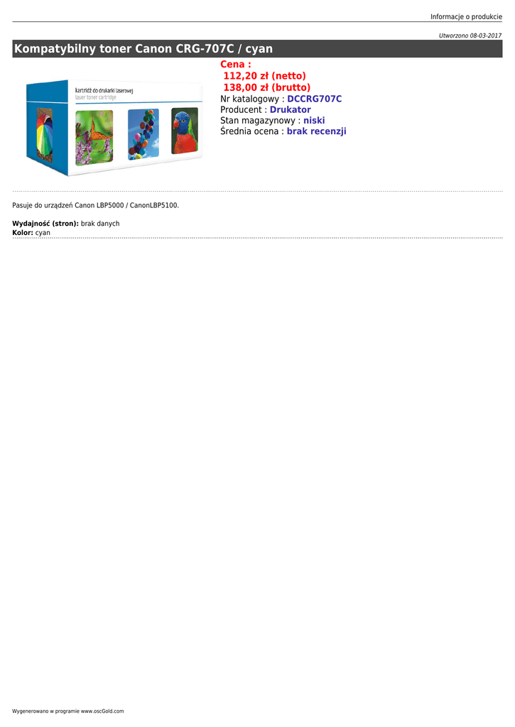 Informacje o produkcie Utworzono 08-03-2017 Kompatybilny toner Canon CRG-707C / cyan Cena : 112,20 zł (netto) 138,00 zł (brutto) Nr katalogowy : DCCRG707C Producent : Drukator Stan magazynowy : niski Średnia ocena : brak recenzji Pasuje do urządzeń Canon LBP5000 / CanonLBP5100. Wydajność (stron): brak danych Kolor: cyan Wygenerowano w programie www.oscGold.com