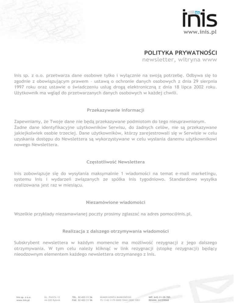 www.inis.pl POLITYKA PRYWATNOŚCI newsletter, witryna www Inis sp. z o.o. przetwarza dane osobowe tylko i wyłącznie na swoją potrzebę. Odbywa się to zgodnie z obowiązującym prawem – ustawą o ochronie danych osobowych z dnia 29 sierpnia 1997 roku oraz ustawie o świadczeniu usług drogą elektroniczną z dnia 18 lipca 2002 roku. Użytkownik ma wgląd do przetwarzanych danych osobowych w każdej chwili. Przekazywanie informacji Zapewniamy, że Twoje dane nie będą przekazywane podmiotom do tego nieuprawnionym. Żadne dane identyfikacyjne użytkowników Serwisu, do żadnych celów, nie są przekazywane jakiejkolwiek osobie trzeciej. Dane użytkowników, którzy zarejestrowali się w Serwisie w celu uzyskania dostępu do Newslettera są wykorzystywane w celu wysłania danemu użytkownikowi nowego Newslettera. Częstotliwość Newslettera Inis zobowiązuje się do wysyłania maksymalnie 1 wiadomości na temat e-mail marketingu, systemu Inis i wydarzeń związanych ze spółka Inis tygodniowo. Standardowo wysyłka realizowana jest raz w miesiącu. Niezamówione wiadomości Wszelkie przykłady niezamawianej poczty prosimy zgłaszać na adres [email protected]. Realizacja z dalszego otrzymywania wiadomości Subskrybent newslettera w każdym momencie ma możliwość rezygnacji z jego dalszego otrzymywania. W tym celu należy kliknąć w link rezygnacji (stopkę rezygnacji) będący nieodzownym elementem każdego newslettera otrzymanego z Inis. Inis sp. z o.o. www.inis.pl UL. PIASTA 12 44-200 Rybnik TEL. 32 433 11 56 FAX 32 433 11 56 NUMER KONTA BANKOWEGO: 75 1140 1179 0000 5960 2900 1001 NIP: 642-31-28-785 REGON: 24159068 www.inis.pl Pliki Cookies Inis przechowuje pliki cookies, w których znajdują się informacje niezbędne do prawidłowego funkcjonowania serwisu, między innymi do utrzymania sesji użytkownika i lepszego dopasowania serwisu do potrzeb użytkowników. Pliki cookies nie pozwalają na identyfikację użytkownika, za ich pomocą nie są również przetwarzane dane osobowe. Inis udostępnia każdemu użytkownikowi wgląd do swoich danych profilowych, a także możliwość ich modyfikacji. Zmiany polityki prywatności Inis sp. z o.o. zastrzega, iż w przyszłości może wprowadzić zmiany w Polityce Prywatności. Wraz z każdą zmianą nowa wersja Polityki Prywatności będzie się pojawiać w tym miejscu. Korzystając z serwisu po tej dacie użytkownik akceptuje zmiany w nowej wersji Polityki Prywatności. Jeżeli uznaliby Państwo, że w jakiś sposób przekroczona została Państwa prywatność, prosimy o kontakt mailowy z naszym serwisem – [email protected]. Inis sp. z o.o. www.inis.pl UL. PIASTA 12 44-200 Rybnik TEL. 32 433 11 56 FAX 32 433 11 56 NUMER KONTA BANKOWEGO: 75 1140 1179 0000 5960 2900 1001 NIP: 642-31-28-785 REGON: 24159068