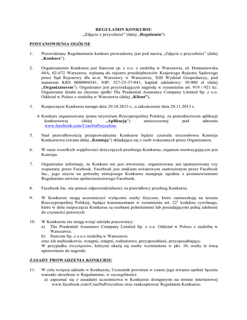 REGULAMIN KONKURSU „Zdjęcie z przyszłości” (dalej „Regulamin") POSTANOWIENIA OGÓLNE 1. Przewidziany Regulaminem konkurs prowadzony jest pod nazwą „Zdjęcie z przyszłości” (dalej „Konkurs”). 2. Organizatorem Konkursu jest Starcom sp. z o.o. z siedzibą w Warszawie, ul. Domaniewska 44A, 02-672 Warszawa, wpisaną do rejestru przedsiębiorców Krajowego Rejestru Sądowego przez Sąd Rejonowy dla m.st. Warszawy w Warszawie, XIII Wydział Gospodarczy, pod numerem KRS 0000004341, NIP: 527-23-37-041, kapitał zakładowy: 50 000 zł (dalej „Organizatorem”). Organizator jest przyrzekającym nagrodę w rozumieniu art. 919 i 921 kc. Organizator działa na zlecenie spółki The Prudential Assurance Company Limited Sp. z o.o. Oddział w Polsce z siedzibą w Warszawie (dalej „Klient”). 3. Rozpoczęcie Konkursu nastąpi dnia 29.10.2013 r., a zakończenie dnia 29.11.2013 r. 4. Konkurs organizowany jestna terytorium Rzeczpospolitej Polskiej, za pośrednictwem aplikacji konkursowej (dalej „Aplikacją”) umieszczonej pod adresem www.facebook.com/CzasNaPrzyszlosc. 5. Nad prawidłowością przeprowadzenia Konkursu będzie czuwała trzyosobowa Komisja Konkursowa (zwana dalej „Komisją”) składająca się z osób wskazanych przez Organizatora. 6. W razie wszelkich wątpliwości dotyczących przebiegu Konkursu, organem rozstrzygającym jest Komisja. 7. Organizator informuje, że Konkurs nie jest stworzony, organizowany ani sponsorowany czy wspierany przez Facebook. Facebook jest znakiem towarowym zastrzeżonym przez Facebook Inc., jego użycie na potrzeby niniejszego Konkursu następuje zgodnie z postanowieniami Regulaminu serwisu społecznościowego Facebook. 8. Facebook Inc. nie ponosi odpowiedzialności za prawidłowy przebieg Konkursu. 9. W Konkursie mogą uczestniczyć wyłącznie osoby fizyczne, które zamieszkują na terenie Rzeczypospolitej Polskiej, będące konsumentami w rozumieniu art. 221 kodeksu cywilnego, które w dniu rozpoczęcia Konkursu są osobami pełnoletnimi lub posiadającymi pełną zdolność do czynności prawnych. 10. W Konkursie nie mogą wziąć udziału pracownicy: a) The Prudential Assurance Company Limited Sp. z o.o. Oddział w Polsce z siedzibą w Warszawie; b) Starcom Sp. z o.o.z siedzibą w Warszawie oraz ich małżonkowie, wstępni, zstępni, rodzeństwo, przysposobieni, przysposabiający. W przypadku zwycięzców, którymi okażą się osoby wymienione w pkt. 10, osoby te tracą uprawnienie do nagrody. ZASADY PROWADZENIA KONKURSU 11. W celu wzięcia udziału w Konkursie, Uczestnik powinien w czasie jego trwania spełnić łącznie warunki określone w Regulaminie, w szczególności: a) zapoznać się z zasadami uczestnictwa w Konkursie dostępnymi na stronie internetowej www.facebook.com/CzasNaPrzyszlosc oraz zaakceptować Regulamin Konkursu; b) za pośrednictwem aplikacji Konkursowej, dostępnej pod adresem www.facebook.com/CzasNaPrzyszlosc lub poprzez publikację zdjęcia na Instagramie zawierającego w opisie hashtag konkursowy #konkursprudential, dodać zdjęcie swojego dziecka w stylizacji z przyszłości (dalej „Zadanie Konkursowe”). Regulamin zostaje zaakceptowany przez Uczestnika w momencie dodania zdjęcia swojego dziecka w stylizacji z przyszłości z hashtagiem konkursowym #konkursprudential. 12. Zadania Konkursowe zostaną umieszczone w publicznej galerii zdjęć dostępnej na stronie: www.facebook.com/CzasNaPrzyszlosc 13. Organizator zastrzega sobie prawo do wykluczenia z Konkursu zgłoszonego Zadania Konkursowego, w szczególności w przypadku: a) zawarcia w Zadaniu Konkursowym wulgaryzmów, zdjęć epatujących choćby częściowa nagością, treści obraźliwych, politycznych, propagandowych, religijnych lub treści sprzecznych z prawem; b) zawarcia w Zadaniu Konkursowym treści reklamowych dotyczących innych niż Organizator podmiotów; c) naruszenia jakichkolwiek praw osób trzecich, w tym w szczególności: dóbr osobistych i praw autorskich; d) gdy Uczestnik nie posiada praw autorskich lub praw zależnych do Zadania Konkursowego i jego wszystkich elementów w zakresie wskazanym w Regulaminie. 14. Uczestnik oświadcza i gwarantuje, że jest wyłącznie uprawniony do utworów fotograficznych, które stanowią Zadanie Konkursowe, a prawa do utworów nie są obciążone na rzecz osób trzecich. Ponadto, Uczestnik oświadcza i gwarantuje, że utwory nie naruszają jakichkolwiek praw osób trzecich oraz oświadcza, że uzyskał wszelkie prawa od osób przedstawionych na zdjęciu do wykorzystania ich wizerunków. 15. Uczestnik udziela Organizatorowi, w najszerszym dopuszczalnym przez prawo zakresie, upoważnienia do korzystania z utworów fotograficznych, które Uczestnik dodaje w Zadaniu Konkursowym, w całości lub we fragmentach, z modyfikacjami lub bez, tj. w zakresie autorskich praw majątkowych i praw zależnych, bez ograniczeń czasowych i terytorialnych, na wszystkich znanych w chwili udzielania zezwolenia pól eksploatacji, w szczególności: a) w zakresie utrwalania i zwielokrotniania Zadań Konkursowych lub ich poszczególnych elementów – wytwarzania wszelkimi znanymi technikami egzemplarzy Zadań Konkursowych, w tym techniką drukarską, reprograficzną, zapisu magnetycznego oraz techniką cyfrową, audiowizualną, wprowadzanie do pamięci komputera, utrwalanie i zwielokrotnianie na jakichkolwiek nośnikach, w szczególności na wszystkich nośnikach reklamowych, bez ograniczeń co do ilości i nakładu; b) w zakresie obrotu oryginałami albo egzemplarzami, na których Zadania Konkursowe utrwalono – wprowadzanie do obrotu, użyczenie lub najem oryginału albo egzemplarzy; c) w zakresie rozpowszechniania Zadań Konkursowych lub ich poszczególnych elementów w sposób inny niż określony w pkt b) – publiczne wykonanie, wystawienie, wyświetlenie, odtworzenie oraz nadawanie i reemitowanie przez stacje telewizyjne i radiowe w sposób analogowy i cyfrowy, nadanie za pomocą wizji przewodowej lub bezprzewod