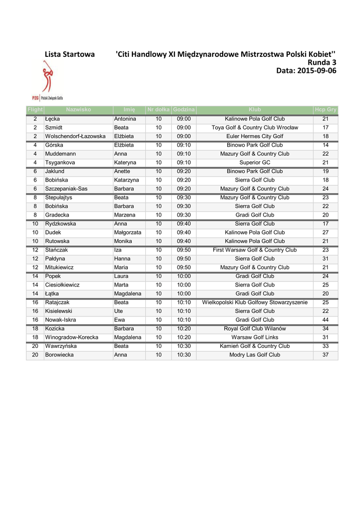 Lista Startowa Flight 'Citi Handlowy XI Międzynarodowe Mistrzostwa Polski Kobiet'' Runda 3 Data: 2015-09-06 Imię Nazwisko Nr dołka Godzina Klub Hcp Gry 2 Łęcka Antonina 10 09:00 Kalinowe Pola Golf Club 21 2 Szmidt Beata 10 09:00 Toya Golf & Country Club Wrocław 17 2 Wolschendorf-Łazowska Elżbieta 10 09:00 Euler Hermes City Golf 18 4 Górska Elżbieta 10 09:10 Binowo Park Golf Club 14 4 Muddemann Anna 10 09:10 Mazury Golf & Country Club 22 4 Tsygankova Kateryna 10 09:10 Superior GC 21 6 Jaklund Anette 10 09:20 Binowo Park Golf Club 19 6 Bobińska Katarzyna 10 09:20 Sierra Golf Club 18 6 Szczepaniak-Sas Barbara 10 09:20 Mazury Golf & Country Club 24 8 Stepułajtys Beata 10 09:30 Mazury Golf & Country Club 23 8 Bobińska Barbara 10 09:30 Sierra Golf Club 22 8 Gradecka Marzena 10 09:30 Gradi Golf Club 20 10 Rydzkowska Anna 10 09:40 Sierra Golf Club 17 10 Dudek Małgorzata 10 09:40 Kalinowe Pola Golf Club 27 10 Rutowska Monika 10 09:40 Kalinowe Pola Golf Club 21 12 Stańczak Iza 10 09:50 First Warsaw Golf & Country Club 23 12 Pałdyna Hanna 10 09:50 Sierra Golf Club 31 12 Mitukiewicz Maria 10 09:50 Mazury Golf & Country Club 21 14 Popek Laura 10 10:00 Gradi Golf Club 24 14 Ciesiołkiewicz Marta 10 10:00 Sierra Golf Club 25 14 Łątka Magdalena 10 10:00 Gradi Golf Club 20 16 Ratajczak Beata 10 10:10 Wielkopolski Klub Golfowy Stowarzyszenie 25 16 Kisielewski Ute 10 10:10 Sierra Golf Club 22 16 Nowak-Iskra Ewa 10 10:10 Gradi Golf Club 44 18 Kozicka Barbara 10 10:20 Royal Golf Club Wilanów 34 18 Winogradow-Korecka Magdalena 10 10:20 Warsaw Golf Links 31 20 Wawrzyńska Beata 10 10:30 Kamień Golf & Country Club 33 20 Borowiecka Anna 10 10:30 Modry Las Golf Club 37