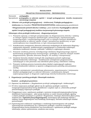 Wydział Nauk o Wychowaniu Uniwersytetu Łódzkiego REGULAMIN PRAKTYKI PEDAGOGICZNEJ – ŚRÓDROCZNEJ Kierunek: pedagogika Specjalność: pedagogika w zakresie opieki i terapii pedagogicznej (studia stacjonarne pierwszego stopnia) 1. Główne cele praktyki pedagogicznej – śródrocznej Praktyka pedagogiczna – śródroczna ma charakter PRAKTYKI DIAGNOSTYCZNEJ, realizowanej przy przedmiocie >Diagnozowanie potrzeb dziecka i rodziny<, przez studentów II pedagogiki w zakresie opieki i terapii pedagogicznej studiów stacjonarnych pierwszego stopnia. Głównym celem praktyki śródrocznej – diagnostycznej jest: 1. 1. Poznanie sytuacji, w których przeprowadza się diagnozowania dziecka i rodziny w różnych typach instytucji opiekuńczych, pomocowych, wychowawczych, terapeutycznych i socjoterapeutycznych oraz w różnych formach działalności instytucjonalnej w zakresie opieki, terapii i poradnictwa (publicznej, w tym samorządowej oraz niepublicznej, w tym stowarzyszeniowej); 1. 2. Kształtowanie umiejętności zbierania informacji niezbędnych do dokonania diagnozy – rozpoznania obszarów problemowych występujących w środowisku rodzinnym, określania możliwości rozwoju jednostki / rodziny w wybranym obszarze; 1. 3. Poznanie struktury procesu metodycznego działania diagnostycznego poprzez konfrontację przygotowania teoretycznego z praktyką w zakresie różnych modeli diagnozowania, sposobu zbierania danych, ich analizy i interperetacji; 1. 4. Ustalenie kierunku działań istotnych dla zaspokajania potrzeb wybranego dziecka/środowiska rodzinnego – kształtowanie umiejętności prognozowania zachodzących w nim procesów oraz określenie planu pracy z dzieckiem/ rodziną; 1. 5. Poznanie struktury procesu tworzenia planu działań wspierających wybrane dziecko/środowisko rodzinne w oparciu o zdiagnozowane potrzeby oraz posiadane zasoby; 1. 6. Nabycie umiejętności samodzielnego planowania, organizowania i inicjowania działań pedagogicznych w zakresie zbierania i analizowania danych wykorzystywanych w diagnozie wybranego dziecka/środowiska rodzinnego. 2. Organizacja i przebieg praktyki. Obowiązki studenta. Student – praktykant powinien: 2. 1. Zapoznać się dokładnie z „Regulaminem praktyk pedagogicznych –śródrocznych"; 2. 2. W dniu rozpoczęcia praktyki zgłosić się do opiekuna praktyki z ramienia instytucji/instytucjonalnej formy działalności i uzyskać wpis w „Dzienniku praktyk" potwierdzający rozpoczęcie praktyki; 2. 3. Przygotować wraz z opiekunem praktyk z ramienia instytucji/instytucjonalnej formy działalności harmonogram – plan pracy studenta w czasie trwania praktyki, zgodny z celami praktyki zawartymi w punkcie 1 Regulaminu. Istotnym elementem planu pracy studenta jest napisanie pracy diagnostycznej, zawierającej opis badanego dziecka i rodziny, oceny diagnostyczne oraz konkluzję zawierającą kierunki właściwych działań pomocowych; 2. 4. Systematycznie realizować wynikające z ustalonego harmonogramu cele praktyk, systematycznie kontaktować się z opiekunem praktyki z ramienia instytucji/ instytucjonalnej formy działalności oraz konsultować z opiekunem praktyki zdobyte informacje, własne spostrzeżenia, ustalenia oraz oceny; Wydział Nauk o Wychowaniu Uniwersytetu Łódzkiego 2. 5. Uczestniczyć we wszystkich formach pracy opiekuna praktyki (hospitacje), a także omówić z opiekunem praktyk prowadzone przez niego zajęcia, ich strukturę, cele oraz zastosowane metody pracy; 2. 6. Systematycznie i starannie prowadzić „Dziennik praktyk" zapisując w nim przebieg zajęć — podejmowanych działań oraz szczegółowe rozliczenie godzinowe (wraz z podsumowaniem). Po zakończeniu praktyki wyrazić opinię o jej przebiegu; 2. 8. Omówić z opiekunem praktyki przygotowaną pracę diagnostyczną dotyczącą rozpoznania – diagnozy wybranego elementu – obszaru potrzeb i problemów dziecka /środowiska rodzinnego wraz z propozycją planu pracy z dzieckiem/rodziną. 2. 9. Uzyskać od opiekuna praktyk z ramienia instytucji/instytucjonalnej formy działalności potwierdzenie przebiegu praktyki i jej zakończenia (pisemna recenzja pracy praktykanta potwierdzona podpisem opiekuna oraz pieczęcią placówki); 3. Zadania instytucji i opiekuna praktyk. 3. 1. Opiekun praktyki, wspólnie ze studentem, ustala w pierwszych dniach praktyki jej plan, zgodnie z „Regulaminem praktyki pedagogicznej – śródrocznej", zawartymi w nim celami praktyki – przedmiotem diagnozy oraz specyfiką poznawanego obszaru – środowiska rodzinnego; 3. 2. Opiekun praktyki przekazuje studentowi podstawowe informacje – ogólną charakterystykę osób/środowisk rodzinnych, a także specyfikę pracy instytucji/instytucjonalnej formy działalności oraz zakres swoich obowiązków; 3. 3. Opiekun praktyki omawia ze studentem przygotowany przez niego plan czynności diagnostycznych oraz umożliwia ich realizowanie w odniesieniu do dziecka oraz jego środowiska rodzinnego; 3. 4. Opiekun praktyki zapewnia studentowi możliwość indywidualnych konsultacji na każdym etapie realizowania praktyki – w czasie poznawania dziecka/środowiska rodzinnego: pozyskiwania informacji – zbierania materiału diagnostycznego oraz realizowania pozostałych elementów ustalonego harmonogramu – planu działań na terenie instytucji; 3. 5. Opiekun praktyki umożliwia studentowi realizowanie ustalonego harmonogramu – planu działań, zwłaszcza w sytuacjach, w których wymagana jest pomoc lub innego rodzaju działania interwencyjne; 3. 6. Opiekun pomaga studentowi w przygotowaniu diagnozy wybranego dziecka/środowiska rodzinnego; 3.7 Opiekun kierujący praktyką po jej zakończeniu omawia ze studentem osiągnięcia i trudności jakie wystąpiły podczas trwania praktyki. Omawia przygotowaną przez studenta pracę diagnostyczną dotyczącą dziecka/rodziny. Omawia realizację, ustalonego wspólnie ze studentem, harmonogramu – planu działań. Sporządza także recenzję dzi