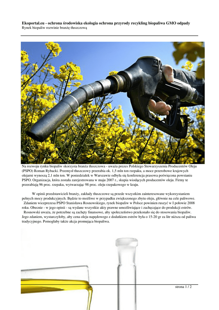 Ekoportal.eu - ochrona środowiska ekologia ochrona przyrody recykling biopaliwa GMO odpady Rynek biopaliw rozwinie branżę tłuszczową Na rozwoju rynku biopaliw skorzysta branża tłuszczowa - uważa prezes Polskiego Stowarzyszenia Producentów Oleju (PSPO) Roman Rybacki. Przemysł tłuszczowy przerabia ok. 1,5 mln ton rzepaku, a moce przerobowe krajowych olejarni wynoszą 2,1 mln ton. W poniedziałek w Warszawie odbyła się konferencja prasowa poświęcona powstaniu PSPO. Organizacja, która została zarejestrowana w maju 2007 r., skupia wiodących producentów oleju. Firmy te przerabiają 96 proc. rzepaku, wytwarzając 98 proc. oleju rzepakowego w kraju. W opinii przedstawicieli branży, zakłady tłuszczowe są przede wszystkim zainteresowane wykorzystaniem pełnych mocy produkcyjnych. Będzie to możliwe w przypadku zwiększonego zbytu oleju, głównie na cele paliwowe. Zdaniem wiceprezesa PSPO Stanisława Rosnowskiego, rynek biopaliw w Polsce powinien ruszyć w I połowie 2008 roku. Obecnie - w jego opinii - są wydane wszystkie akty prawne umożliwiające i zachęcające do produkcji estrów. Rosnowski uważa, że potrzebne są zachęty finansowe, aby społeczeństwo przekonało się do stosowania biopaliw. Jego zdaniem, wystarczyłoby, aby cena oleju napędowego z dodatkiem estrów była o 15-20 gr za litr niższa od paliwa tradycyjnego. Pomogłaby także akcja promująca biopaliwa. strona 1 / 2 Ekoportal.eu - ochrona środowiska ekologia ochrona przyrody recykling biopaliwa GMO odpady Rynek biopaliw rozwinie branżę tłuszczową Rybacki zapewnił, że przemysł jest gotowy do przerabiania większej ilości rzepaku. Według prognoz Instytutu Ekonomiki Rolnictwa i Gospodarki Żywnościowej w 2008 r. polskie olejarnie powinny przerobić na cele spożywcze i przemysłowe łącznie ok. 1,8 mln ton rzepaku, zaś w 2010 r. już prawie 2,5 mln ton. Problem jest jedynie czy rolnicy będą mogli zebrać tak duże ilości tego surowca. Według szacunkowych danych KZPR, produkcja rzepaku w 2007 r. wyniosła ok. 1,84 mln ton, a średni plon to 2,6 tony z hektara. By uzyskać zbiory na poziomie 2,5 mln ton rolnicy będą musieli zwiększyć plony tej rośliny. W Niemczech, średni plon rzepaku wynosi 3,5-3,8 t/ha. Polska zajmowała w 2006 r. 4 miejsce w UE pod względem przerobu rzepaku po Niemczech, Francji i Wielkiej Brytanii. W I połowie 2006 r. całkowite przychody branży tłuszczowej wyniosły 1,53 mld zł i były o 20 proc. wyższe niż w analogicznym okresie poprzedniego roku, zaś zysk netto wzrósł z 26 mln do 84 mln zł. Celem nowo powstałego Stowarzyszenia jest działanie na rzecz tworzenia warunków dla wzrostu konkurencyjności polskiego sektora olejowego. Dyrektor generalny PSPO Lech Kempczyński wyjaśnił, że chodzi m.in. o reprezentowanie branży na forum krajowym i europejskim, wypracowanie jednolitych standardów handlowych dla nasion rzepaku i oleju, promocję upraw rzepaku i stosowania śruty rzepakowej w żywieniu zwierząt, reprezentowania członków Stowarzyszenia w kontaktach z innymi organizacjami, a zwłaszcza z Krajowym Zrzeszeniem Producentów Rzepaku (KZPR). Stowarzyszenie zamierza także przystąpić do unijnej organizacji producentów oleju FEDiOL (Europejska Federacja Producentów Przemysłu Tłuszczowego). Takie starania zostaną podjęte już w końcu tego roku. Źródło: PAP strona 2 / 2