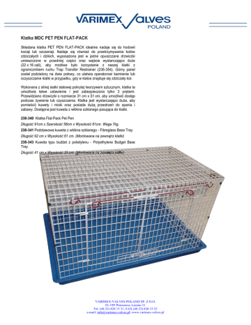 Klatka MDC PET PEN FLAT-PACK Składana klatka PET PEN FLAT-PACK idealnie nadaje się do hodowli kociąt lub szczeniąt. Nadaje się również do przetrzymywania kotów zdziczałych i dzikich, wyposażona jest w jedne opuszczane drzwiczki umieszczone w przedniej części oraz wejście wystarczająco duże (22 x 16 cali), aby możliwe było korzystanie z naszej klatki z ogranicznikiem ruchu Trap Transfer Restrainer (236-354). Górny panel został podzielony na dwie połowy, co ułatwia operatorowi karmienie lub oczyszczanie klatki w przypadku, gdy w klatce znajduje się zdziczały kot. Wykonana z silnej siatki stalowej pokrytej tworzywem sztucznym, klatka ta umożliwia łatwe ustawienie i jest zabezpieczona tylko 3 prętami. Przewidziano drzwiczki o rozmiarze 31 cm x 51 cm, aby umożliwić dostęp podczas żywienia lub czyszczenia. Klatka jest wystarczająco duża, aby pomieścić kuwety i miski oraz posiada dużą przestrzeń do spania i zabawy. Dostępna jest kuweta z włókna szklanego pasująca do klatki. 238-340 Klatka Flat-Pack Pet Pen Długość 91cm x Szerokość 58cm x Wysokość 61cm. Waga 7kg. 238-341 Podstawowa kuweta z włókna szklanego - Fibreglass Base Tray Długość 92 cm x Wysokość 61 cm. (Montowana na zewnątrz klatki) 238-343 Kuweta typu budżet z polietylenu - Polyethylene Budget Base Tray Długość 41 cm x Wysokość 25 cm. (Montowana na zewnątrz klatki) VARIMEX-VALVES POLAND SP. Z O.O. 01-199 Warszawa, Leszno 21 Tel. (48 22) 828 15 31, FAX (48 22) 828 15 32 e-mail: [email protected]; www.varimex-valves.pl