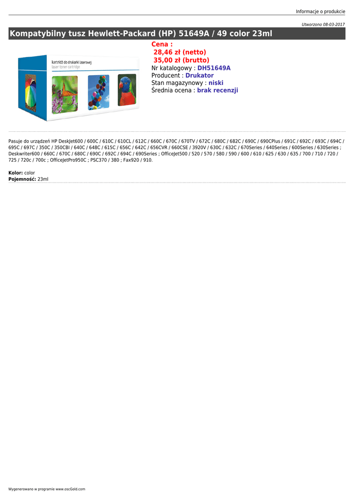 Informacje o produkcie Utworzono 08-03-2017 Kompatybilny tusz Hewlett-Packard (HP) 51649A / 49 color 23ml Cena : 28,46 zł (netto) 35,00 zł (brutto) Nr katalogowy : DH51649A Producent : Drukator Stan magazynowy : niski Średnia ocena : brak recenzji Pasuje do urządzeń HP DeskJet600 / 600C / 610C / 610CL / 612C / 660C / 670C / 670TV / 672C / 680C / 682C / 690C / 690CPlus / 691C / 692C / 693C / 694C / 695C / 697C / 350C / 350CBI / 640C / 648C / 615C / 656C / 642C / 656CVR / 660CSE / 3920V / 630C / 632C / 670Series / 640Series / 600Series / 630Series ; Deskwriter600 / 660C / 670C / 680C / 690C / 692C / 694C / 690Series ; OfficeJet500 / 520 / 570 / 580 / 590 / 600 / 610 / 625 / 630 / 635 / 700 / 710 / 720 / 725 / 720c / 700c ; OfficeJetPro950C ; PSC370 / 380 ; Fax920 / 910. Kolor: color Pojemność: 23ml Wygenerowano w programie www.oscGold.com