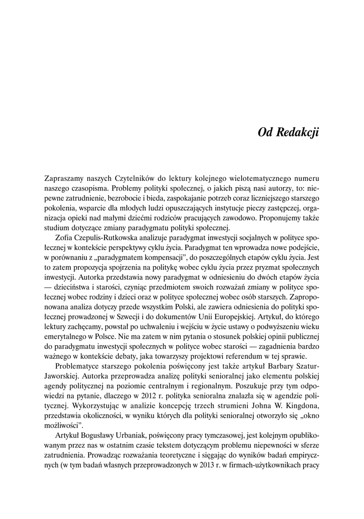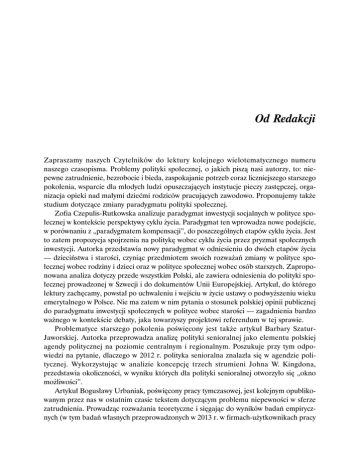Od Redakcji Zapraszamy naszych Czytelników do lektury kolejnego wielotematycznego numeru naszego czasopisma. Problemy polityki społecznej, o jakich piszą nasi autorzy, to: niepewne zatrudnienie, bezrobocie i bieda, zaspokajanie potrzeb coraz liczniejszego starszego pokolenia, wsparcie dla młodych ludzi opuszczających instytucje pieczy zastępczej, organizacja opieki nad małymi dziećmi rodziców pracujących zawodowo. Proponujemy także studium dotyczące zmiany paradygmatu polityki społecznej. Zofia Czepulis-Rutkowska analizuje paradygmat inwestycji socjalnych w polityce społecznej w kontekście perspektywy cyklu życia. Paradygmat ten wprowadza nowe podejście, w porównaniu z „paradygmatem kompensacji”, do poszczególnych etapów cyklu życia. Jest to zatem propozycja spojrzenia na politykę wobec cyklu życia przez pryzmat społecznych inwestycji. Autorka przedstawia nowy paradygmat w odniesieniu do dwóch etapów życia — dzieciństwa i starości, czyniąc przedmiotem swoich rozważań zmiany w polityce społecznej wobec rodziny i dzieci oraz w polityce społecznej wobec osób starszych. Zaproponowana analiza dotyczy przede wszystkim Polski, ale zawiera odniesienia do polityki społecznej prowadzonej w Szwecji i do dokumentów Unii Europejskiej. Artykuł, do którego lektury zachęcamy, powstał po uchwaleniu i wejściu w życie ustawy o podwyższeniu wieku emerytalnego w Polsce. Nie ma zatem w nim pytania o stosunek polskiej opinii publicznej do paradygmatu inwestycji społecznych w polityce wobec starości — zagadnienia bardzo ważnego w kontekście debaty, jaka towarzyszy projektowi referendum w tej sprawie. Problematyce starszego pokolenia poświęcony jest także artykuł Barbary SzaturJaworskiej. Autorka przeprowadza analizę polityki senioralnej jako elementu polskiej agendy politycznej na poziomie centralnym i regionalnym. Poszukuje przy tym odpowiedzi na pytanie, dlaczego w 2012 r. polityka senioralna znalazła się w agendzie politycznej. Wykorzystując w analizie koncepcję trzech strumieni Johna W. Kingdona, przedstawia okoliczności, w wyniku których dla polityki senioralnej otworzyło się „okno możliwości”. Artykuł Bogusławy Urbaniak, poświęcony pracy tymczasowej, jest kolejnym opublikowanym przez nas w ostatnim czasie tekstem dotyczącym problemu niepewności w sferze zatrudnienia. Prowadząc rozważania teoretyczne i sięgając do wyników badań empirycznych (w tym badań własnych przeprowadzonych w 2013 r. w firmach-użytkownikach pracy 10 Od Redakcji tymczasowej z terenu Łodzi), autorka pokazuje, że pracy tymczasowej, pomimo jej niepewności i nietrwałości, towarzyszy nadzieja pracowników na poprawę swojej sytuacji. Z badań wynika, że pracownicy tymczasowi akceptują tę niepewność w przekonaniu, że praca tymczasowa zwiększa szanse na trwałe zatrudnienie i rozwój kompetencji. Okazuje się jednak, że oczekiwania te są złudne, a praca tymczasowa coraz częściej ulega petryfikacji. Subiektywnym wymiarem problemu społecznego zajmuje się także Kamil Kruszyński. Autor przedstawia wyniki badań terenowych (w formie wywiadów fokusowych) przeprowadzonych na terenie województwa łódzkiego. Ich celem było rozpoznanie, w jaki sposób przedstawiciele władz lokalnych — a więc osoby bardzo ważne w instytucjonalnej strukturze polityki społecznej — postrzegają problemy społeczne, a zwłaszcza bezrobocie i ubóstwo. Badania wykazały, że lokalni decydenci najczęściej reprezentują podejście określane w literaturze jako „oskarżanie ofiar”, chociaż dostrzegają też, że przyczyną bezrobocia i biedy jest mały popyt na pracę na lokalnych rynkach pracy. Artykuł zawiera także analizę opinii respondentów na temat projektów aktywizujących finansowanych przez Program Operacyjny Kapitał Ludzki (POKL). Mamy zatem możliwość przyjrzenia się, jak w skali lokalnej postrzegana jest polityka społeczna realizowana zgodnie z niektórymi założeniami paradygmatu inwestycji społecznych. Anna Kurowska także analizuje w swoim artykule lokalną politykę społeczną, ale dotyczącą organizacji opieki nad dziećmi do lat 3. W 2011 r. została uchwalona tzw. ustawa żłobkowa, a jej celem było ułatwienie rozwoju różnych form opieki nad najmłodszymi dziećmi, których rodzice potrzebują pozarodzinnego wsparcia w opiece nad nimi. Do zadań własnych gminy należy „zaspokajanie zbiorowych potrzeb wspólnoty”, w czym mieści się organizowanie instytucjonalnej opieki nad dziećmi. Autorka artykułu analizuje, na podstawie zastanych danych statystycznych, formalny dostęp do takiej opieki w polskich gminach, wykorzystując przy tym zaproponowane przez siebie wskaźniki dotyczące tego obszaru polityki społecznej. Artykuł zawiera zatem zarówno propozycje metodologiczne, jak i wnioski z zakresu ewaluacji polityki społecznej. Agnieszka Golczyńska-Grondas poświęciła swój artykuł pieczy zastępczej, a dokładnie rzecz biorąc — procesowi usamodzielniania wychowanków placówek opiekuńczowychowawczych. Okres usamodzielnienia wychowanków łódzkich i podłódzkich placówek „dawnego systemu” omawiany jest poprzez odwołanie się do koncepcji trzech kulturowych tranzycji w dorosłość. Są to: 1) przejście z systemu szkolnego na rynek pracy (school-towork transition), 2) osiągnięcie niezależności od rodziny i rozpoczęcie formowania rodziny prokreacji (domestic transition), 3) opuszczenie domu rodzinnego i uzyskanie odrębnego miejsca zamieszkania (housing transition). Autorka omawia także wybrane innowacyjne praktyki stosowane wobec osób usamodzielniających się. Zachęcamy również do zapoznania się z recenzją książki, której autorka dokonała analizy prezentacji kwestii społecznych w polskich serialach telewizyjnych i odbioru tych treści. Czy i w jakim stopniu jest to próba udana, ocenia na naszych łamach Magdalena Rek-Woźniak. Publikowane przez nas artykuły mówią, jak si