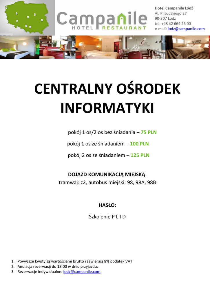 Hotel Campanile Łódź Al. Piłsudskiego 27 90-307 Łódź tel. +48 42 664 26 00 e-mail: [email protected] CENTRALNY OŚRODEK INFORMATYKI pokój 1 os/2 os bez śniadania – 75 PLN pokój 1 os ze śniadaniem – 100 PLN pokój 2 os ze śniadaniem – 125 PLN DOJAZD KOMUNIKACJĄ MIEJSKĄ: tramwaj: z2, autobus miejski: 98, 98A, 98B HASŁO: Szkolenie P L I D 1. Powyższe kwoty są wartościami brutto i zawierają 8% podatek VAT 2. Anulacja rezerwacji do 18:00 w dniu przyjazdu. 3. Rezerwacje indywidualne: [email protected],