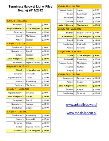 Terminarz Halowej Ligi w Piłce Nożnej 2011/2012 Kolejka VI – 15.01.2012 Pogórze Husów - Antico Calcio - Kanonierzy Kolejka I - 20.11.2011 Zwierzaki - Calcio g.9.00 Pogórze Husów - Arka Albigowa g.10.00 Tawerna - Kanonierzy g.11.00 Bispol - Manhattan g.12.00 Antico - Śrubres g.13.00 Kolejka II – 4.12.2011 Manhattan - Antico g.9.00 Kanonierzy - Bispol g.10.00 Calcio - Śrubres Arka Albigowa - Tawerna g.11.00 g.12.00 Zwierzaki - Pogórze Husów g.13.00 Kolejka III – 11.12.2011 Bispol - Arka Albigowa g.9.00 Tawerna - Zwierzaki Pogórze Husów - Calcio Antico - Kanonierzy Śrubres - Manhattan g.10.00 g.11.00 g.12.00 g.13.00 Kolejka IV – 18.12.2011 Pogórze Husów - Tawerna g.9.00 Arka Albigowa - Antico g.10.00 Zwierzaki - Bispol g.11.00 Kanonierzy - Śrubres g.12.00 Manhattan - Calcio g.13.00 Kolejka V – 7.01.2012 Manhattan - Kanonierzy Antico - Zwierzaki Tawerna - Calcio g.16.00 g.17.00 g.18.00 Bispol - Pogórze Husów g.19.00 Śrubres - Arka Albigowa g.20.00 g.9.00 g.10.00 Zwierzaki - Śrubres g.11.00 Tawerna - Bispol g.12.00 Arka Albigowa - Manhattan g.13.00 Kolejka VII – 22.01.2012 Śrubres - Pogórze Husów g.9.00 Kanonierzy - Arka Albigowa g.10.00 Bispol - Calcio g.11.00 Manhattan - Zwierzaki g.12.00 Antico - Tawerna g.13.00 Kolejka VIII – 5.02.2012 Calcio - Arka Albigowa g.9.00 Zwierzaki - Kanonierzy Pogórze Husów - Manhattan g.10.00 g.11.00 Tawerna - Śrubres g.12.00 Bispol - Antico g.13.00 Kolejka IX – 11.02.2011 Kanonierzy - Pogórze Husów g.14.00 Antico - Calcio Arka Albigowa - Zwierzaki g.15.00 g.16.00 Śrubres - Bispol g.17.00 Manhattan - Tawerna g.18.00 www.arkaalbigowa.pl www.mosir-lancut.pl