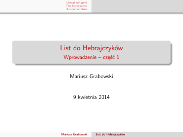 Uwagi wstępne Tło historyczne Autorstwo listu List do Hebrajczyków Wprowadzenie – część 1 Mariusz Grabowski 9 kwietnia 2014 Mariusz Grabowski List do Hebrajczyków Uwagi wstępne Tło historyczne Autorstwo listu Cel wykładu 1 Określić tło historyczne listu 2 Zapoznać z problematyką autorstwa listu Mariusz Grabowski List do Hebrajczyków Uwagi wstępne Tło historyczne Autorstwo listu Uwagi wstępne Najbardziej kontrowersyjny spośród wszystkich ksiąg biblijnych Nowego Testamentu (obok Ewangelii św. Jana, Listu św. Jakuba, Listu św. Judy, Drugiego Listu św. Piotra i Objawienia św. Jana). Nie ma powszechnej zgodności odnośnie do: autorstwa czasu i miejsca powstania adresata a nawet ... rodzaju literackiego księgi Mariusz Grabowski List do Hebrajczyków Uwagi wstępne Tło historyczne Autorstwo listu Uwagi wstępne Doniosłość Listu Wymienione problemy w niczym nie umniejszają mocy duchowej i doskonałości intelektualnej listu List do Hebrajczyków , podobnie jak Ewangelia św. Jana, lecz w sposób bardziej zwięzły i skondensowany maluje obraz Chrystusa jako Boga, Króla i Arcykapłana Mariusz Grabowski List do Hebrajczyków Uwagi wstępne Tło historyczne Autorstwo listu Tło historyczne 1 Kor. 1, 20–25 (BW) Gdzie jest mądry? Gdzie uczony? Gdzie badacz wieku tego? Czyż Bóg nie obrócił w głupstwo mądrości świata? Skoro bowiem świat przez mądrość swoją nie poznał Boga w jego Bożej mądrości, przeto upodobało się Bogu zbawić wierzących przez głupie zwiastowanie. Podczas gdy Żydzi znaków się domagają, a Grecy mądrości poszukują, My zwiastujemy Chrystusa ukrzyżowanego, dla Żydów wprawdzie zgorszenie, a dla pogan głupstwo, Natomiast dla powołanych - i Żydów, i Greków, zwiastujemy Chrystusa, który jest mocą Bożą i mądrością Bożą. Bo głupstwo Boże jest mędrsze niż ludzie, a słabość Boża mocniejsza niż ludzie. Mariusz Grabowski List do Hebrajczyków Uwagi wstępne Tło historyczne Autorstwo listu Nurty wypaczające chrześcijaństwo Już w czasach współczesnych apostołom zarysowały się dwa nurty zagrażające rozwojowi chrześcijaństwa: Filozoficzny (przede wszystkim gnostycyzm) mający swe źródło w filozofii greckiej Religijny (oparty na zakonie) czerpiący obficie z judaizmu Apostoł Paweł wyraźnie dostrzegał te zagrożenia Problem gnostycyzmu poruszał m.in. w Liście do Kolosan, (również Ap. Jan w swym 1 Liście) Z drugim zagrożeniem walczył przede wszystkim w Liście do Galacjan oraz Listach do Rzymian i 1 i 2 do Koryntian Wymienione nurty zasadniczo istnieją do dzisiaj Mariusz Grabowski List do Hebrajczyków Uwagi wstępne Tło historyczne Autorstwo listu Tło historyczne 1 Kol. 2,20–23 (EIB) Skoro z Chrystusem umarliście dla zasad rządzących światem, to dlaczego — tak, jak żyjący w tym świecie — dobrowolnie poddajecie się nakazom: Nie dotykaj, nie próbuj, nie ruszaj? Te przepisy i nauki ludzkie dotyczą tego, co i tak przeznaczone do zużycia. Jest w nich tyle mądrości, ile może być w dewocji, poniżaniu się i umartwianiu ciała, jednak poza poprawianiem samopoczucia nie mają one żadnej wartości. Mariusz Grabowski List do Hebrajczyków Uwagi wstępne Tło historyczne Autorstwo listu Nurty wypaczające chrześcijaństwo Konflikt pomiędzy Żydami a poganami oraz pomiędzy judeizującymi a pogańskimi chrześcijanami we wczesnym Kościele jest opisany w Dz. 5,34–39; Rz. 9,3; Dz. 28,28; Dz. 11,1–18 Żydzi widząc, że chrześcijanie rosną w liczbie używają wielu argumentów aby odwieść swych braci od wiary w Chrystusa Żydzi próbowali wykazywać doskonałość zakonu Mojżesza Mariusz Grabowski List do Hebrajczyków Uwagi wstępne Tło historyczne Autorstwo listu Inne zagrożenia chrześcijaństwa Prześladowania chrześcijan Z jednej strony umacniały wiarę, z drugiej powodowały jej osłabienie List do Hebrajczyków jest pisany najprawdopodobniej w czasie prześladowań Nerona Te prześladowania jednak nie miały tak powszechnego charakteru jak za czasów Decjusza (250), Waleriana (257) i Dioklecjana (303-304) Oziębnięcie wiary wśród członków wspólnoty – Hbr. 10,25 Mariusz Grabowski List do Hebrajczyków Uwagi wstępne Tło historyczne Autorstwo listu Autorastwo listu Brak zgodności co do autorstwa Listu do Hebrajczyków istniała już we wczesnym Kościele List do Hebrajczyków nie zawiera jak inne księgi a zwłaszcza listy Nowego Testamentu imienia autora w pierwszych wersach księgi Również styl księgi odbiega nieco od pism nowotestamentowych. Odmienności języka (znacznie bliższego klasycznej niż grece koine) – niektórzy tłumaczą to faktem, że List do Hebrajczyków został napisany pierwotnie po hebrajsku a później przetłumaczony na grecki Pogląd taki utrzymywali Klemens Aleksandryjski i Orygenes Jednak Orygenes, cytowany przez Euzebiusza, stwierdza: Kto naprawdę napisał List do Hebrajczyków wie jedynie sam Bóg Mariusz Grabowski List do Hebrajczyków Uwagi wstępne Tło historyczne Autorstwo listu Autorastwo listu Euzebiusz również uważał, że List do Hebrajczyków został napisany początkowo po hebrajsku niekoniecznie przez Pawła, a następnie przetłumaczony przez Klemensa Rzymskiego na grecki Hipolit negował Pawłowe autorstwo listu Kanon Muratoriego nie wymieniał listu Tertulian w Afryce Północnej nie wiedział nic o liście Pawła do Hebrajczyków, ale mówił o liście Barnaby do Hebrajczyków W czasach renesansu wątpliwości co do listu rościł Erazm z Rotterdamu, Luter odmawiając natchnienia przypisywał go Apollosowi. Kalwin również odmawiał autorstwa św. Pawłowi W czasach współczesnych sugerowano, że autorem listu mogła być Pryscylla, ale czasownik „opisującemu” występujący w rodzaju męskim w Hbr. 11,32, sprzeciwia się tej teorii Mariusz Grabowski List do Hebrajczyków Uwagi wstępne Tło historyczne Autorstwo listu Pawłowe autorstwo listu Tradycja przypisuje je Ap. Pawłowi, jedn