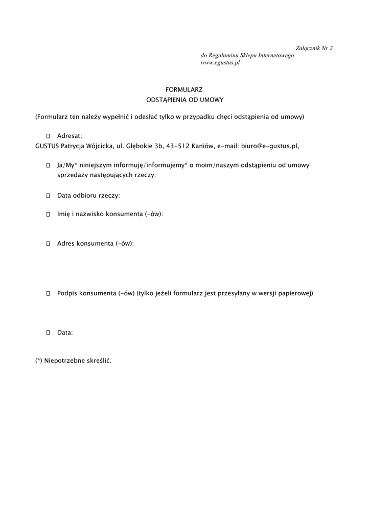 Załącznik Nr 2 do Regulaminu Sklepu Internetowego www.egustus.pl FORMULARZ ODSTĄPIENIA OD UMOWY (Formularz ten należy wypełnić i odesłać tylko w przypadku chęci odstąpienia od umowy) Adresat: GUSTUS Patrycja Wójcicka, ul. Głębokie 3b, 43-512 Kaniów, e-mail: [email protected], Ja/My* niniejszym informuję/informujemy* o moim/naszym odstąpieniu od umowy sprzedaży następujących rzeczy: Data odbioru rzeczy: Imię i nazwisko konsumenta (-ów): Adres konsumenta (-ów): Podpis konsumenta (-ów) (tylko jeżeli formularz jest przesyłany w wersji papierowej) Data: (*) Niepotrzebne skreślić.